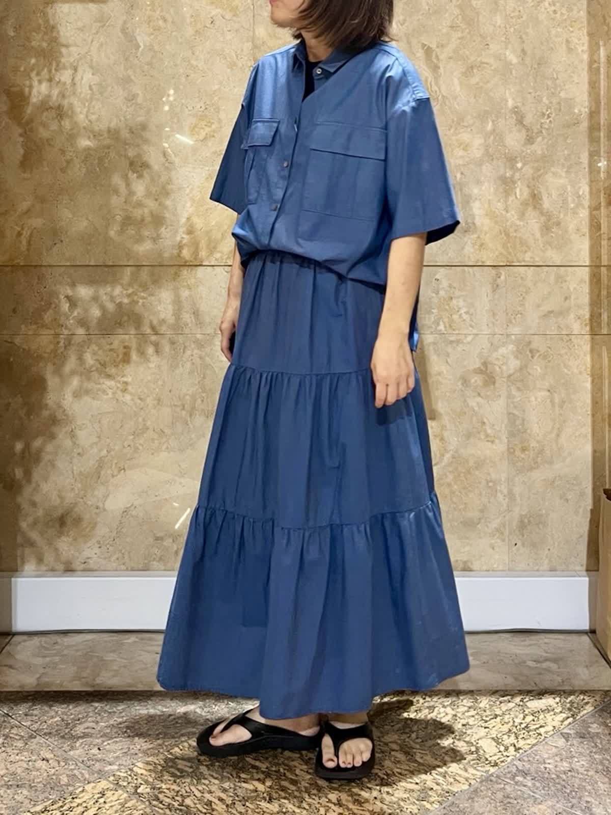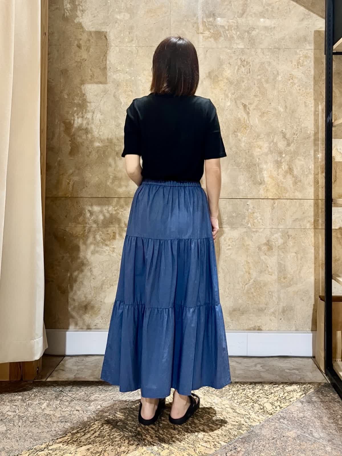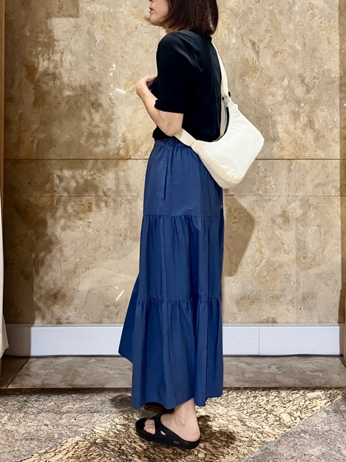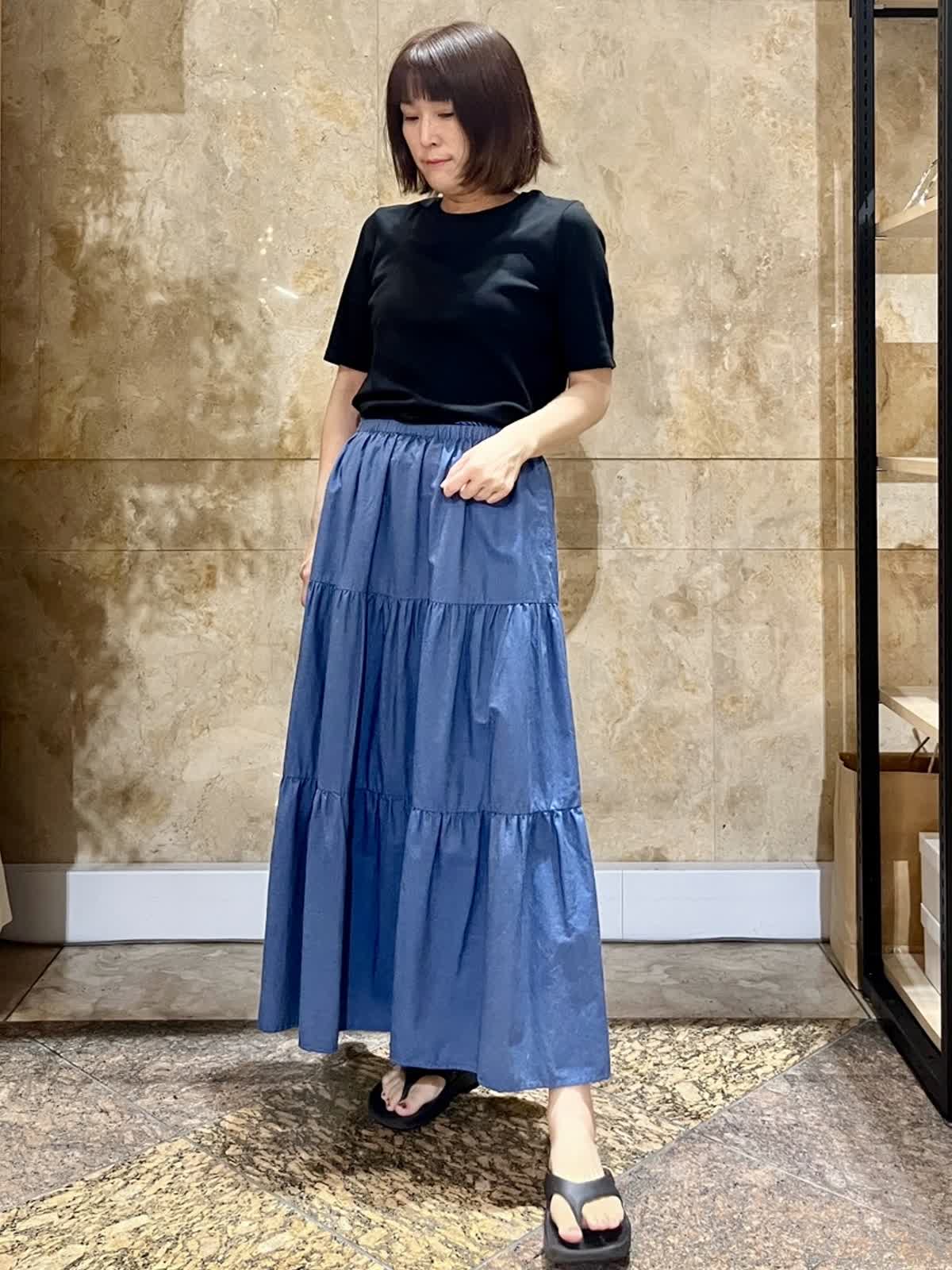 【着用サイズ/カラー】 Tシャツ:11号/ブラック スカート:フリーサイズ/サックス デニムシャツ:フリーサイズ/サックス シンプルなTシャツ×ティアードデニムのカジュアルお出かけスタイル。半袖は長めなので二の腕がしっかり隠れる安心袖。スビンシリーズは形が沢山あるので型違い、色違いで持っておくと便利です◎
