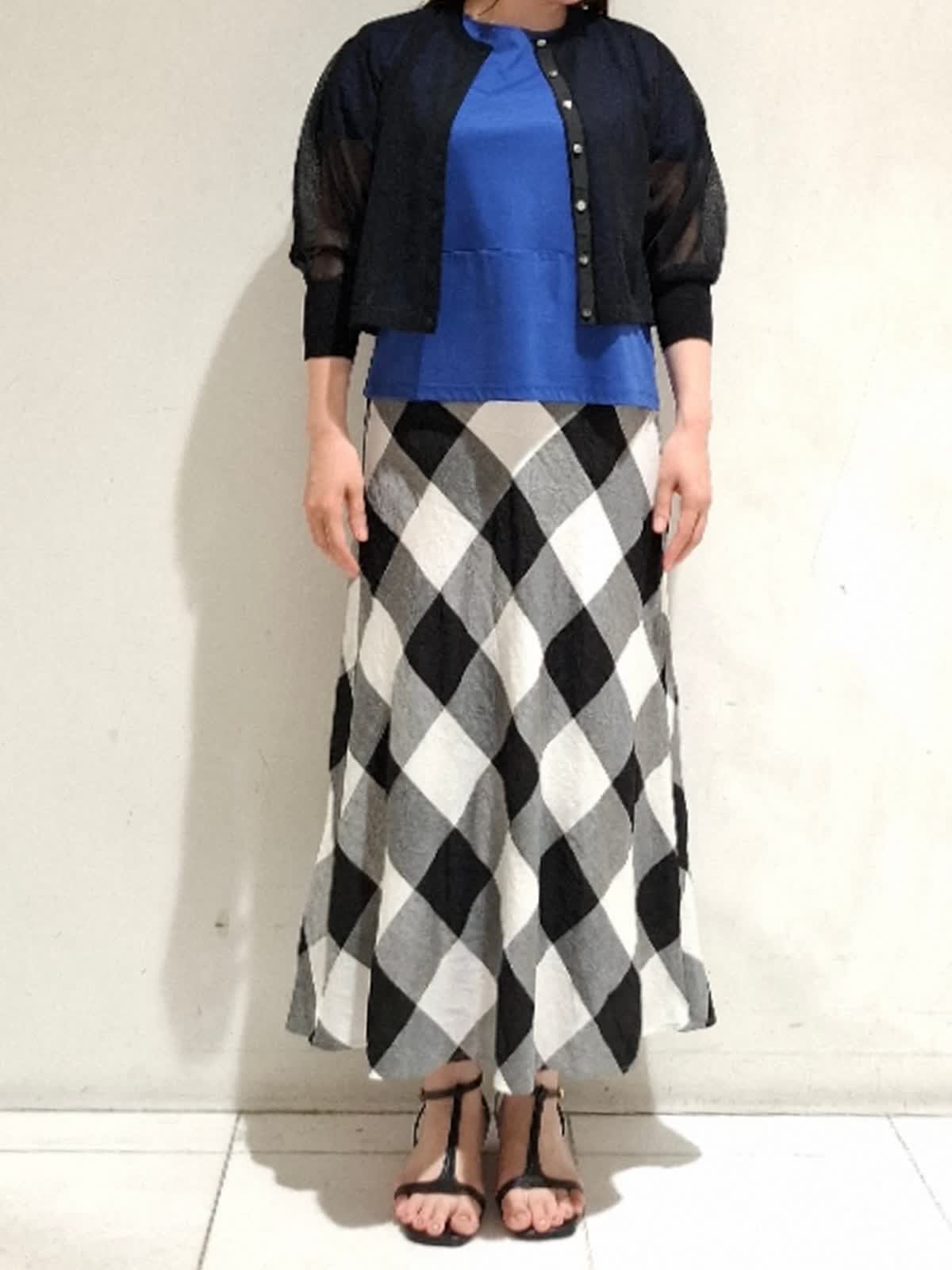 【着用サイズ】カーディガン:9号サイズ ブラック カットソー:フリーサイズ ブルー スカート:9号サイズ ブラック カットソーは、ウエスト切り替えのデザインですっきりと見え、脇見頃つきで動いた時に肌が見えず安心です。ひんやりとした涼しい着心地です。 適度な透け感のあるカーディガンは、やや短めの着丈のため合わせやすく着まわしが効きます。柄物のスカートは、コーディネートのポイントになるのでおすすめです。