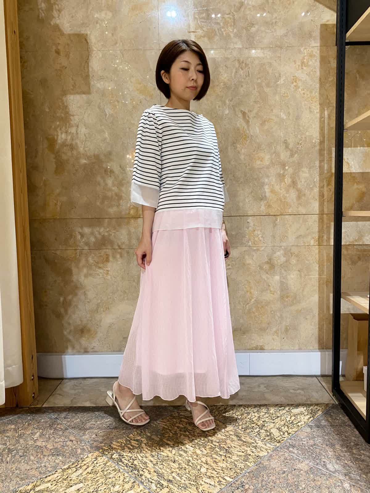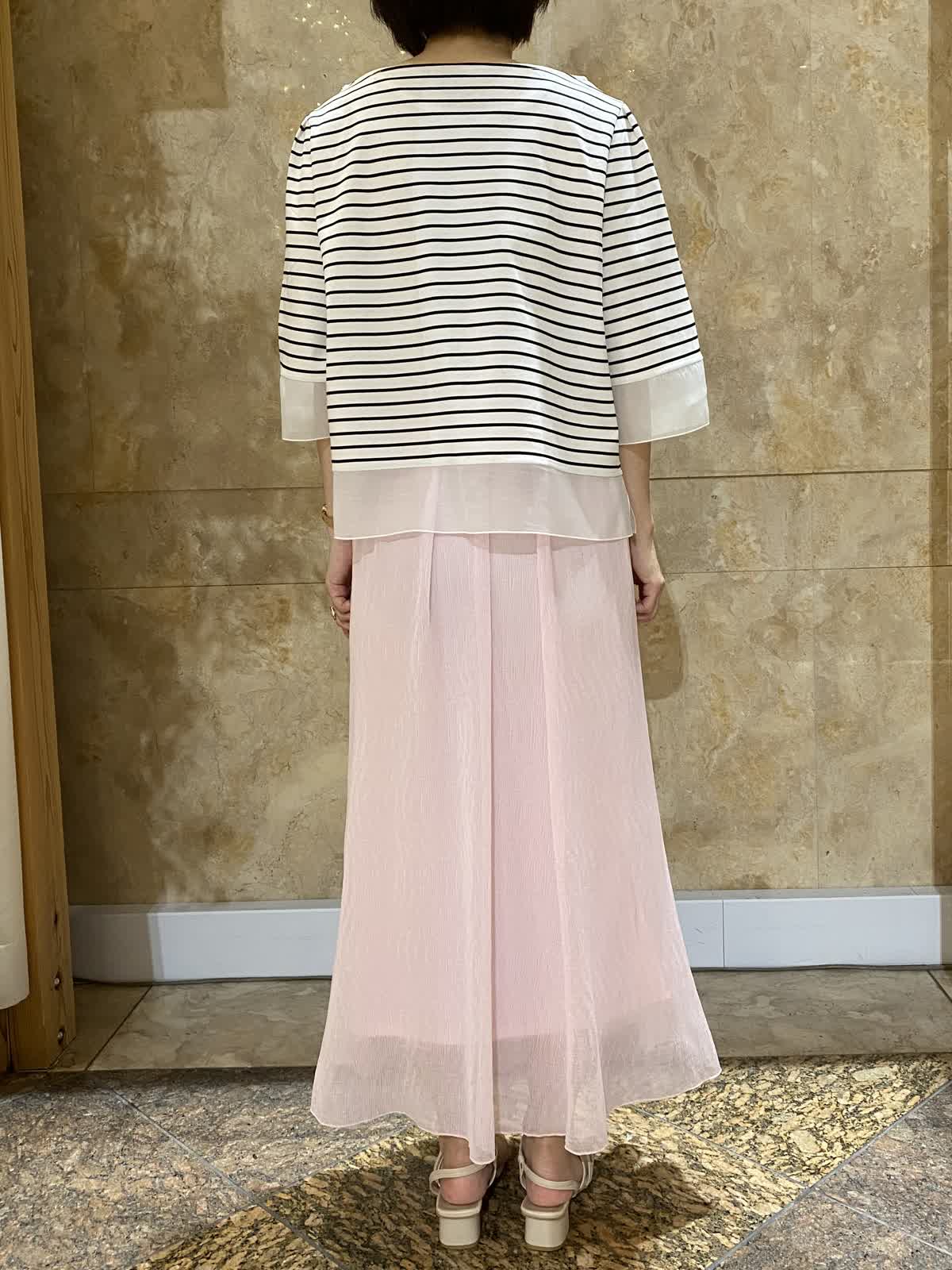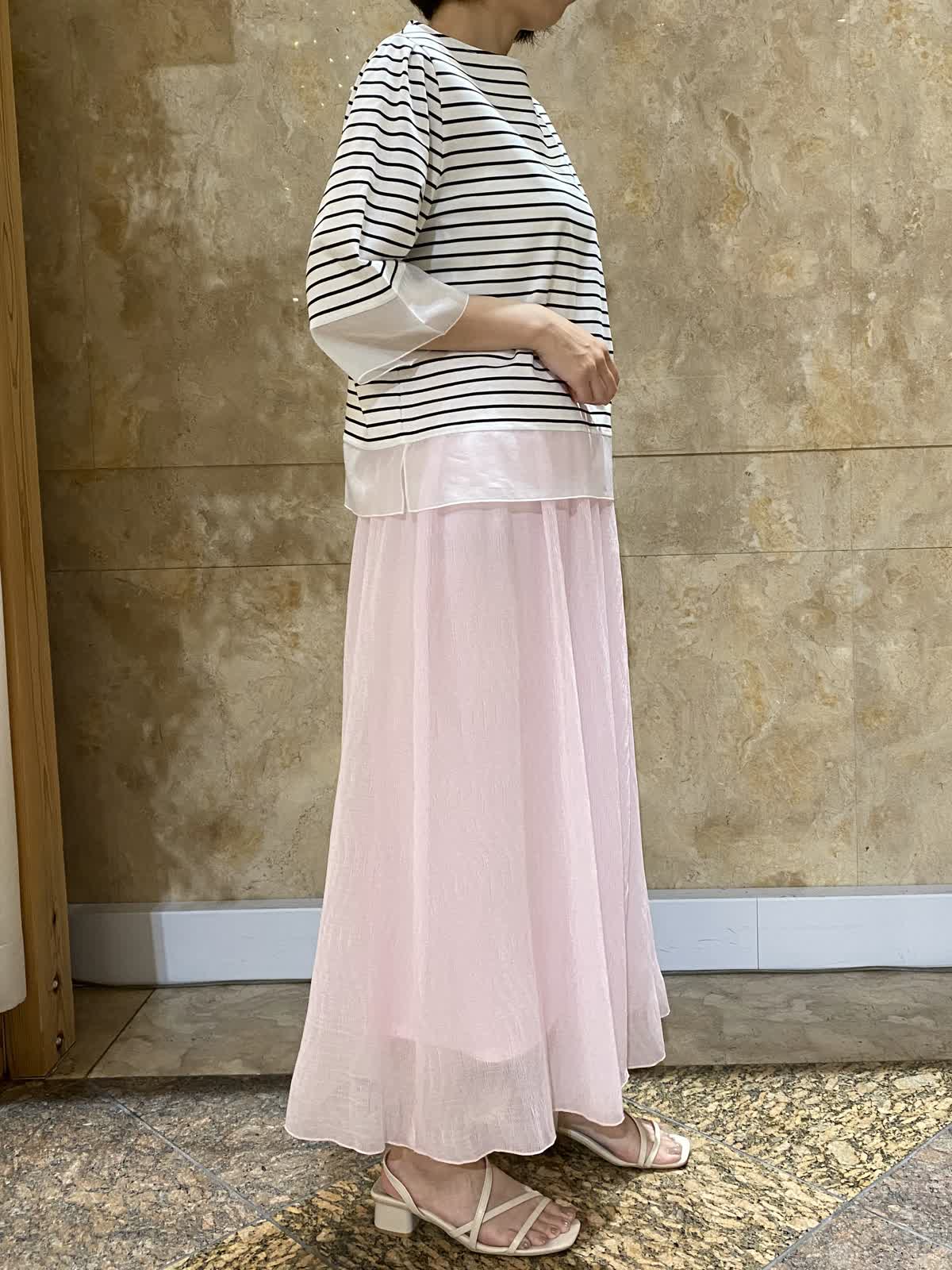【着用サイズ/カラー】 カットソー:フリーサイズ/ボーダー スカート:フリーサイズ/ピンク 甘めなピンクをボーダーと合わせてカジュアルに。トップスは裾に透けがあるので、ちょうどいい丈感。スカートにもパンツにも合わせやすいです。スカートはボリューム抑えめでストンと落ちる、スッキリしたシルエット。見た目も涼しげです。