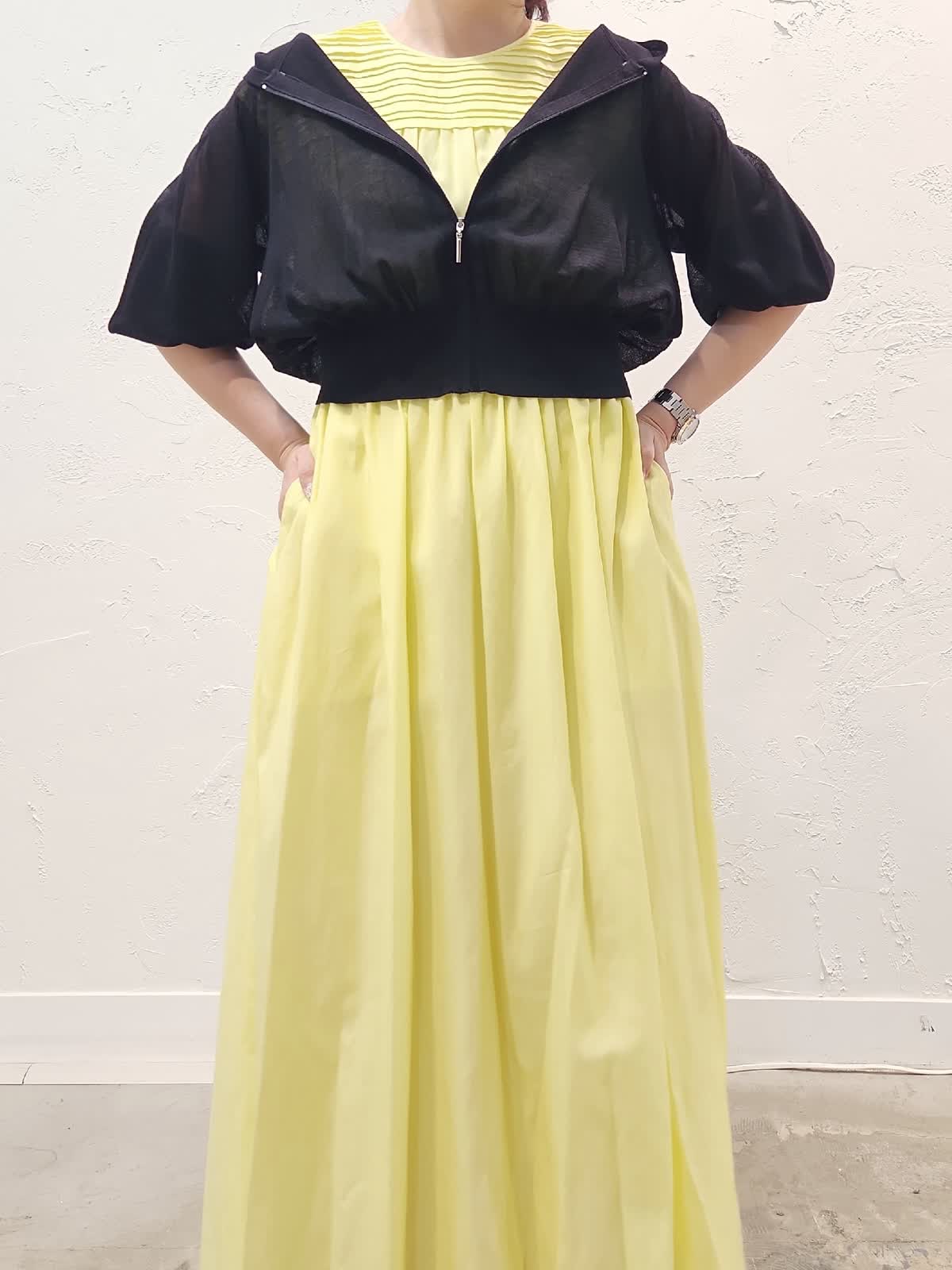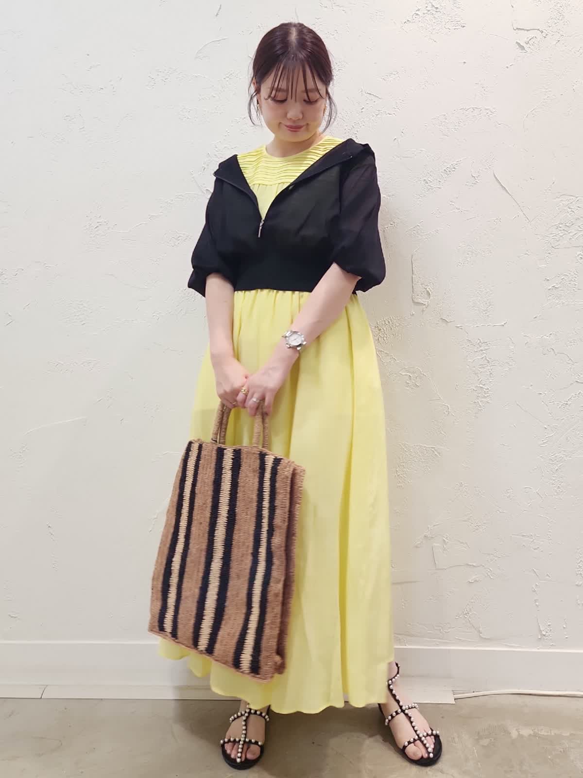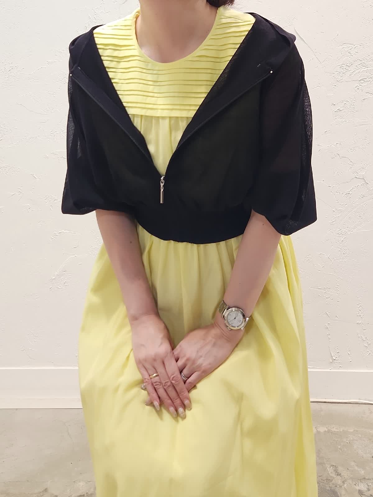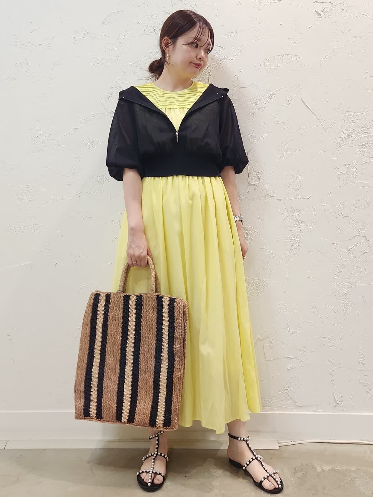 【着用サイズ】ワンピース:9号/イエロー パーカー:9号/ブラック 接触冷感素材の夏にぴったりのワンピースコーデ。レモンイエローにブラックパーカーを合わせました。シアー素材なので重くなり過ぎないのがポイント。ウエストゴムでゆとりがあるので暑い夏でも窮屈感なく快適な着心地でオススメ。