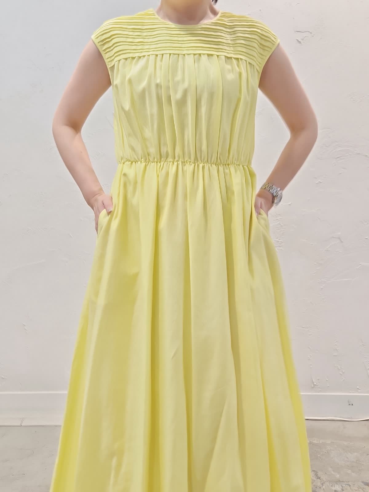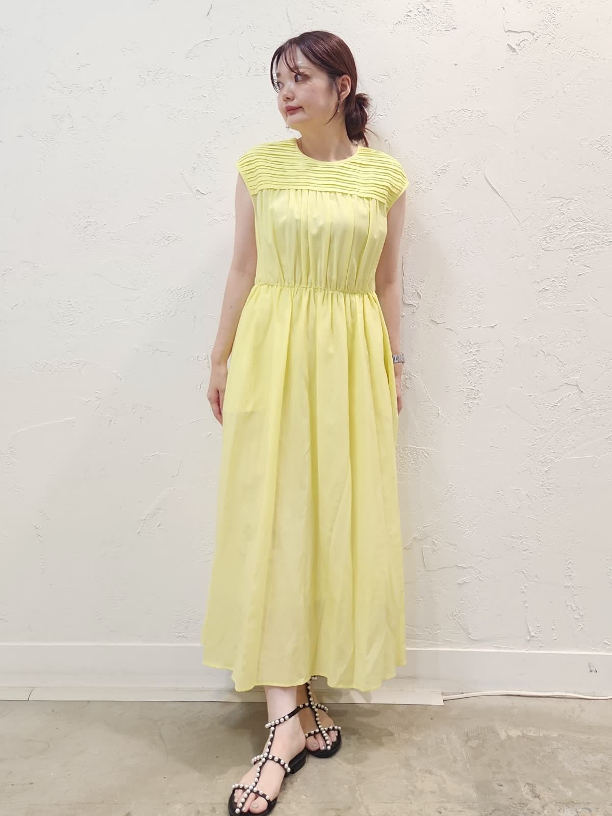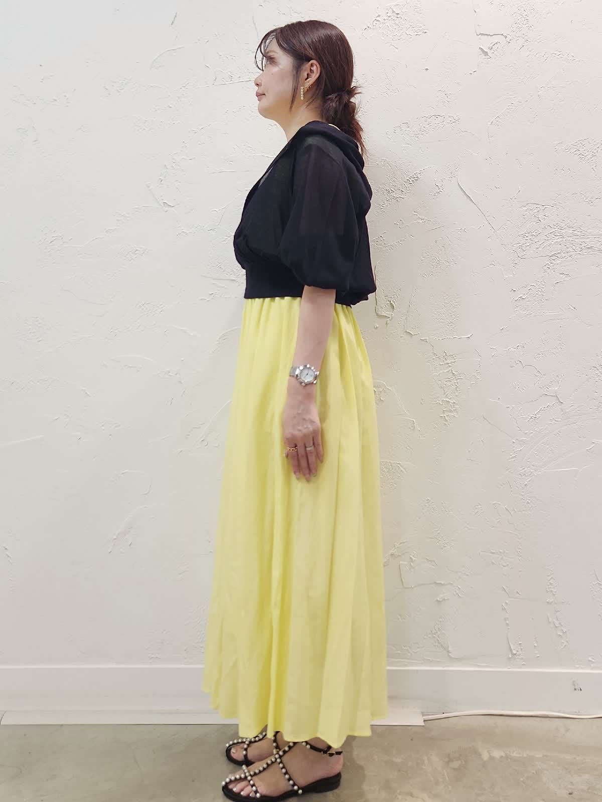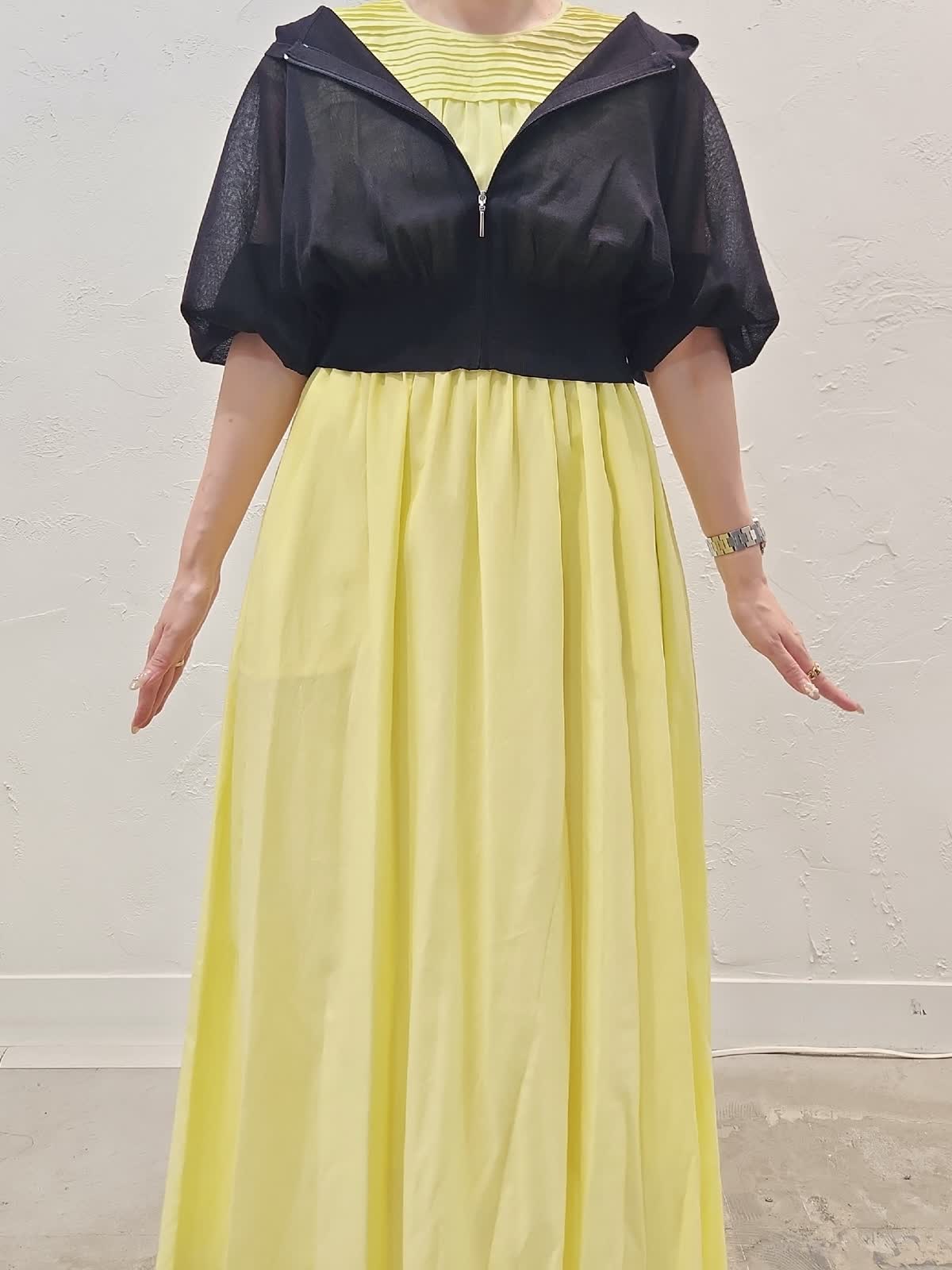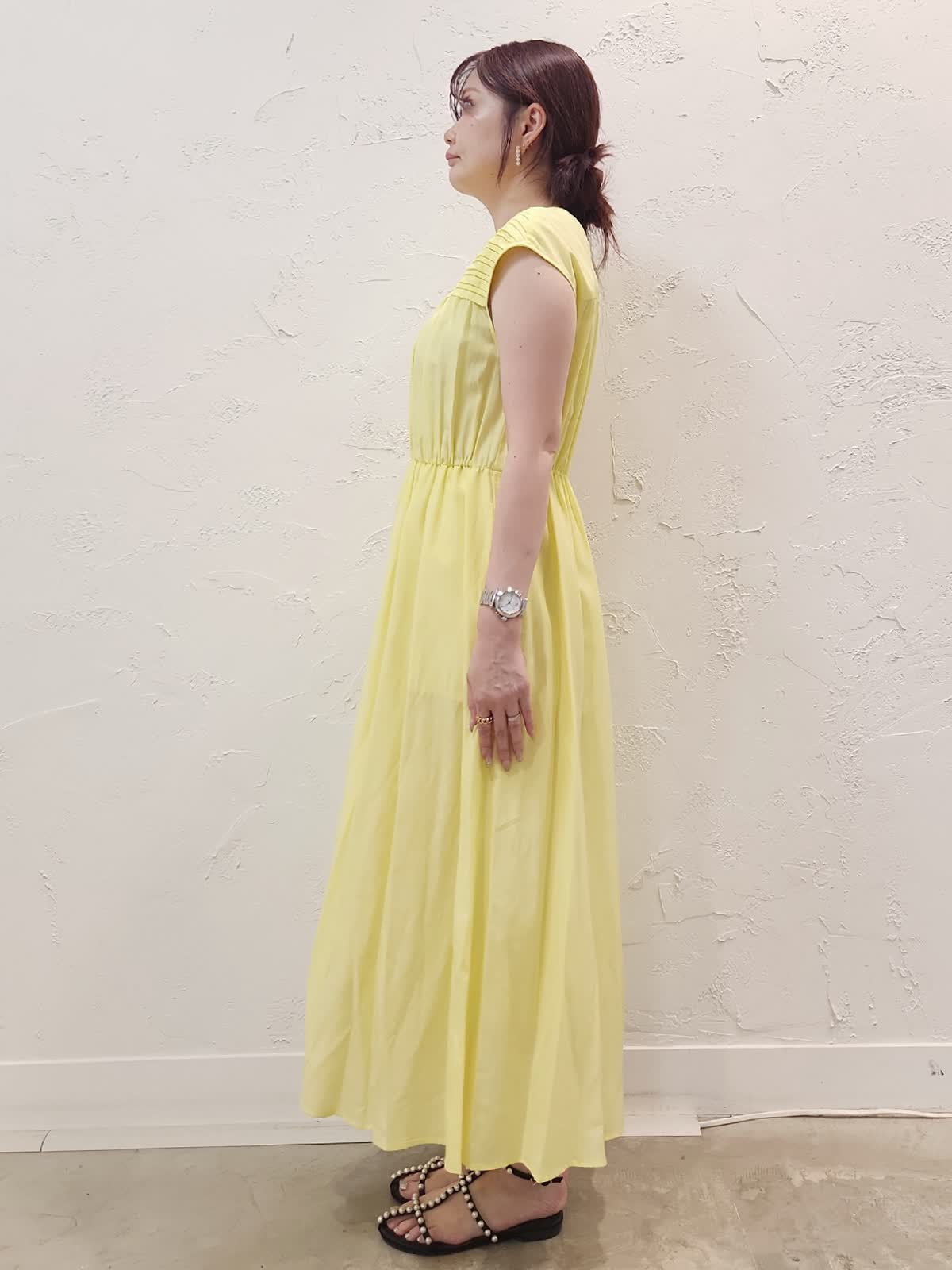 【着用サイズ】ワンピース:9号/イエロー パーカー:9号/ブラック 接触冷感素材の夏にぴったりのワンピースコーデ。レモンイエローにブラックパーカーを合わせました。シアー素材なので重くなり過ぎないのがポイント。ウエストゴムでゆとりがあるので暑い夏でも窮屈感なく快適な着心地でオススメ。