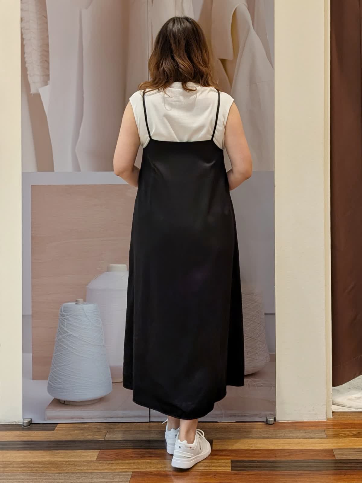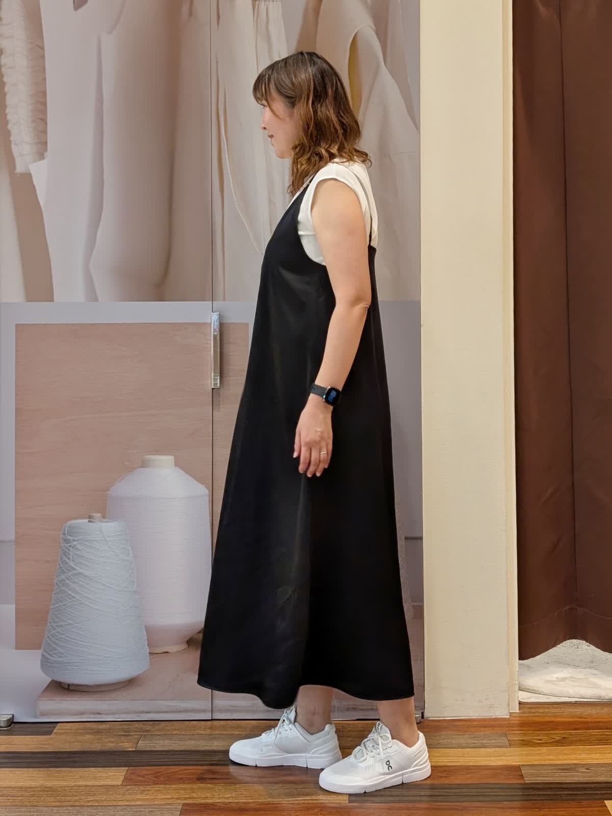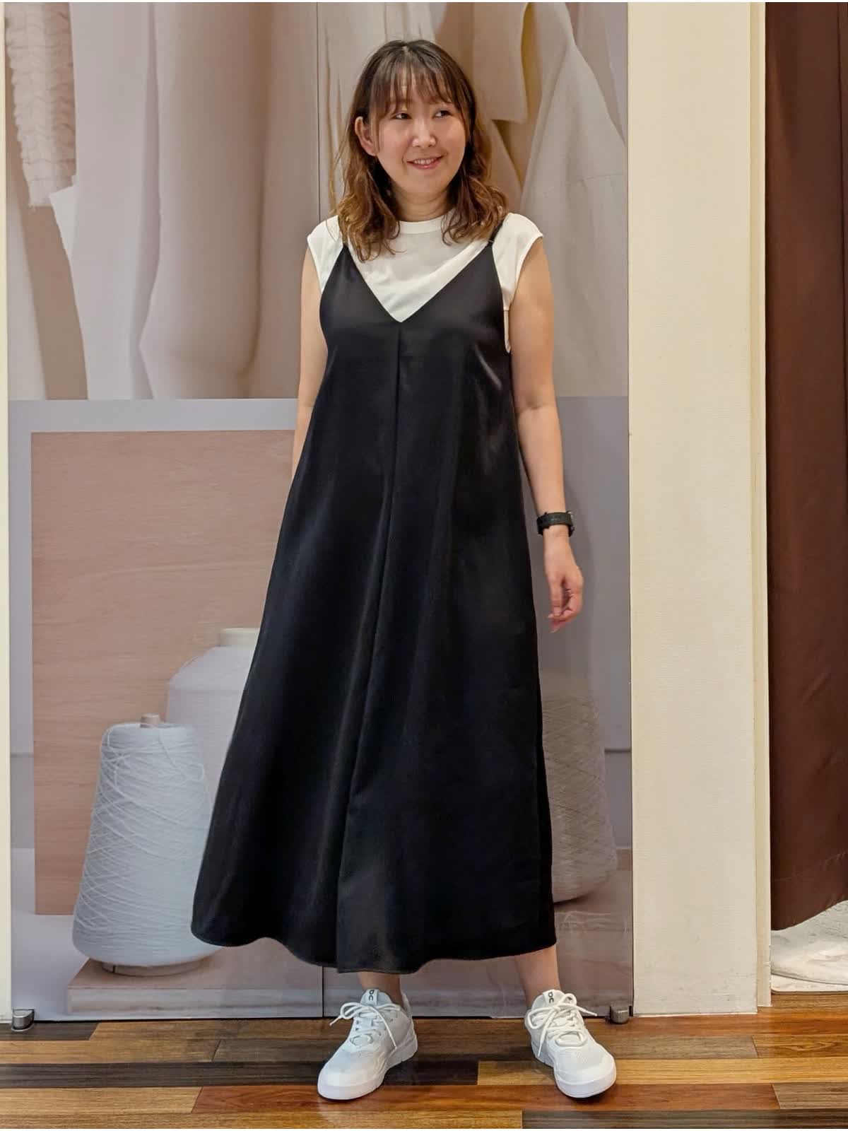 【着用サイズ】ワンピース、カットソー:9号 スニーカー:24.0cm【着用カラー】ワンピース:ブラック カットソー:ホワイト スニーカー:オフホワイト 休日のお出掛けコーディネートです。キャミワンピースはシーズンレスで長く着られます。インナー次第で雰囲気を変えられるので、いろいろな着こなしを楽しめます!今回はフレンチスリーブのカットソーと足元はスニーカーを合わせて、スポーティーカジュアルにまとめました。サテン地で上品な光沢感がある生地なので、ブラウスを合わせて綺麗めな着こなしもオススメです。秋冬はニットを重ねて着ていただけるので、1着あると重宝します。