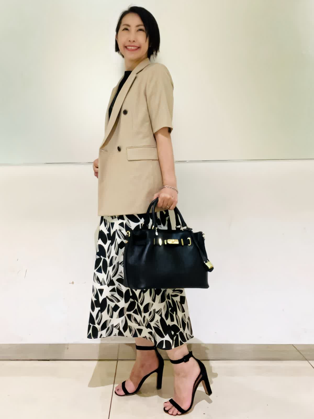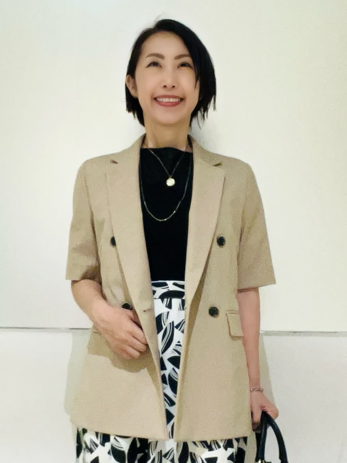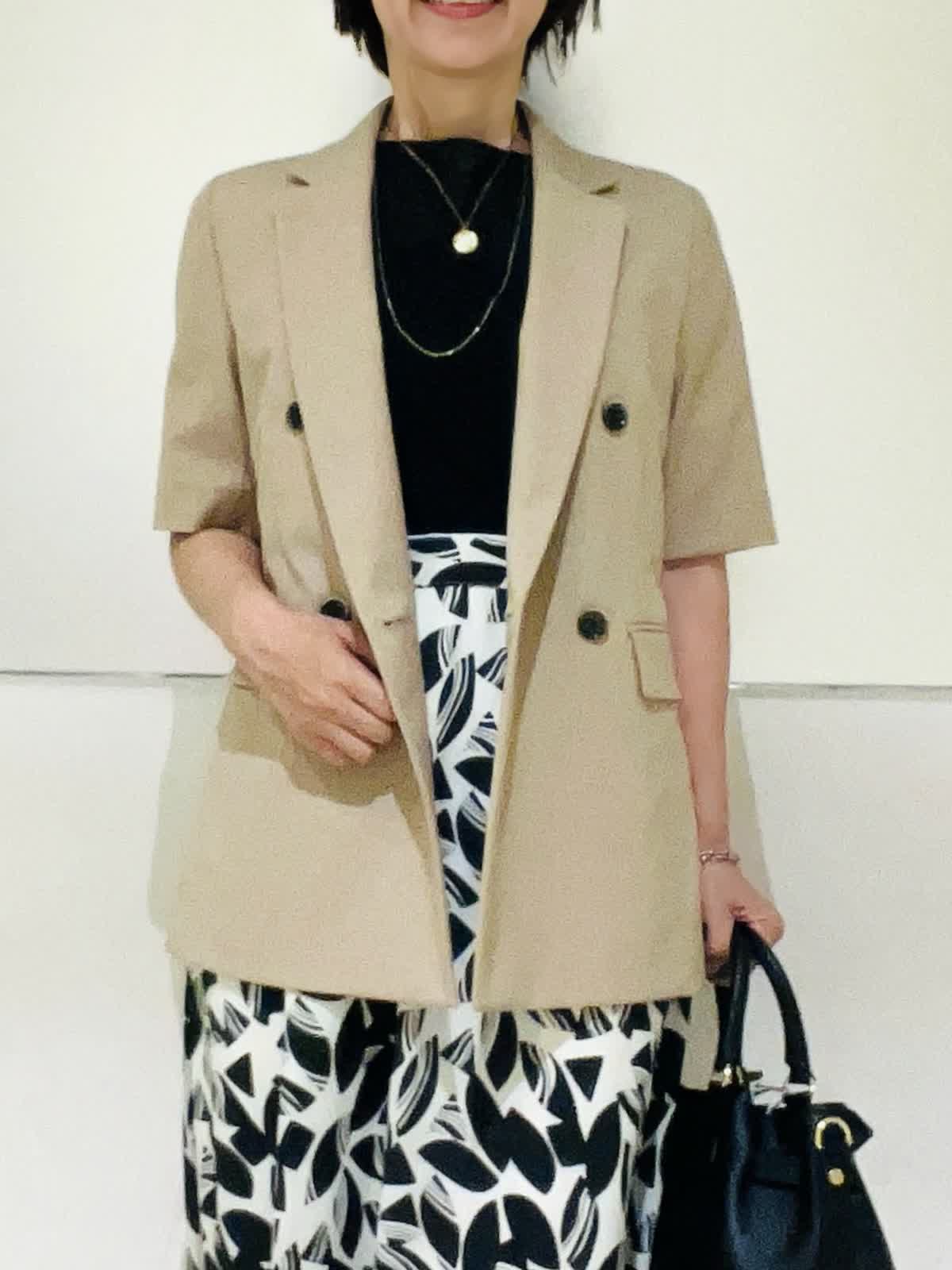 【着用アイテム】すべて9号 【着用カラー】ジャケット:キャメル カットソー:ブラック スカート:オフホワイト夏のオフィスカジュアル。半袖ジャケットは夏場のオフィスにぴったり。きちんと感がありながらも涼しい着心地を両立出来る優秀アイテム。接触冷感素材なので、より快適にお過ごしいただけます。スカート合わせで女性らしいイメージに仕上げました。