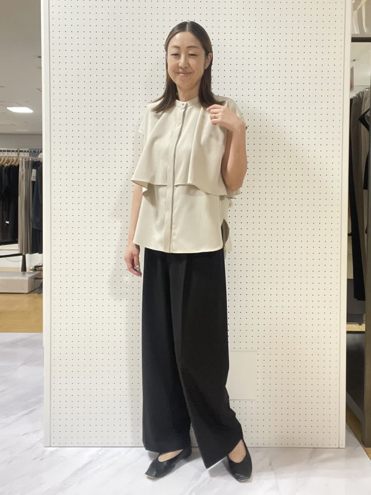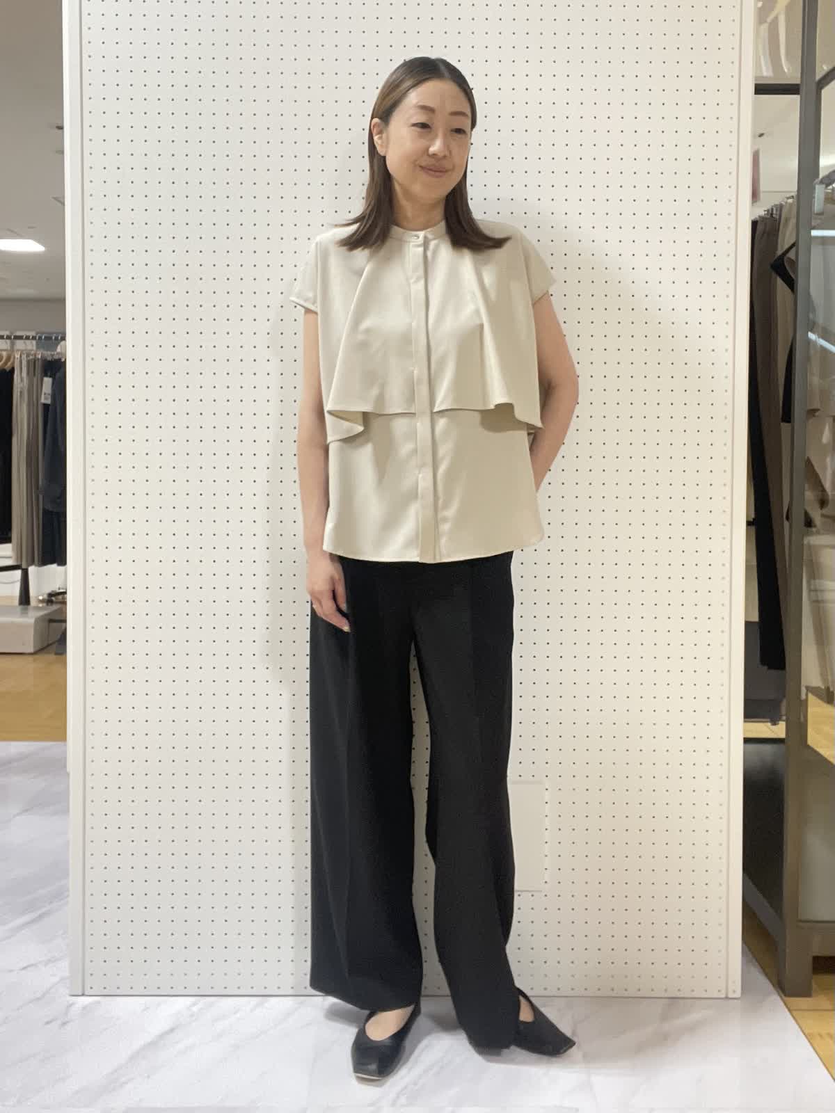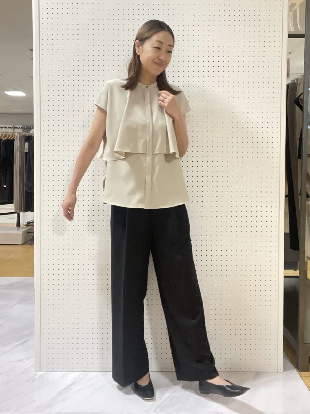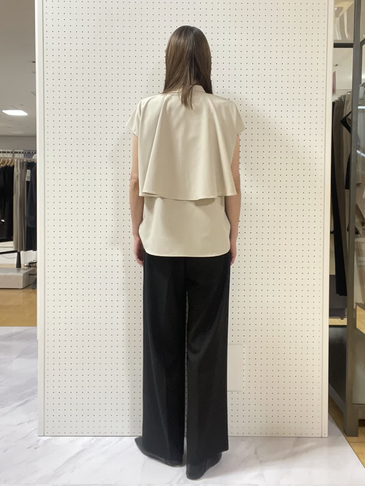 【着用サイズ】ブラウス:フリー パンツ:9号 【着用カラー】ブラウス:ベージュ パンツ:ブラック 綺麗目お出かけスタル 着るだけでこなれ感が出るレイヤードブラウス。ワイドパンツと相性抜群です!