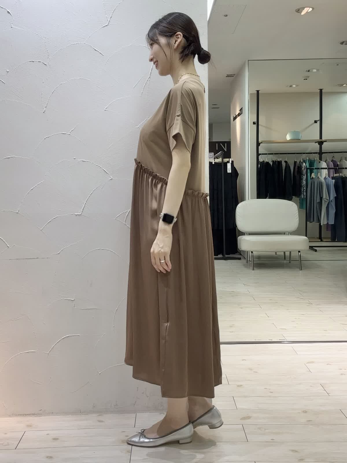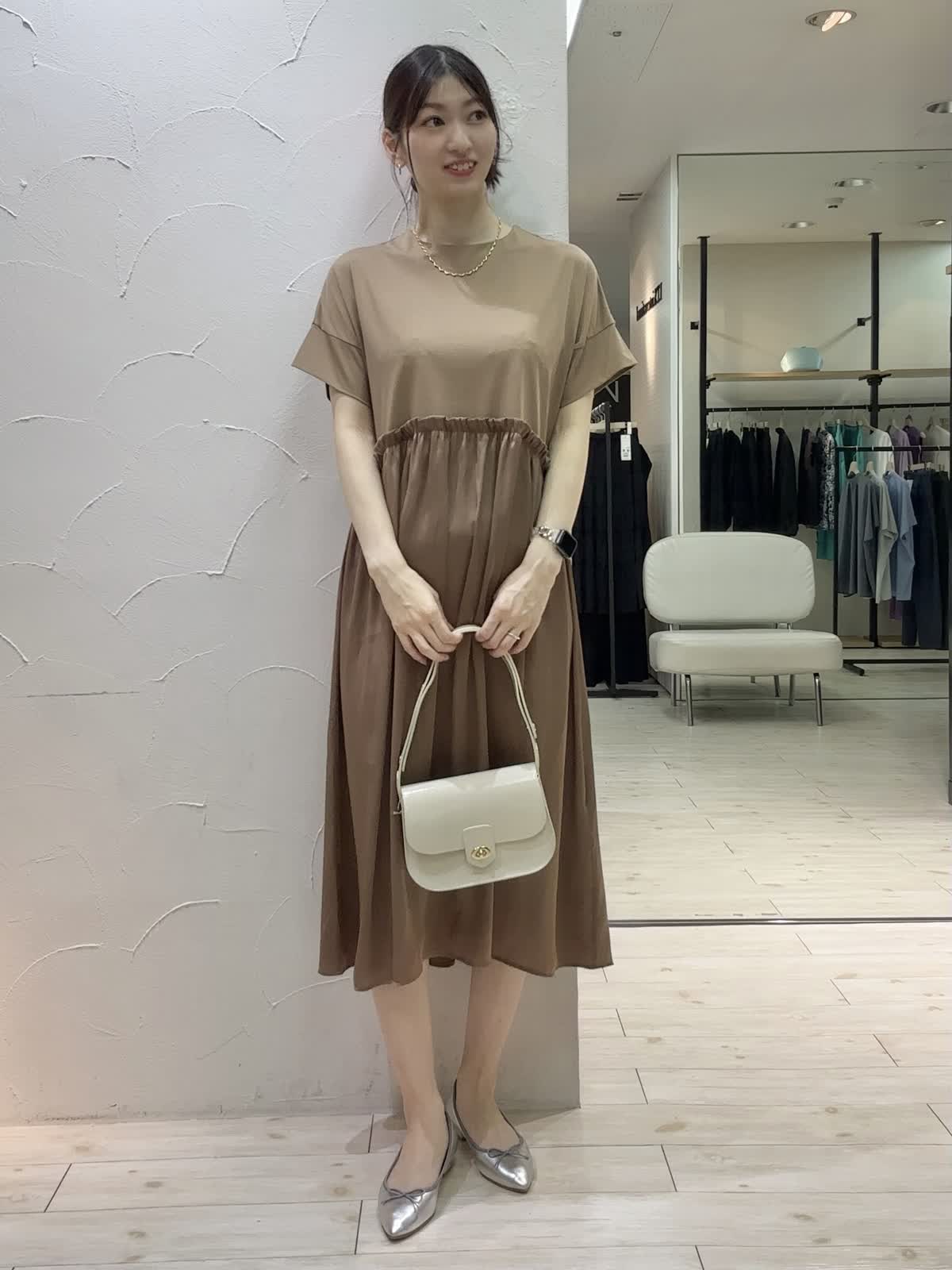 【着用サイズ】ワンピース:フリー 【着用カラー】ワンピース:キャメル バッグ:ベージュ ドッキングがアクセントになっているワンピースは、身頃がゆったりしており締め付け感ゼロなのでリラックスして着用していただけます。ウエストから素材が変わっているのでカジュアルすぎず大人な雰囲気。