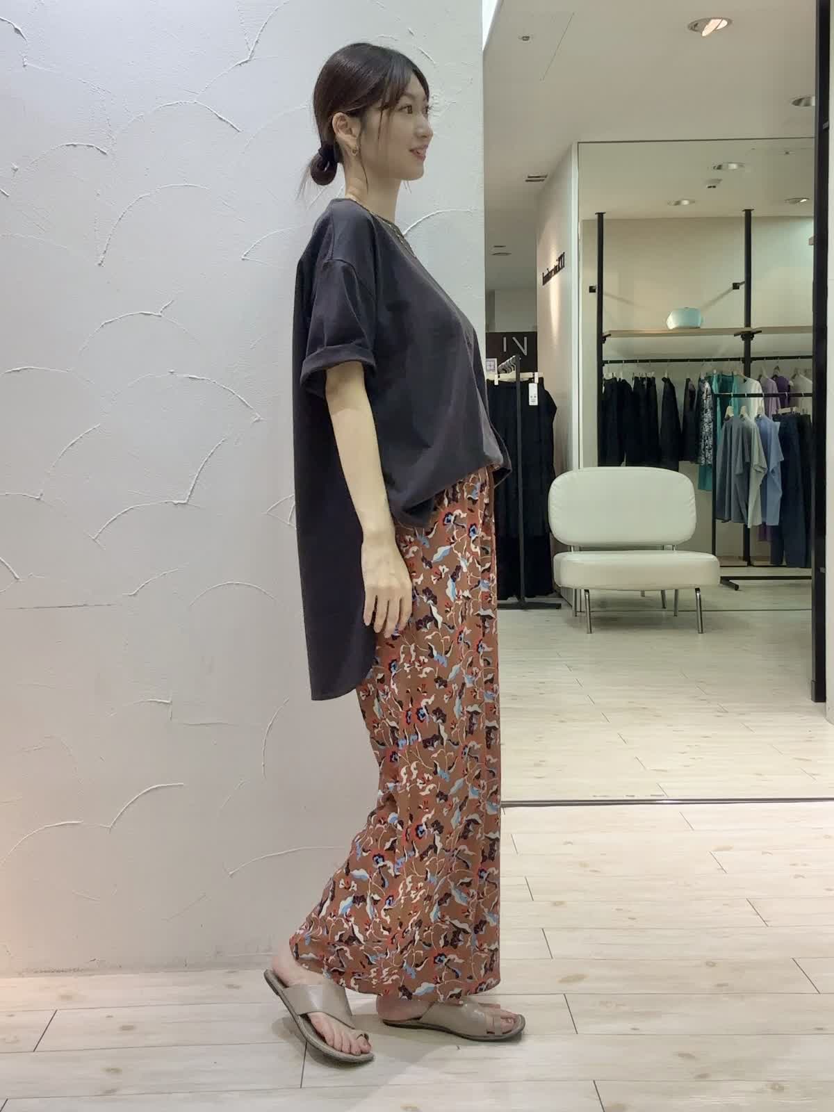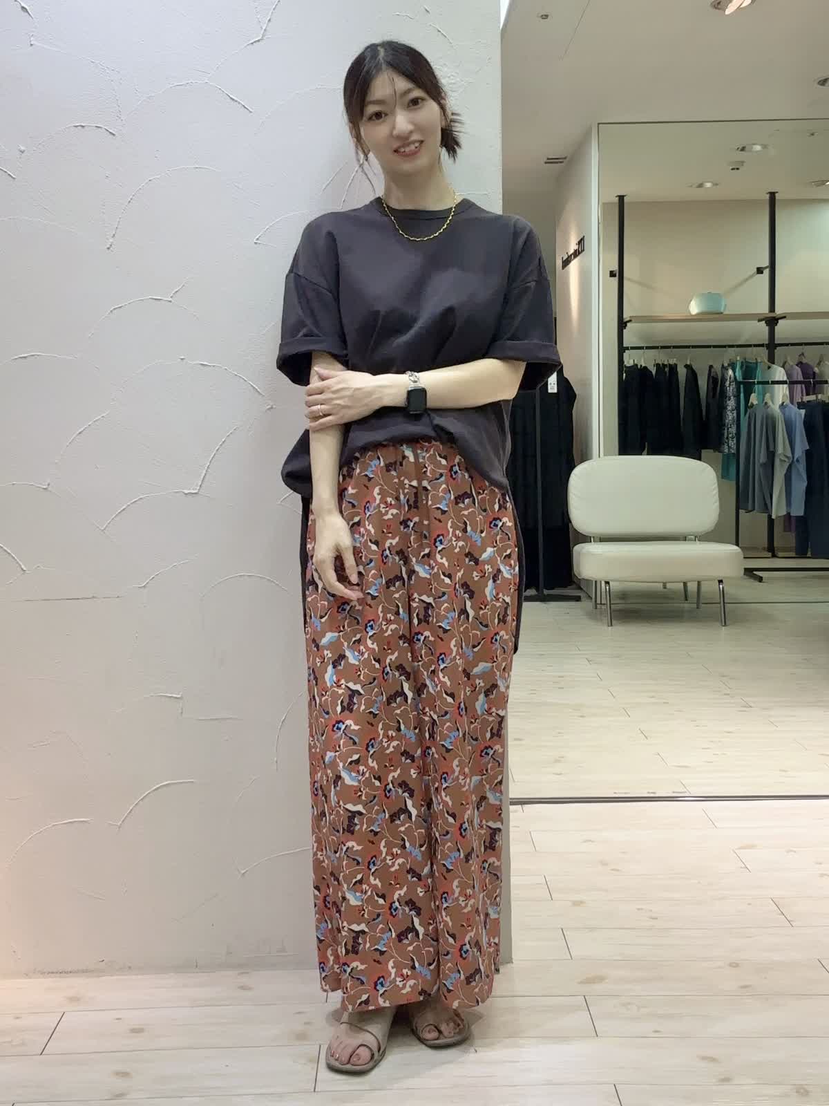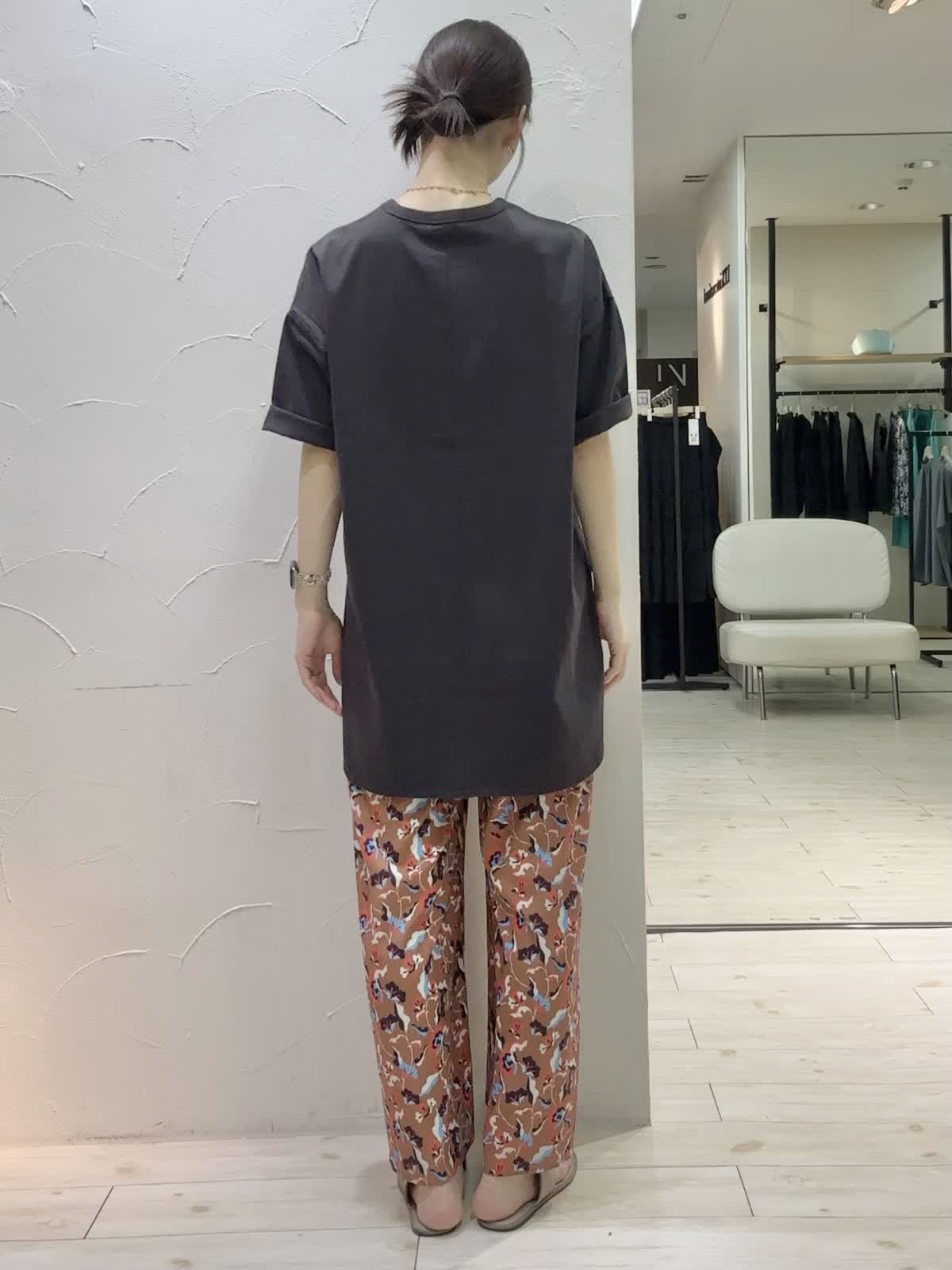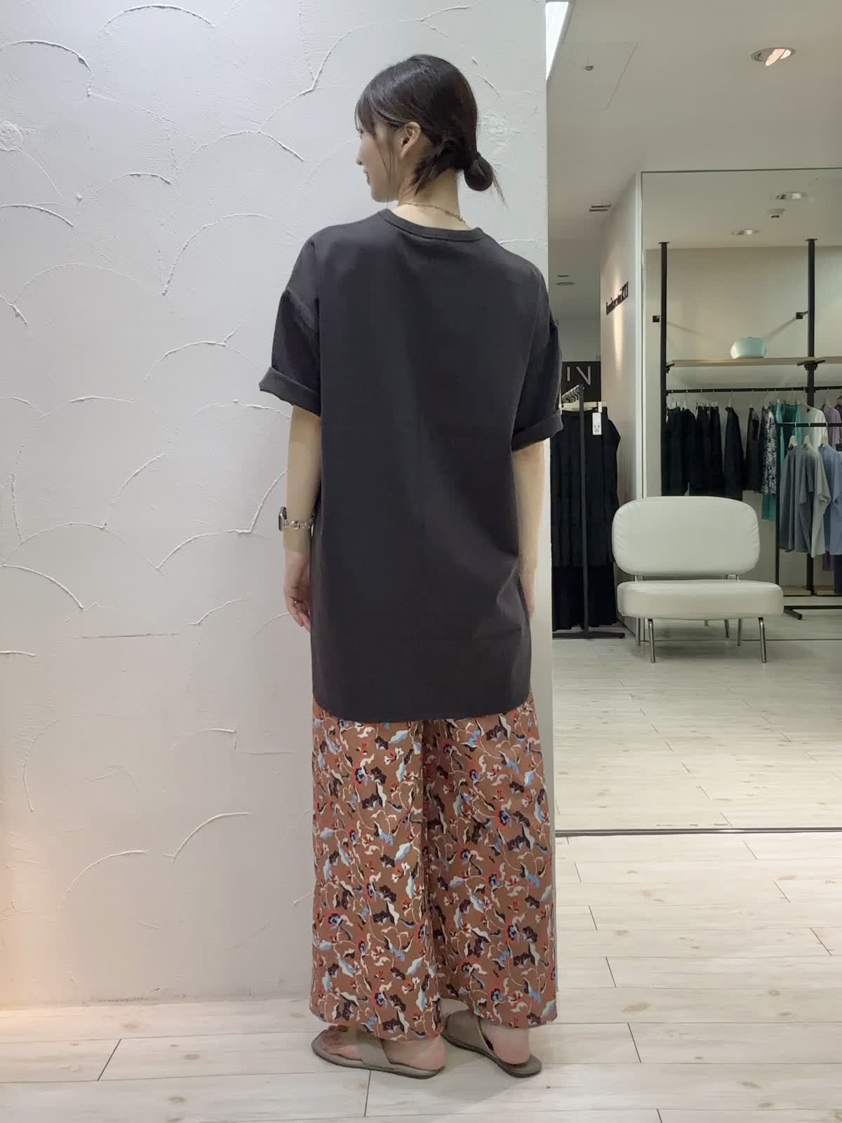 【着用サイズ】カットソー:フリー パンツ:9号 【着用カラー】カットソー:スミクロ パンツ:キンチャ オーバーサイズのカットソーは、ゆったりしたボトムと合わせるのが今どき!ヴィンテージ柄のパンツでラフに合わせてみました。袖を少し曲げるとこなれ感が出るのでオススメです。