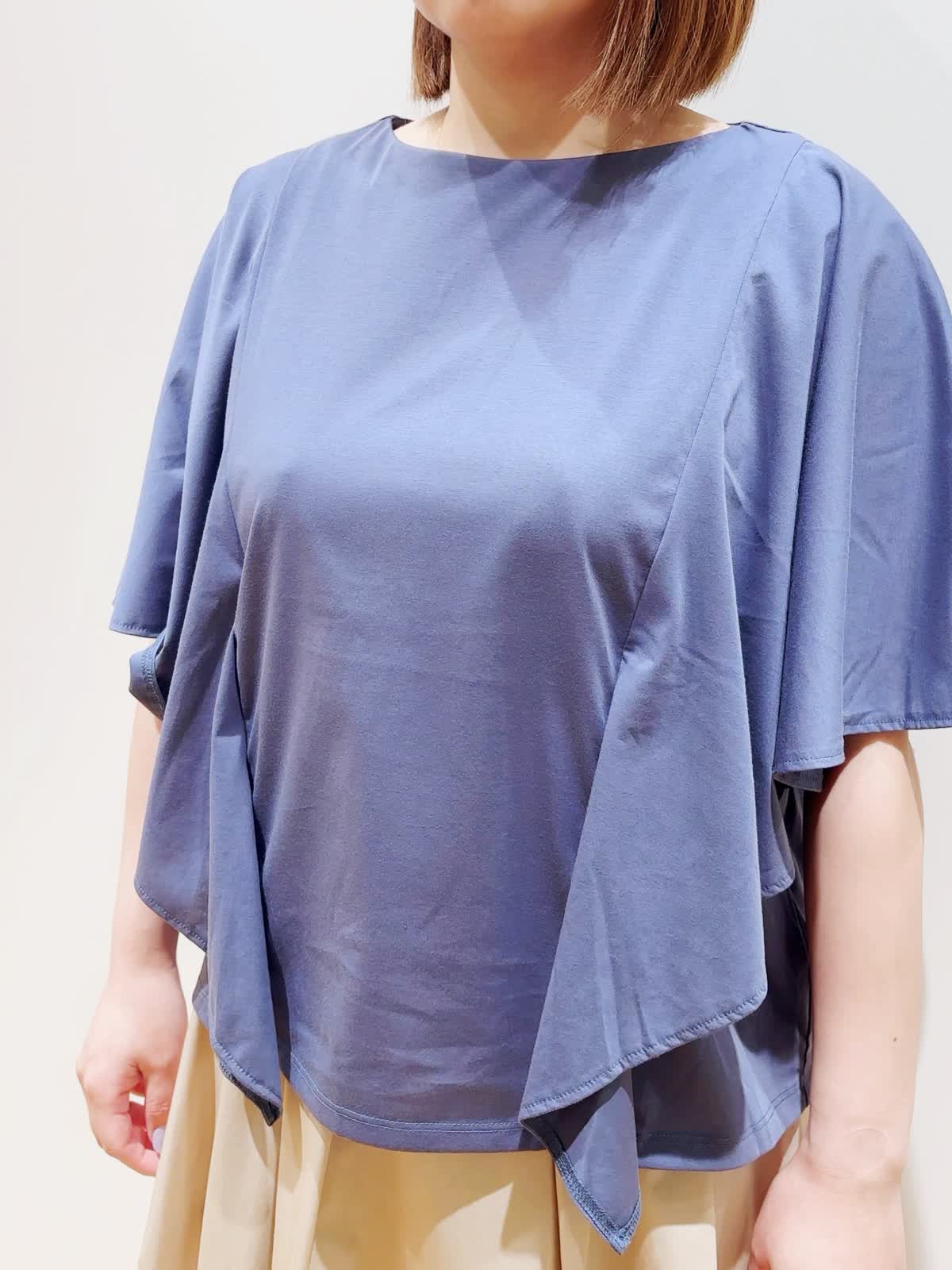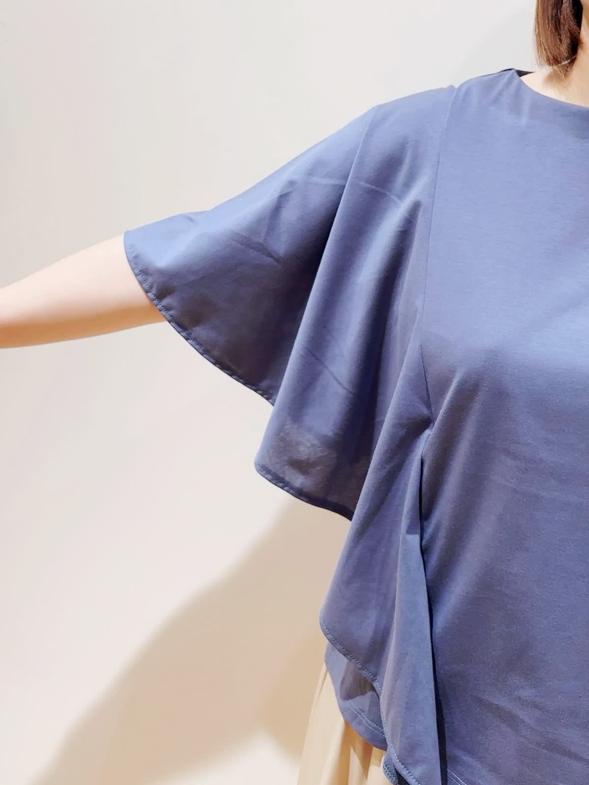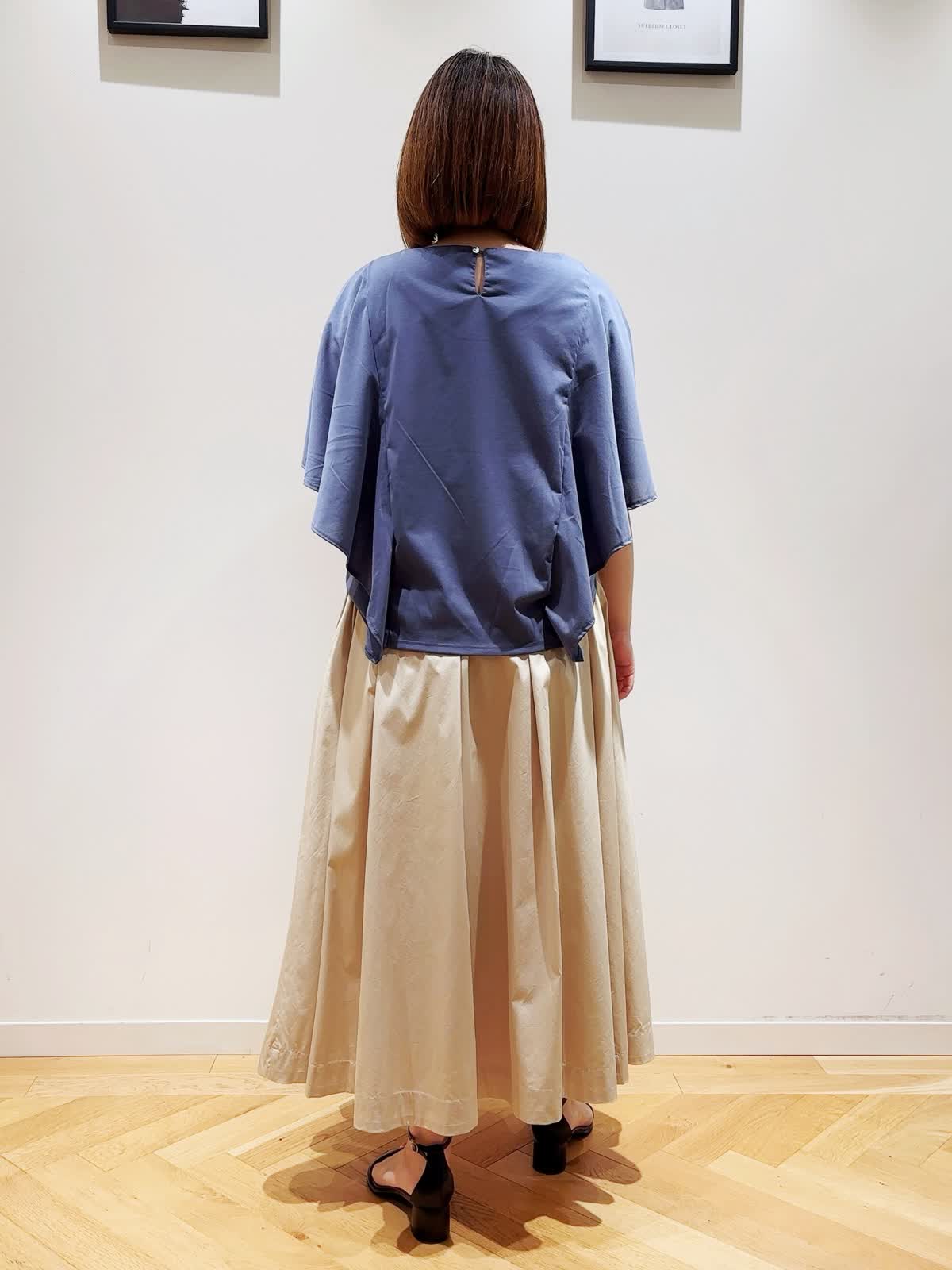 【着用サイズ】カットソー:フリー スカート:9号 【着用カラー】カットソー:ブルー スカート:ベージュ バック:モカチャ トップスはノースリーブの上にフレア袖が乗るデザインで二の腕をしっかりカバーしてくれる袖丈です。風通しが良く軽い着心地で1枚で様になるカットソーです。程よい光沢感が加わることでカジュアルすぎず洗礼された印象になります。スカートはさらっとしたタフタ素材でシーズンレスで着れます。INEDのタックスカートと合わせて大人っぽいコーディネートに。