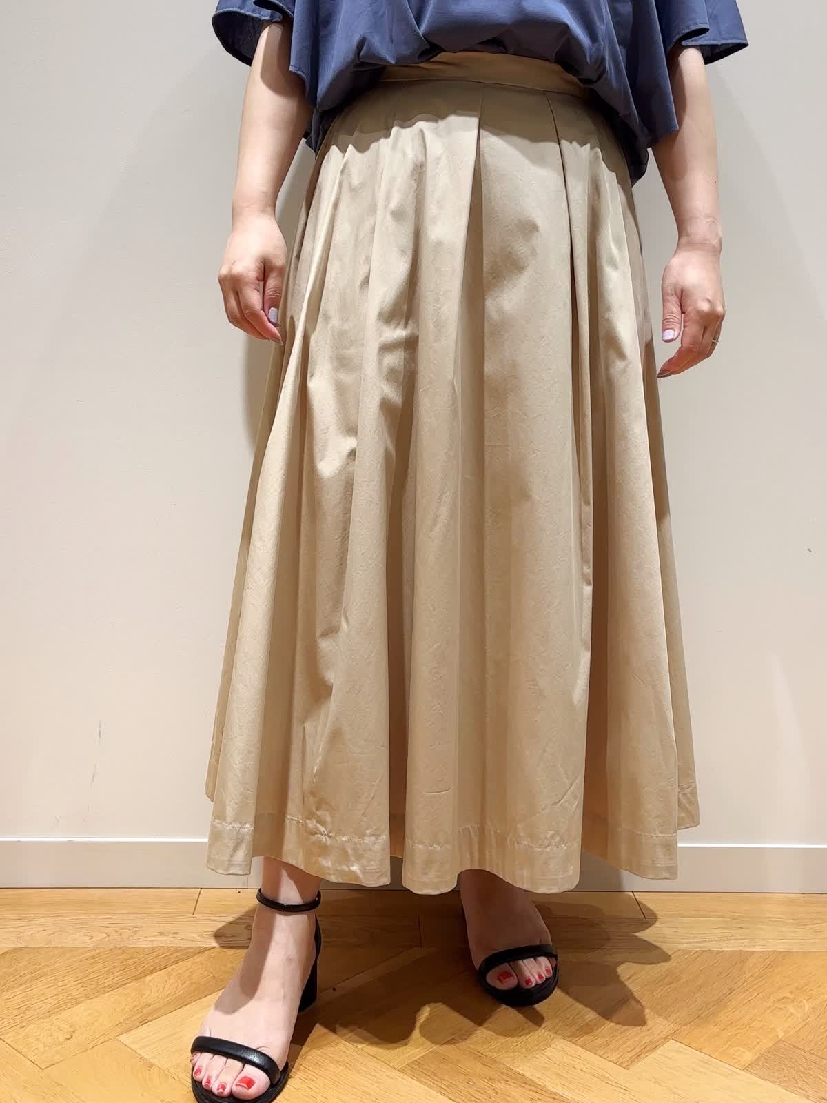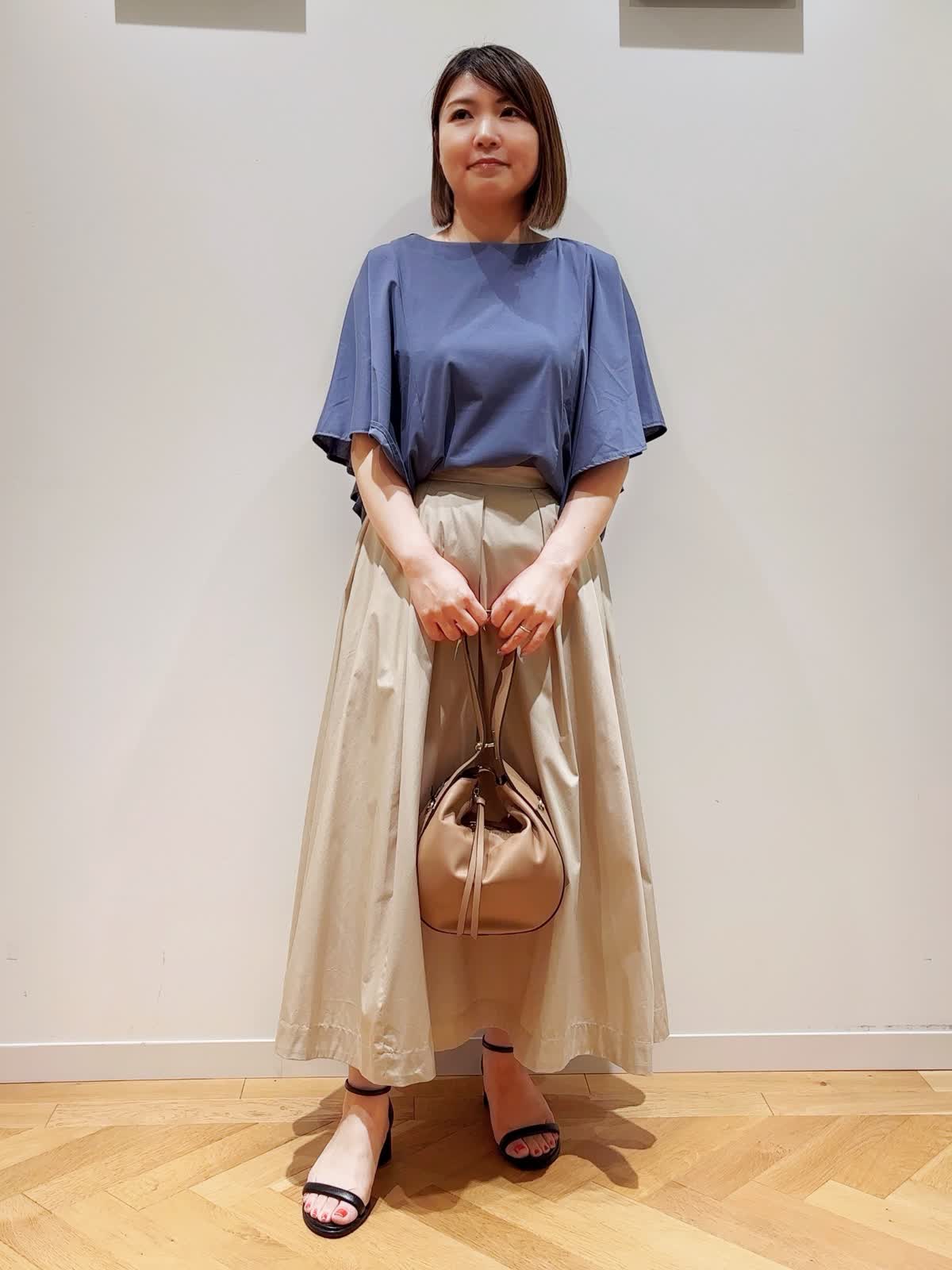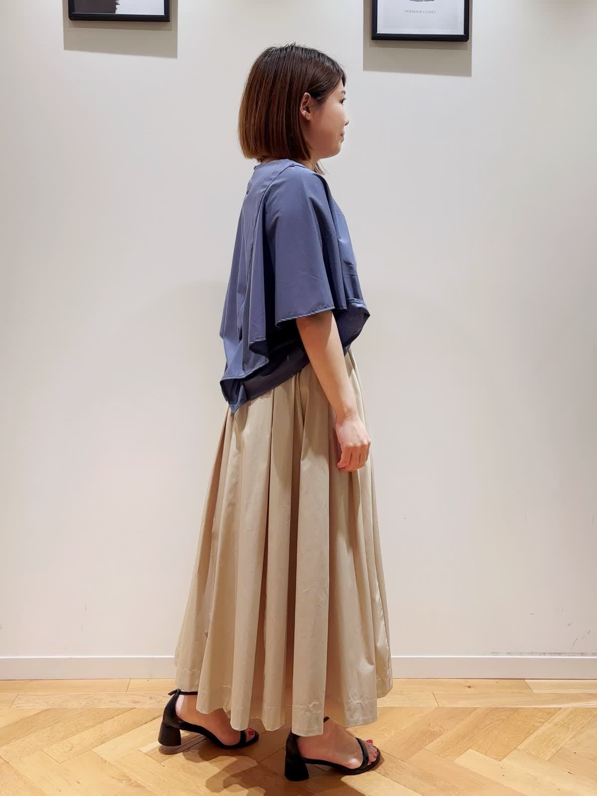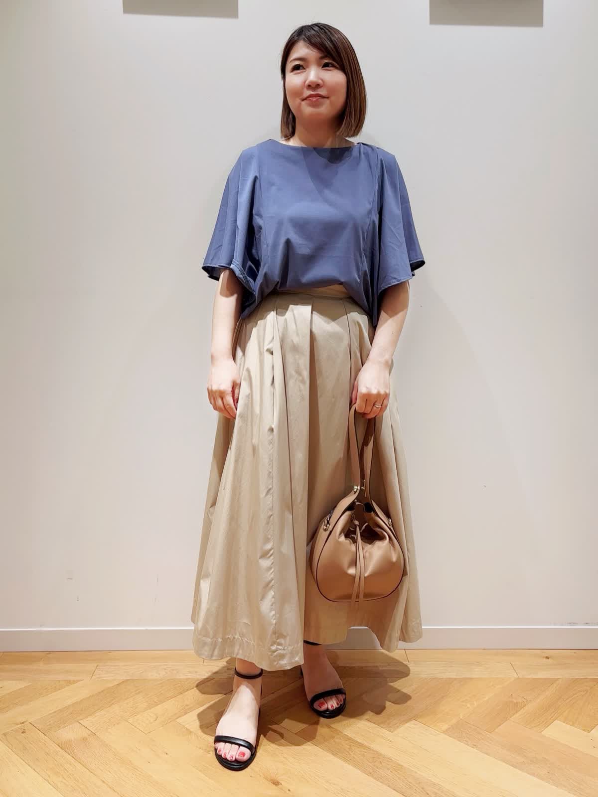 【着用サイズ】カットソー:フリー スカート:9号 【着用カラー】カットソー:ブルー スカート:ベージュ バック:モカチャ トップスはノースリーブの上にフレア袖が乗るデザインで二の腕をしっかりカバーしてくれる袖丈です。風通しが良く軽い着心地で1枚で様になるカットソーです。程よい光沢感が加わることでカジュアルすぎず洗礼された印象になります。スカートはさらっとしたタフタ素材でシーズンレスで着れます。INEDのタックスカートと合わせて大人っぽいコーディネートに。