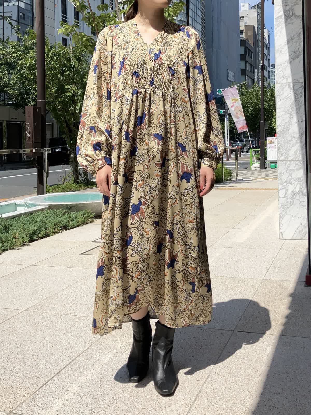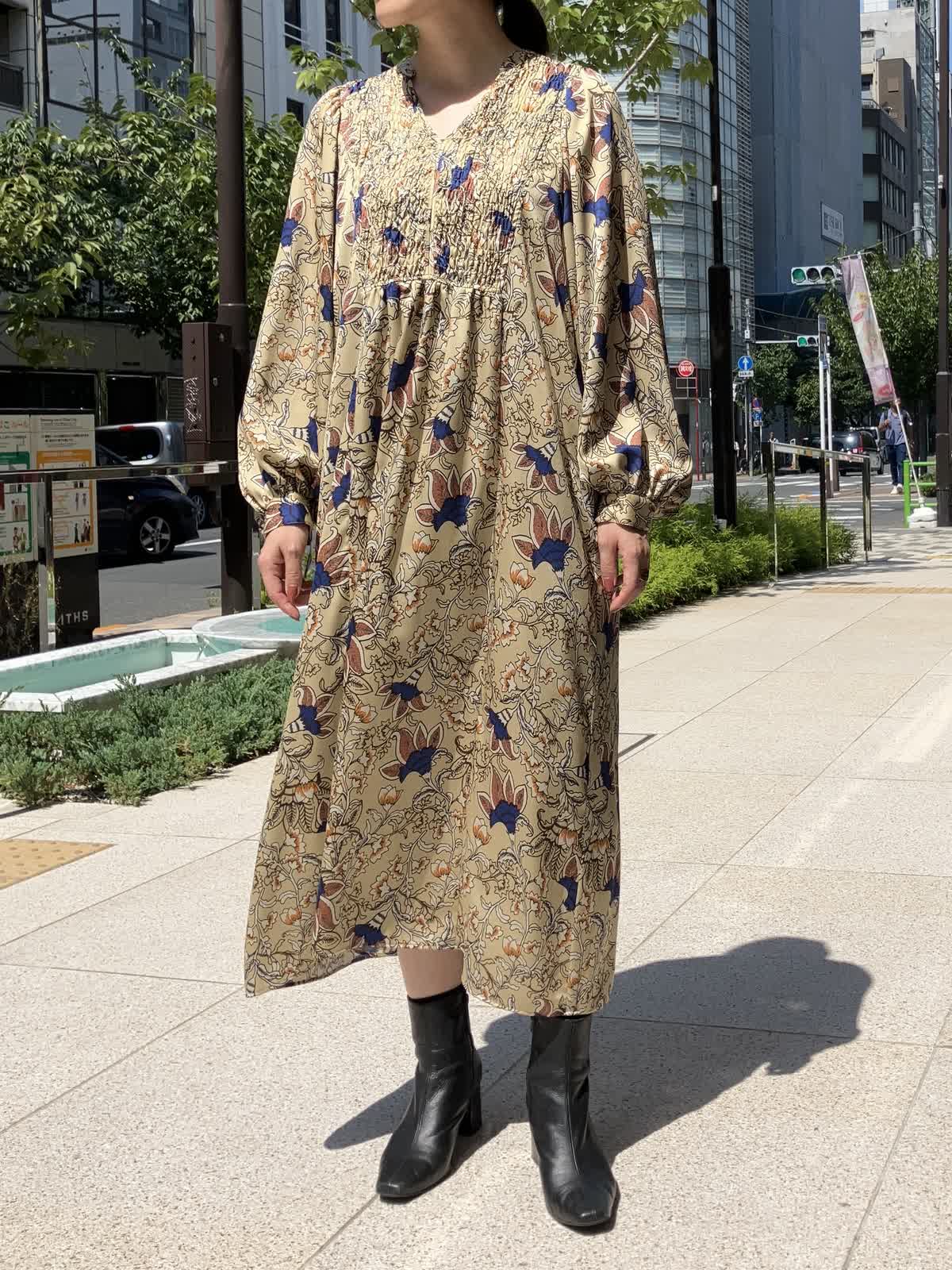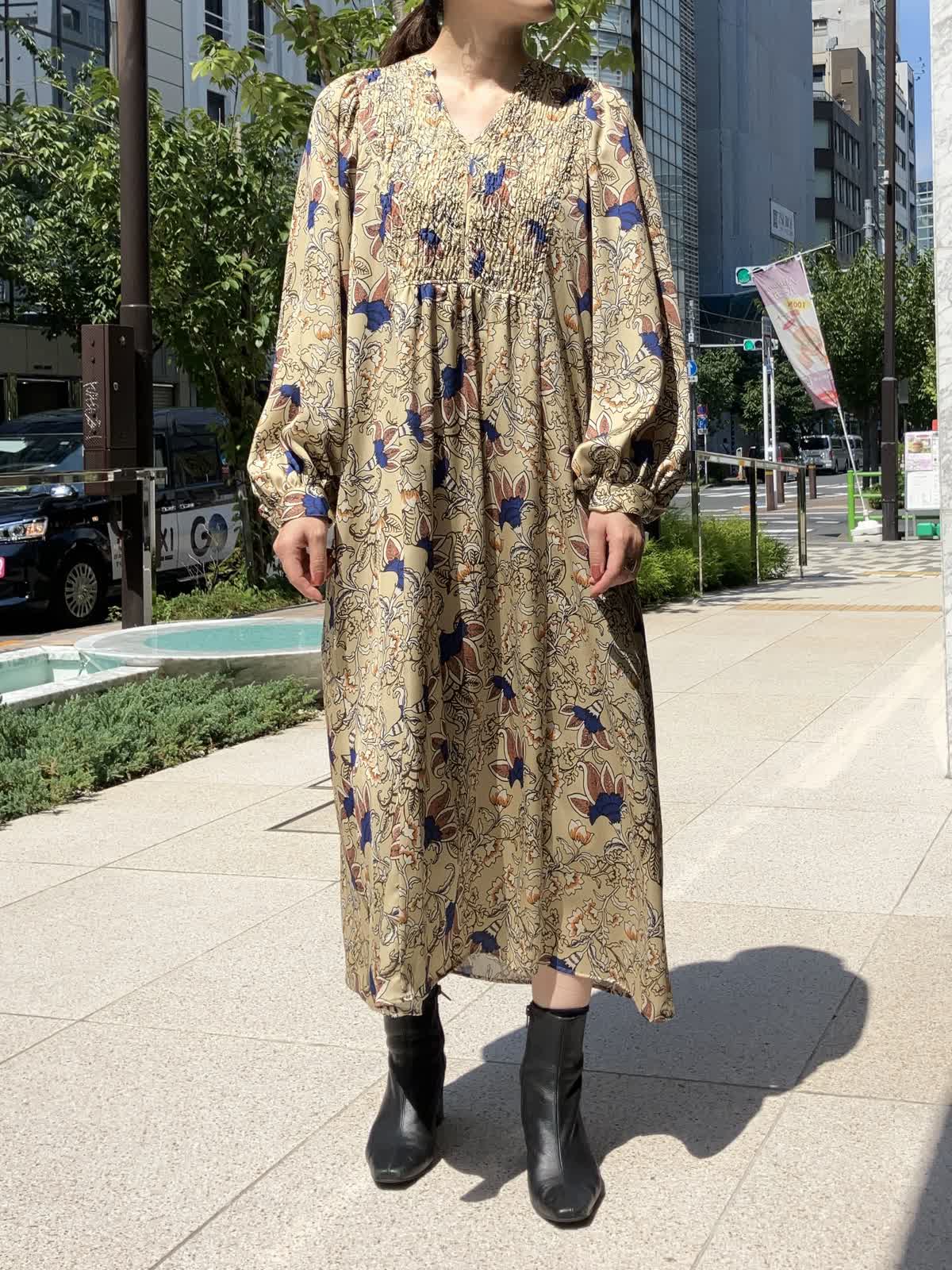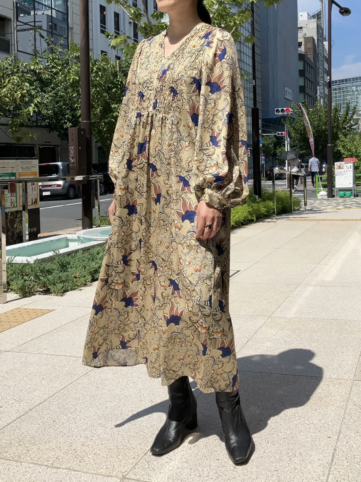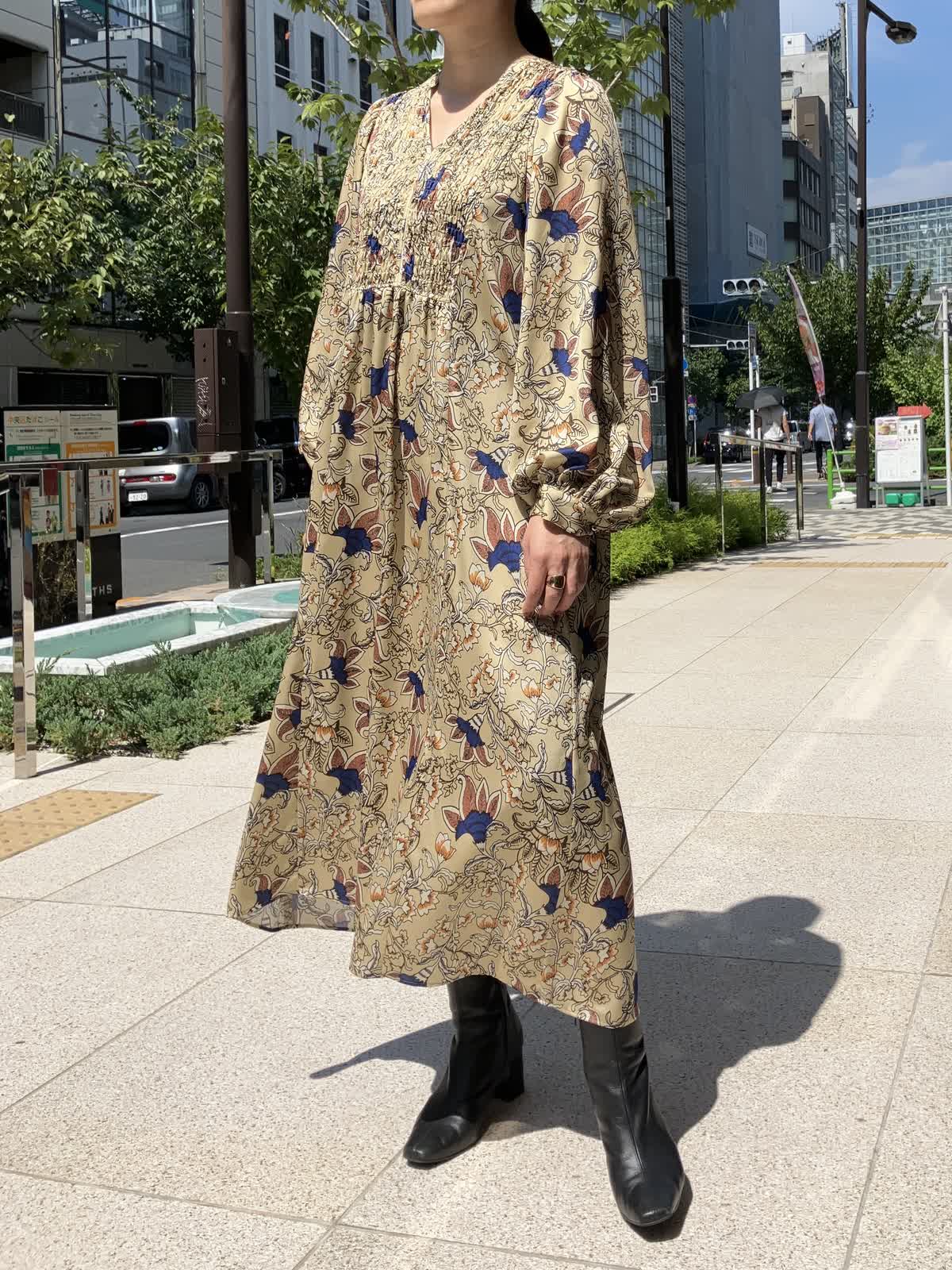 【着用サイズ】ワンピース:フリー【着用カラー】ワンピース:ベージュ オリジナルのフラワープリントが魅力のワンピース。ボヘミアン調のプリントは華やかさもありつつ、大人で上品な雰囲気に。Vネックでお顔まわりをすっきりと魅せてくれて、秋の始まりの大切な 1着になるはずです。