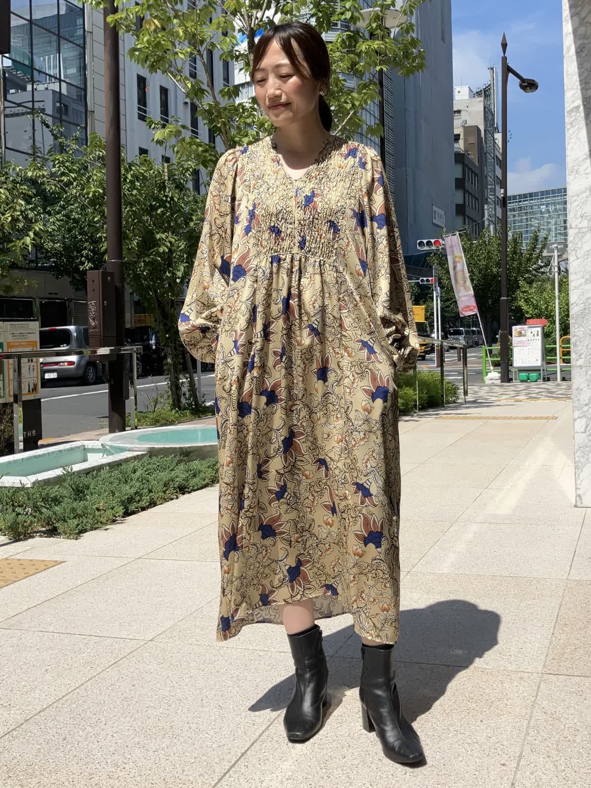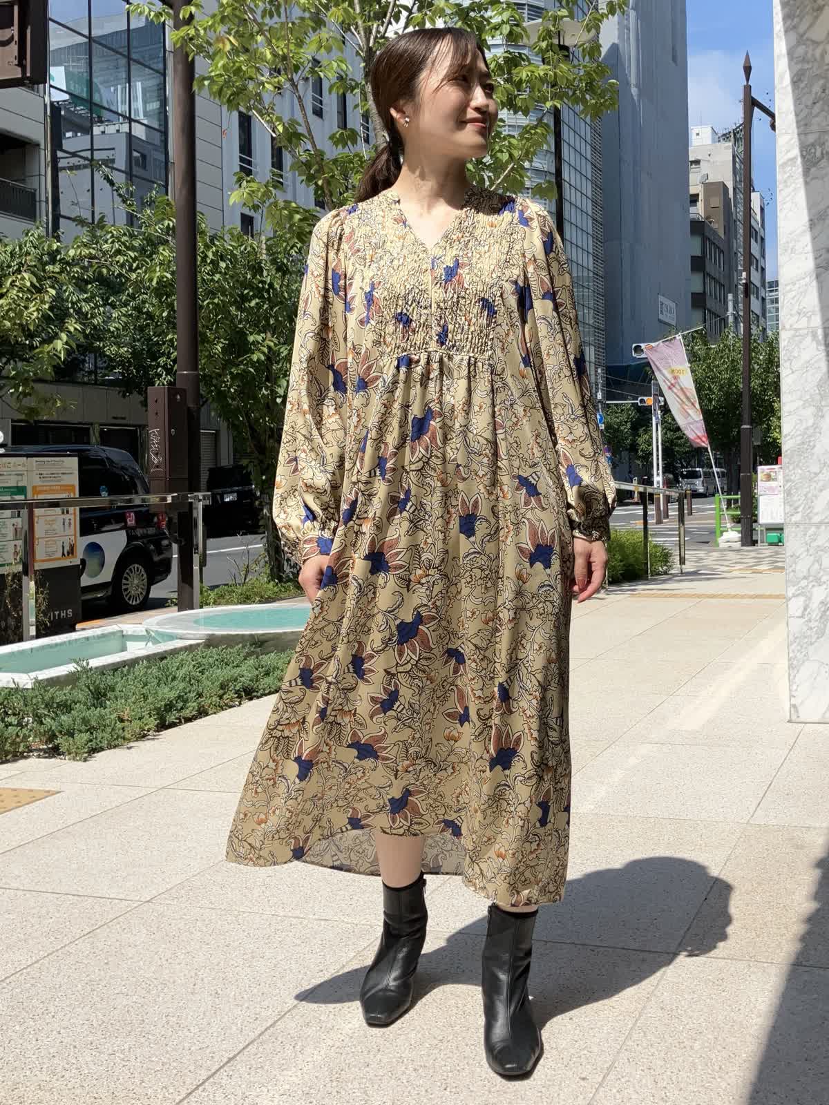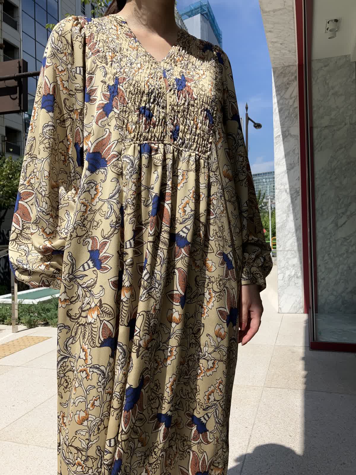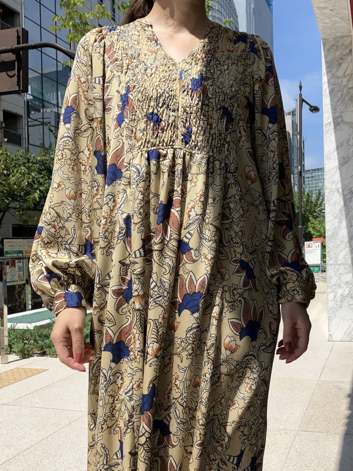 【着用サイズ】ワンピース:フリー【着用カラー】ワンピース:ベージュ オリジナルのフラワープリントが魅力のワンピース。ボヘミアン調のプリントは華やかさもありつつ、大人で上品な雰囲気に。Vネックでお顔まわりをすっきりと魅せてくれて、秋の始まりの大切な 1着になるはずです。