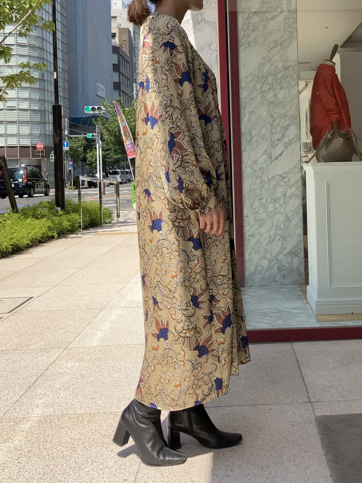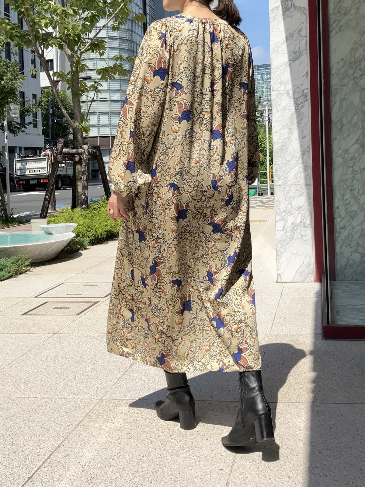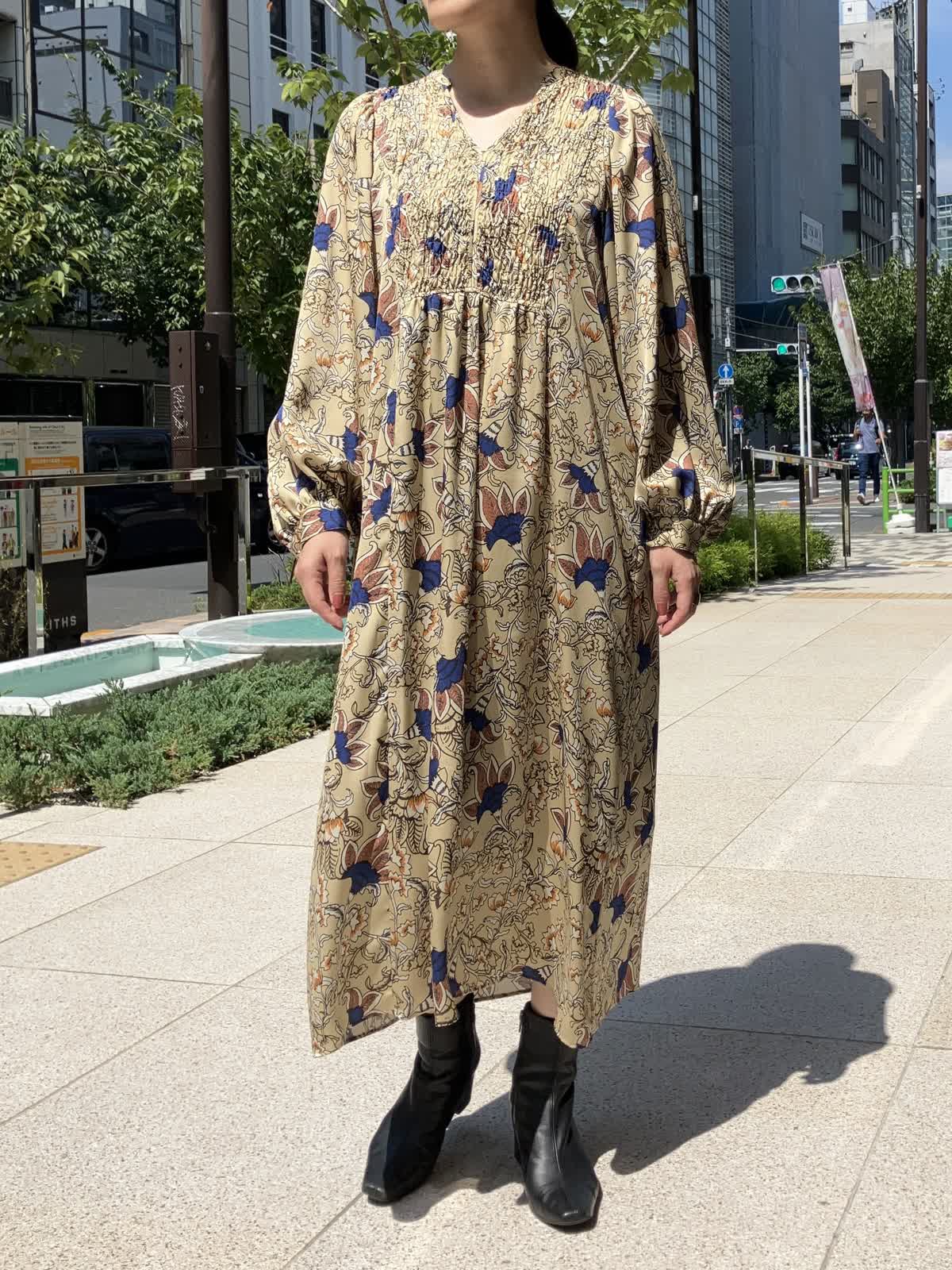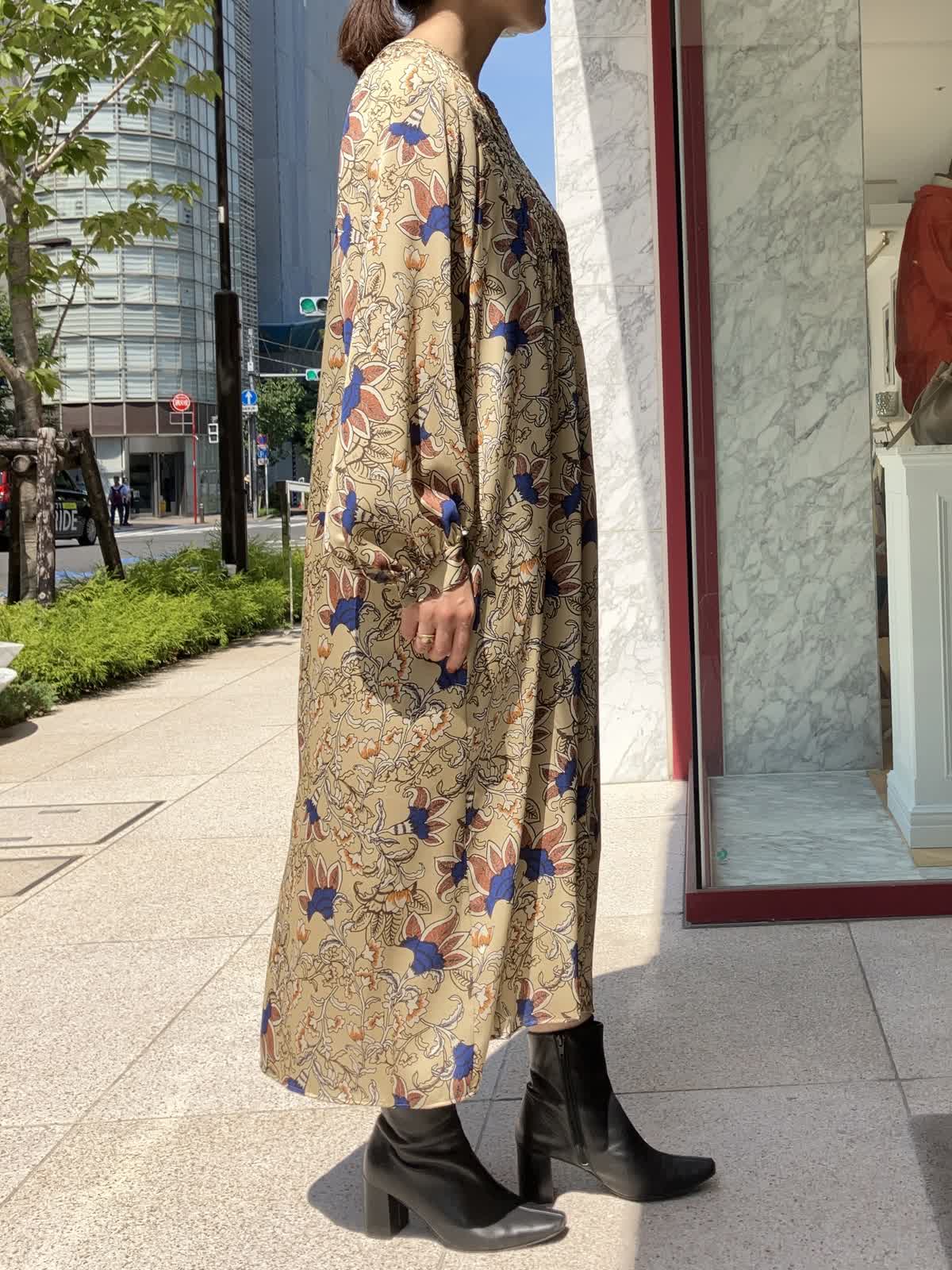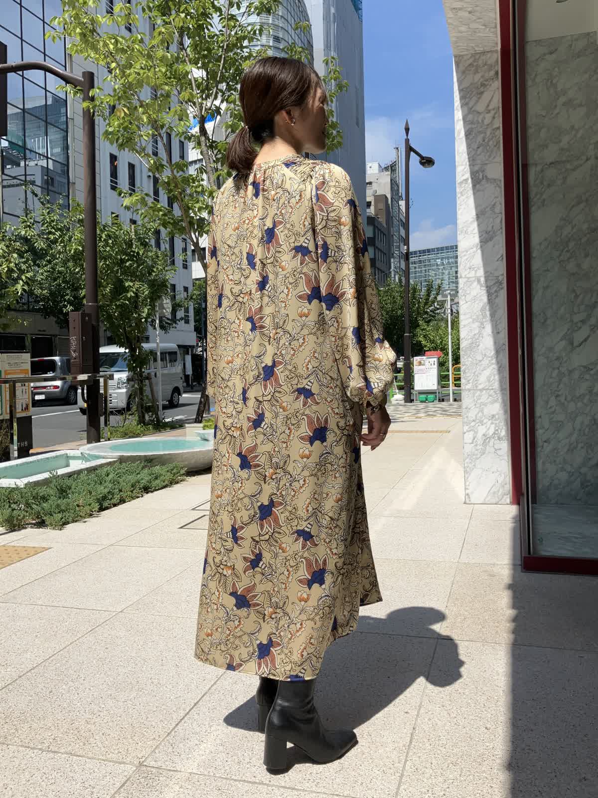 【着用サイズ】ワンピース:フリー【着用カラー】ワンピース:ベージュ オリジナルのフラワープリントが魅力のワンピース。ボヘミアン調のプリントは華やかさもありつつ、大人で上品な雰囲気に。Vネックでお顔まわりをすっきりと魅せてくれて、秋の始まりの大切な 1着になるはずです。