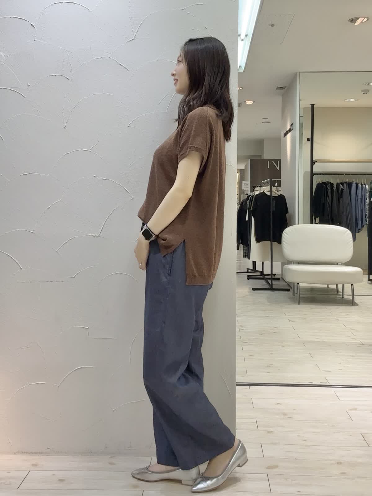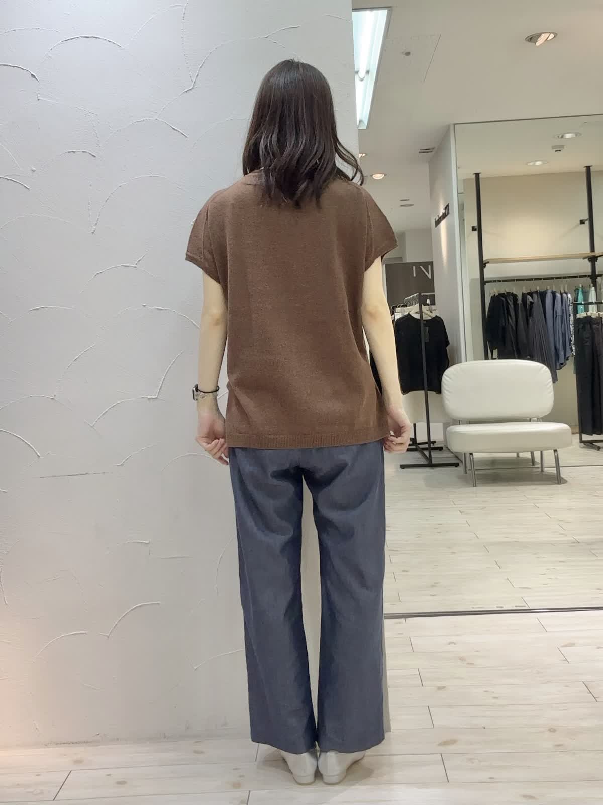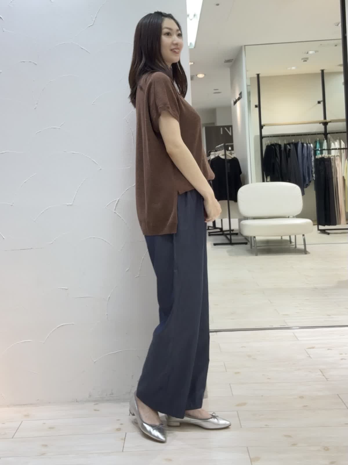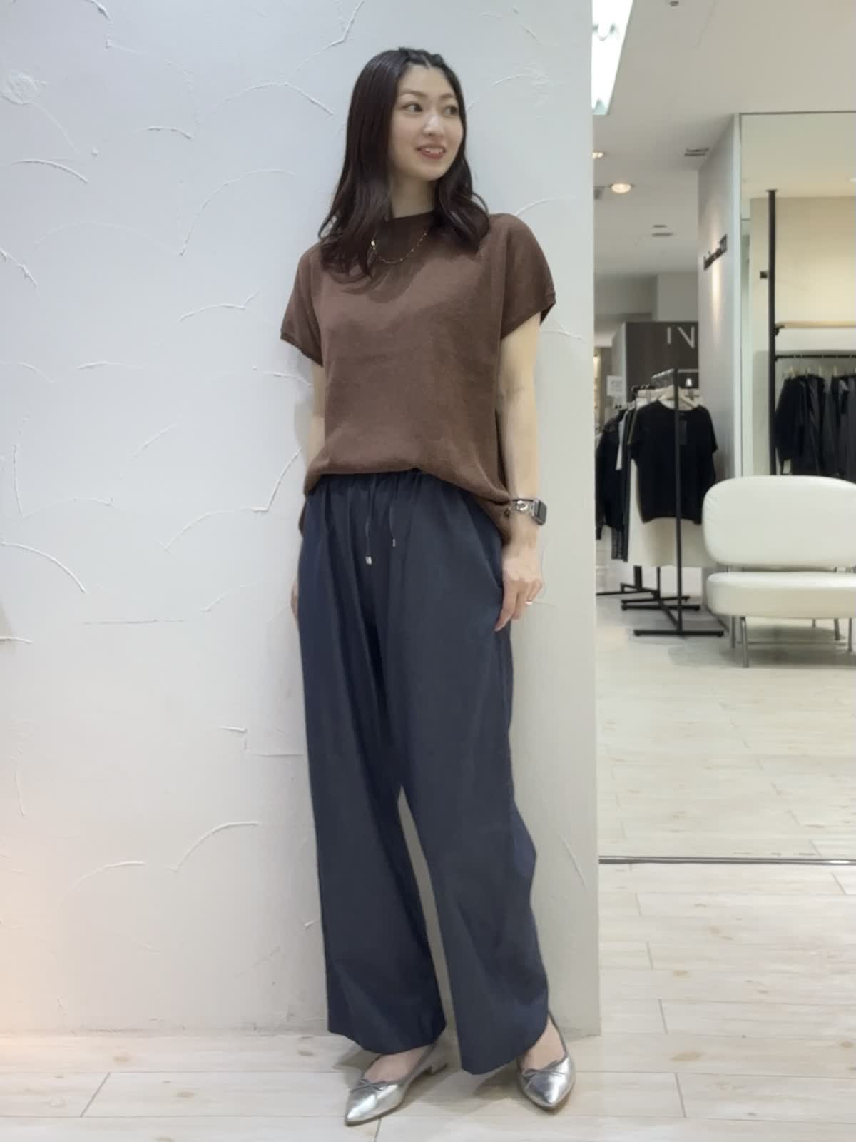 【着用サイズ】ニット:フリー パンツ:9号 【着用カラー】ニット:ブラウン パンツ:ネイビー 秋まで着れる大人のリラックスコーデ。ブークレのサマーニットは、タオル地のような肌触りが心地いいです。ボトムはデニム調だから、軽くて柔らかく履き心地抜群です。イージーケア性もポイントです。