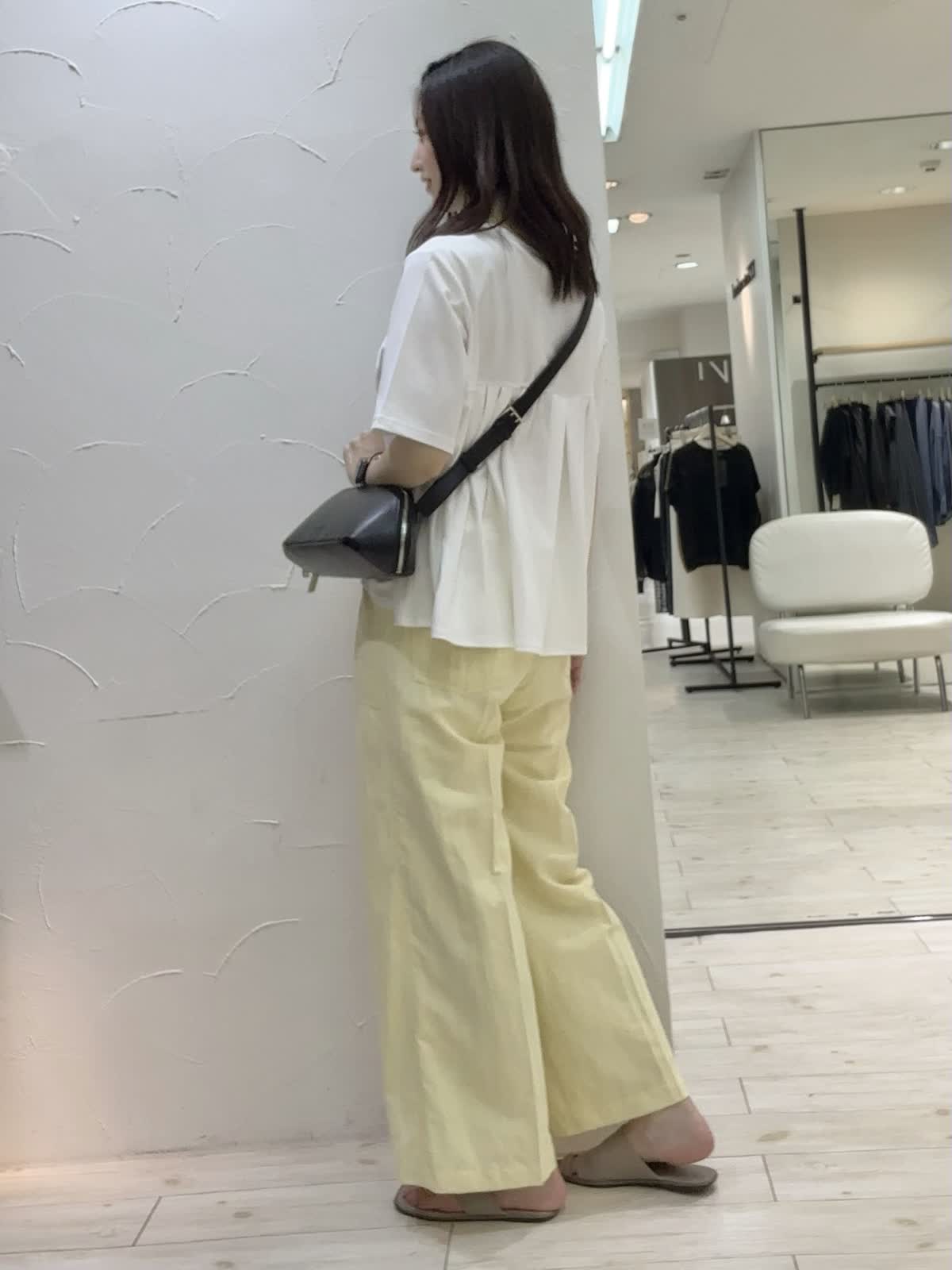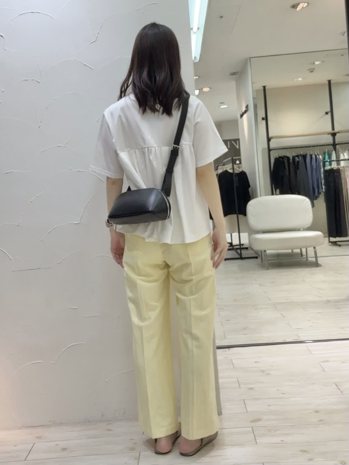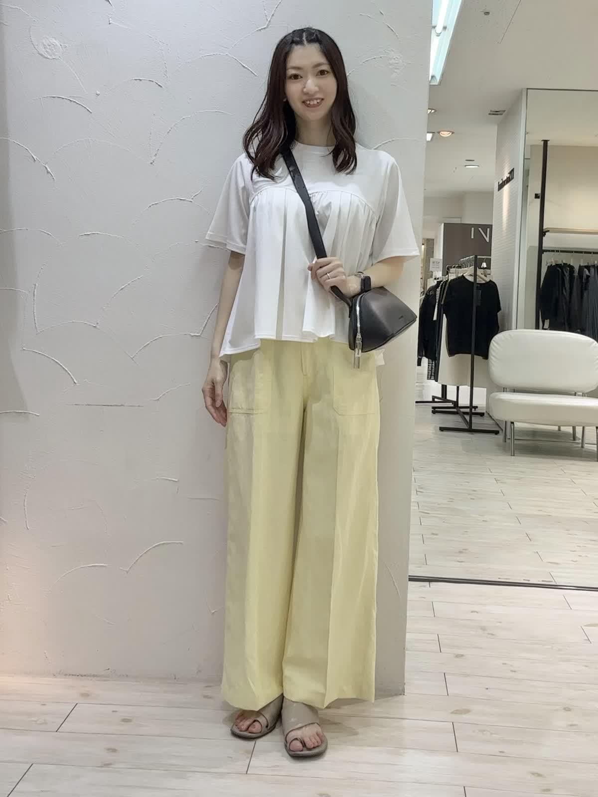 【着用サイズ】カットソー:フリー パンツ:9号 【着用カラー】カットソー:オフホワイト パンツ:イエロー バッグ:ブラック 夏のさわやかお出かけコーデ。差し色のイエローパンツがポイント、リネン混で軽くて涼しいので暑い時期にもおすすめ。シルエットがとてもキレイで色違いで揃えたくなるアイテムです。