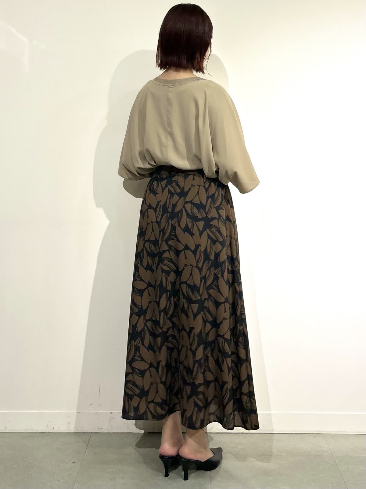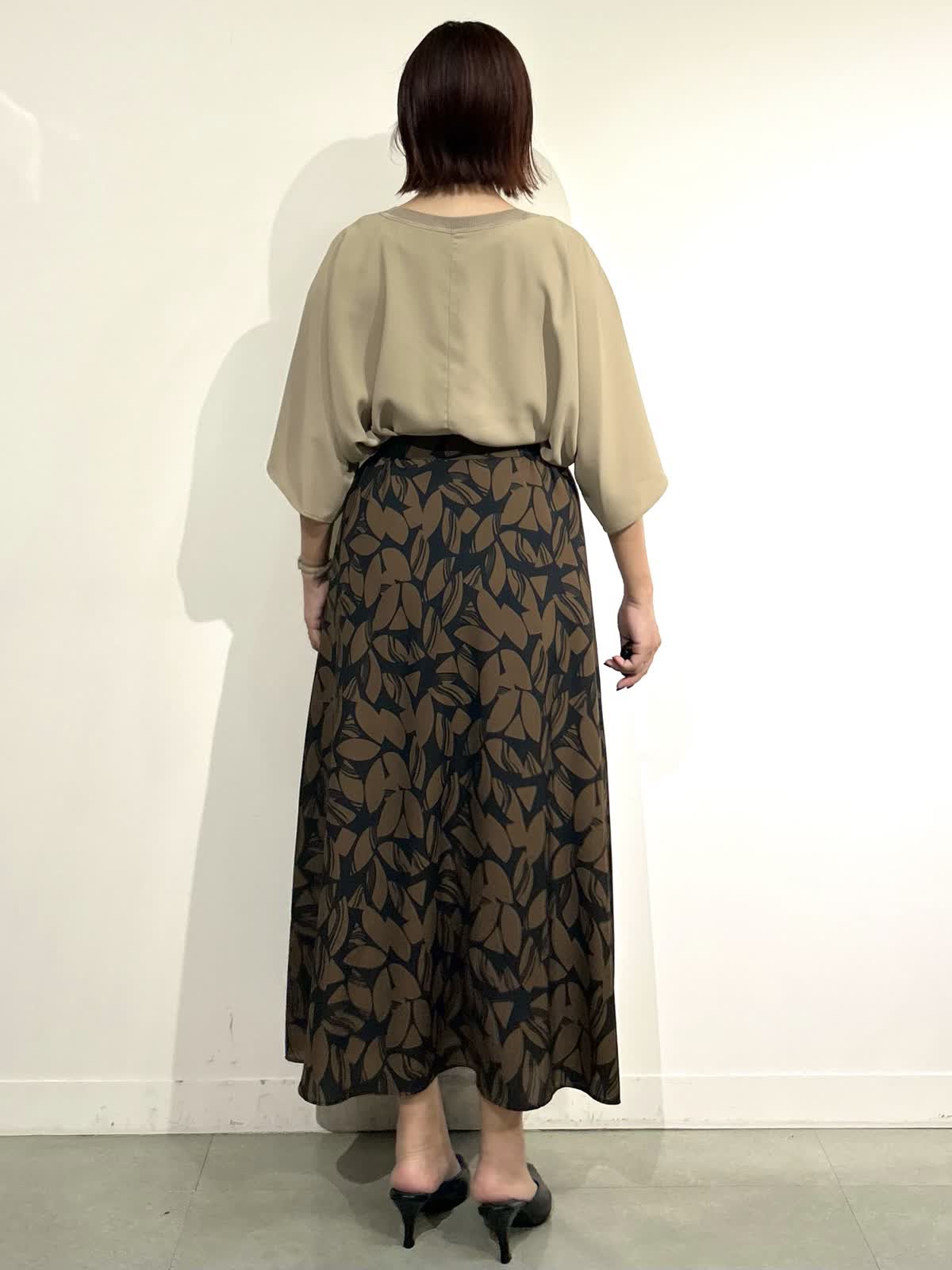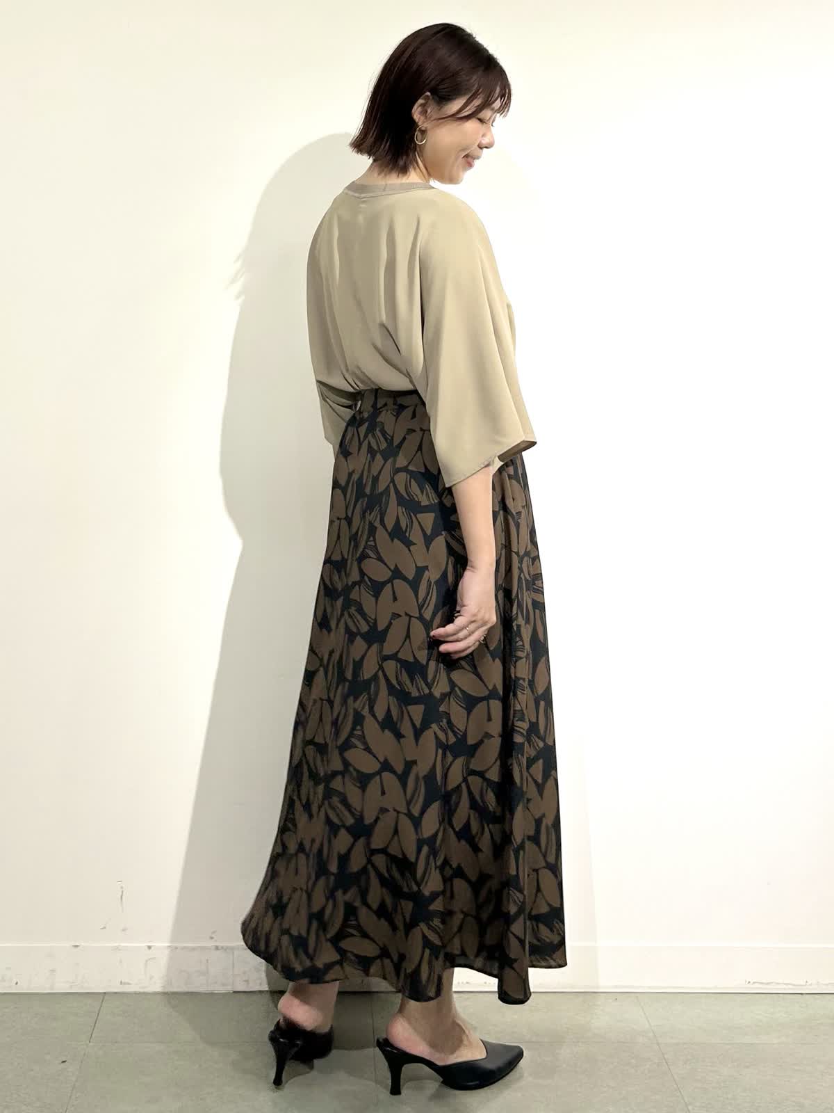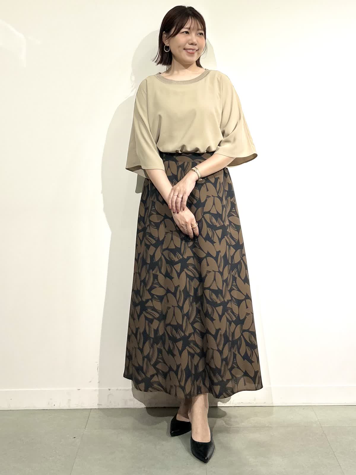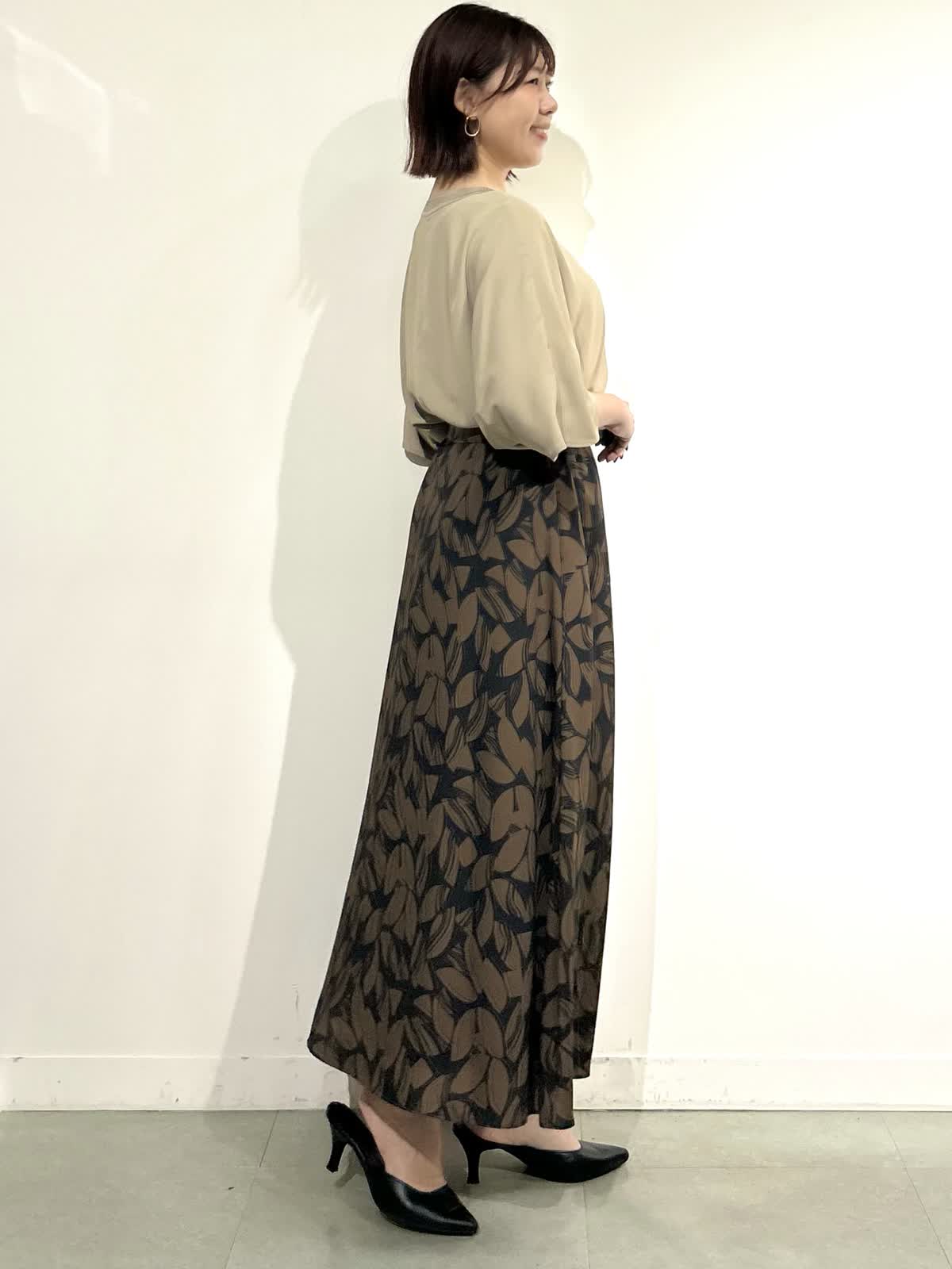 【着用サイズ】全て9号 【着用カラー】ブラウス:ベージュ スカート:カーキ 夏は涼しく着られて、晩夏から秋にかけてカラーから秋らしさを取り入れられるスタイリングです。 ブラウスは長めの袖丈がエレガントで上品な印象になります。 スカートはさらっと軽い生地で動くたびに揺れる裾がとても素敵です。 夏から秋に明けて長く楽しめるスタイリングです。