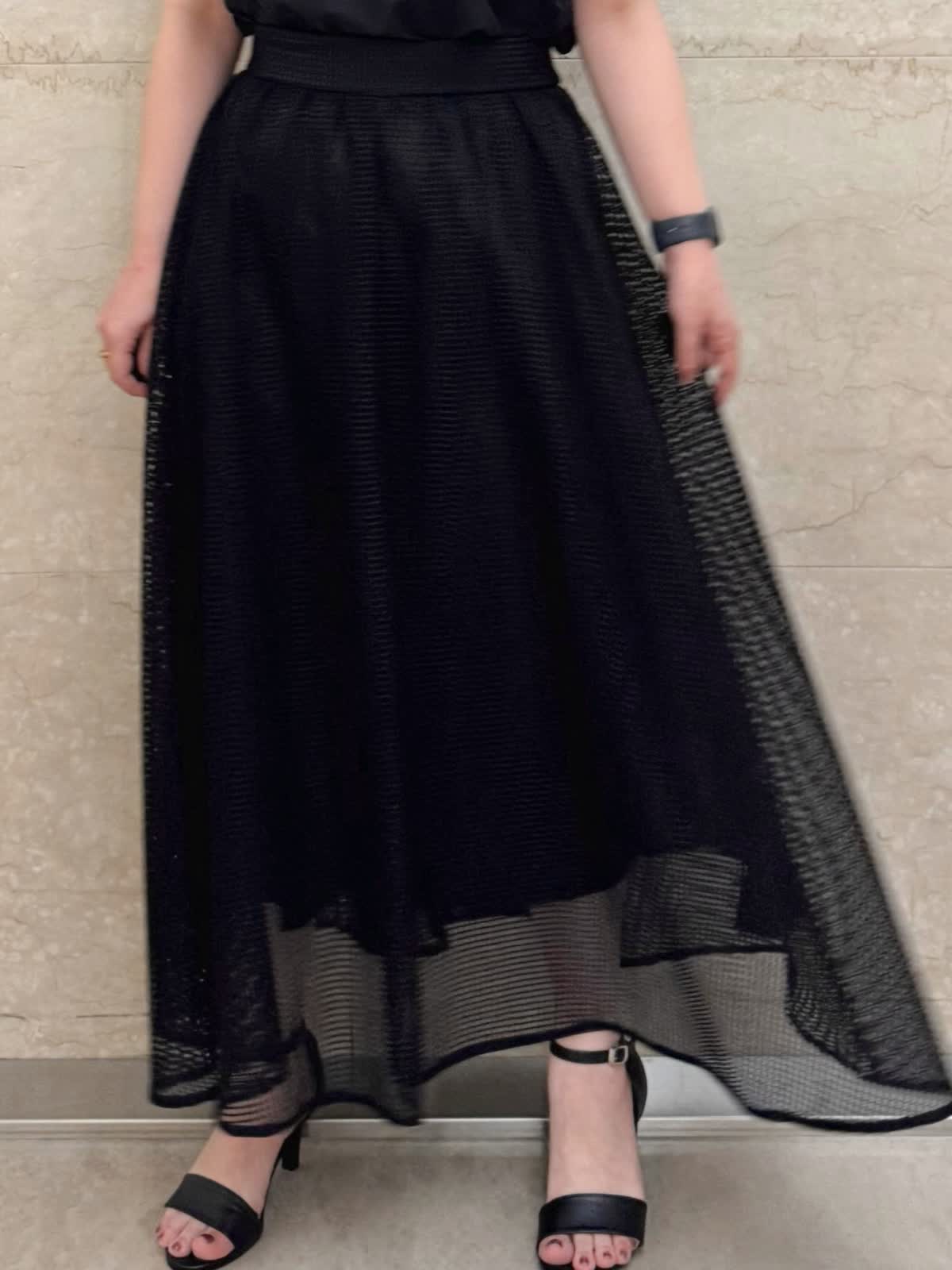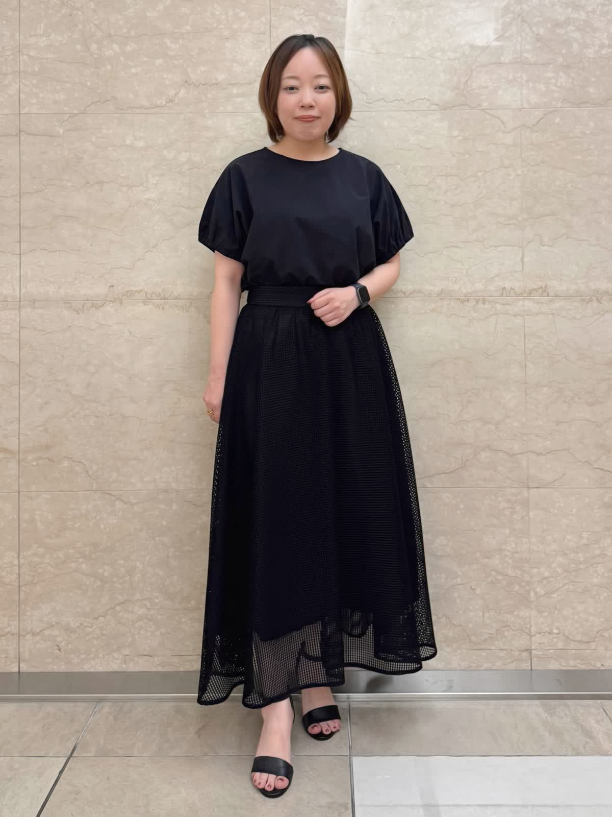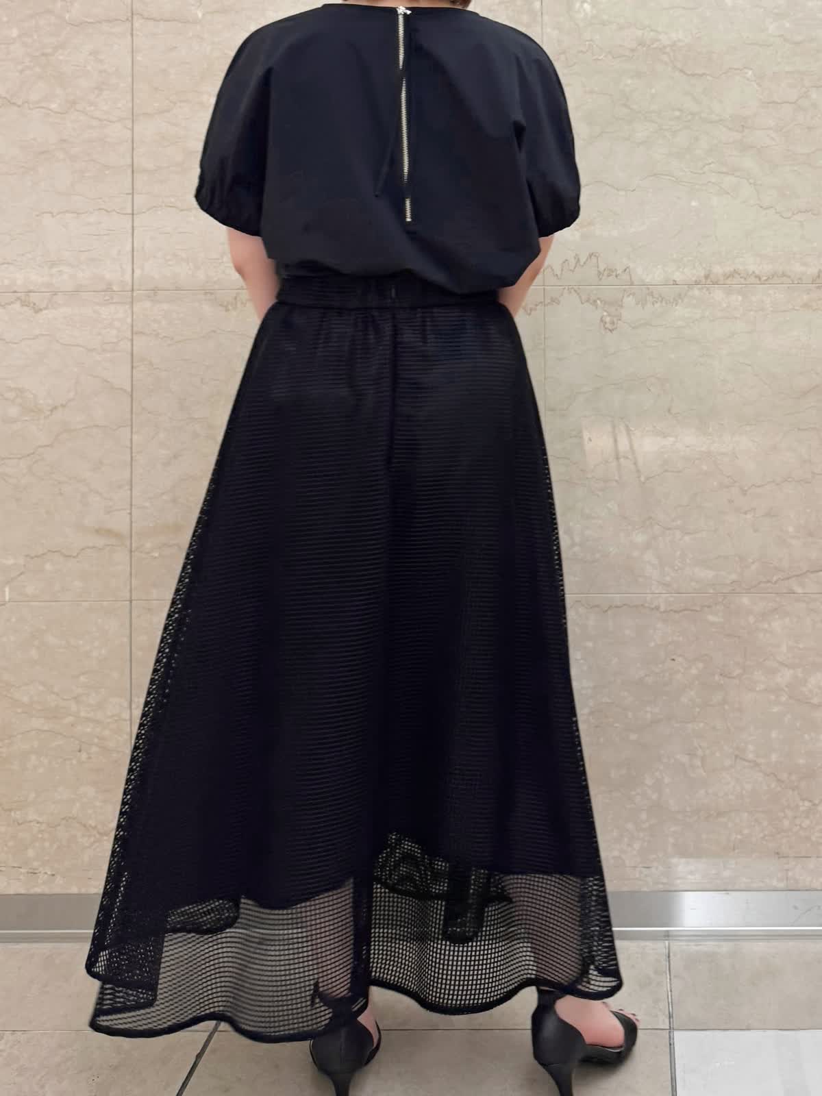 【着用カラー/サイズ】 ブラウス:ブラック/フリー スカート:ブラック/フリー お出掛けブラックコーデ。 トップスはギャザースリーブが二の腕もきちんとカバーしてくれます。 スクエアレースのスカートは足元のシアー感が涼しげ。甘過ぎないので幅広いシーンで着やすい大人可愛いスカートです。
