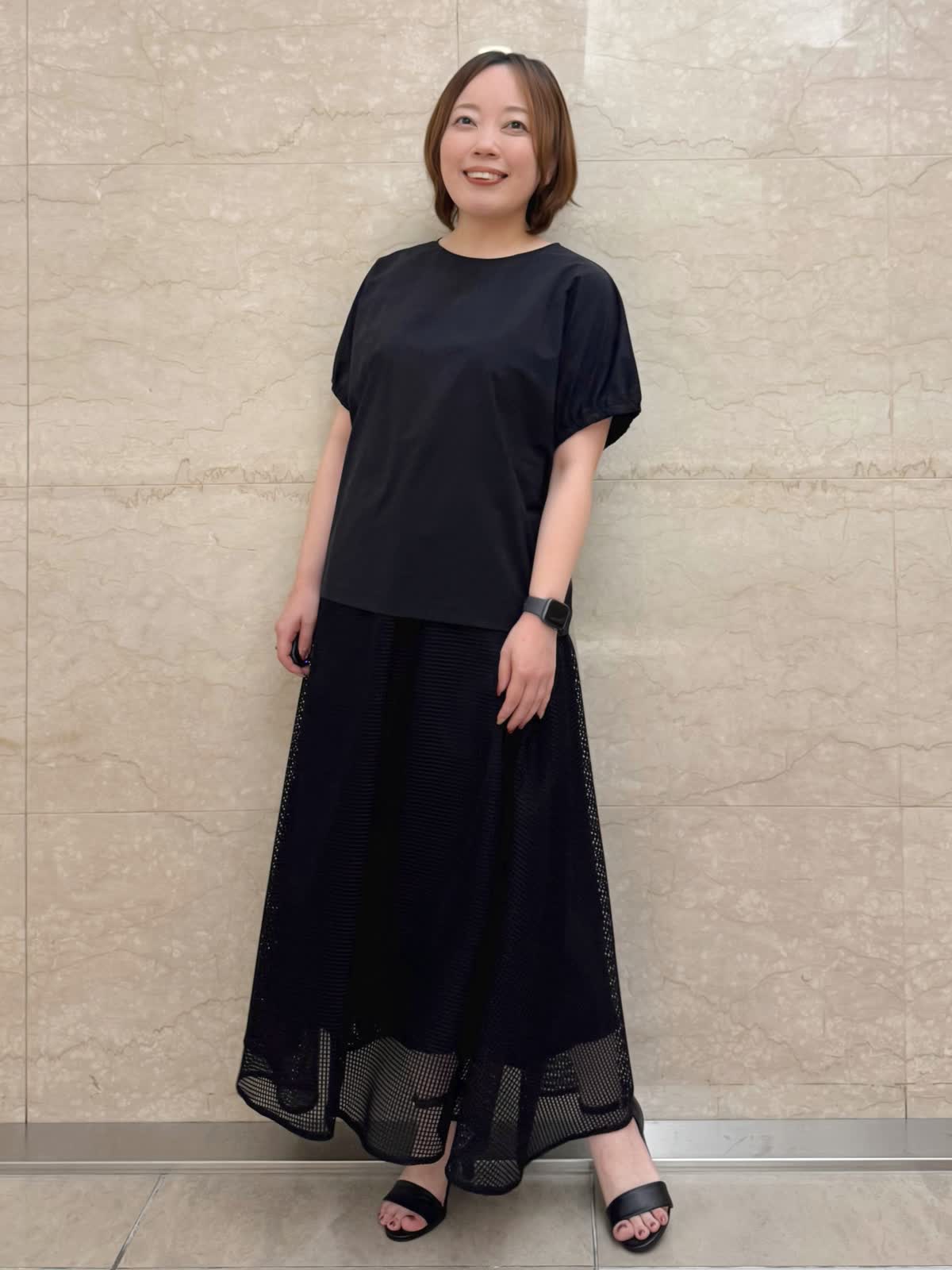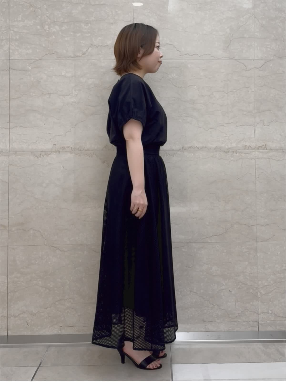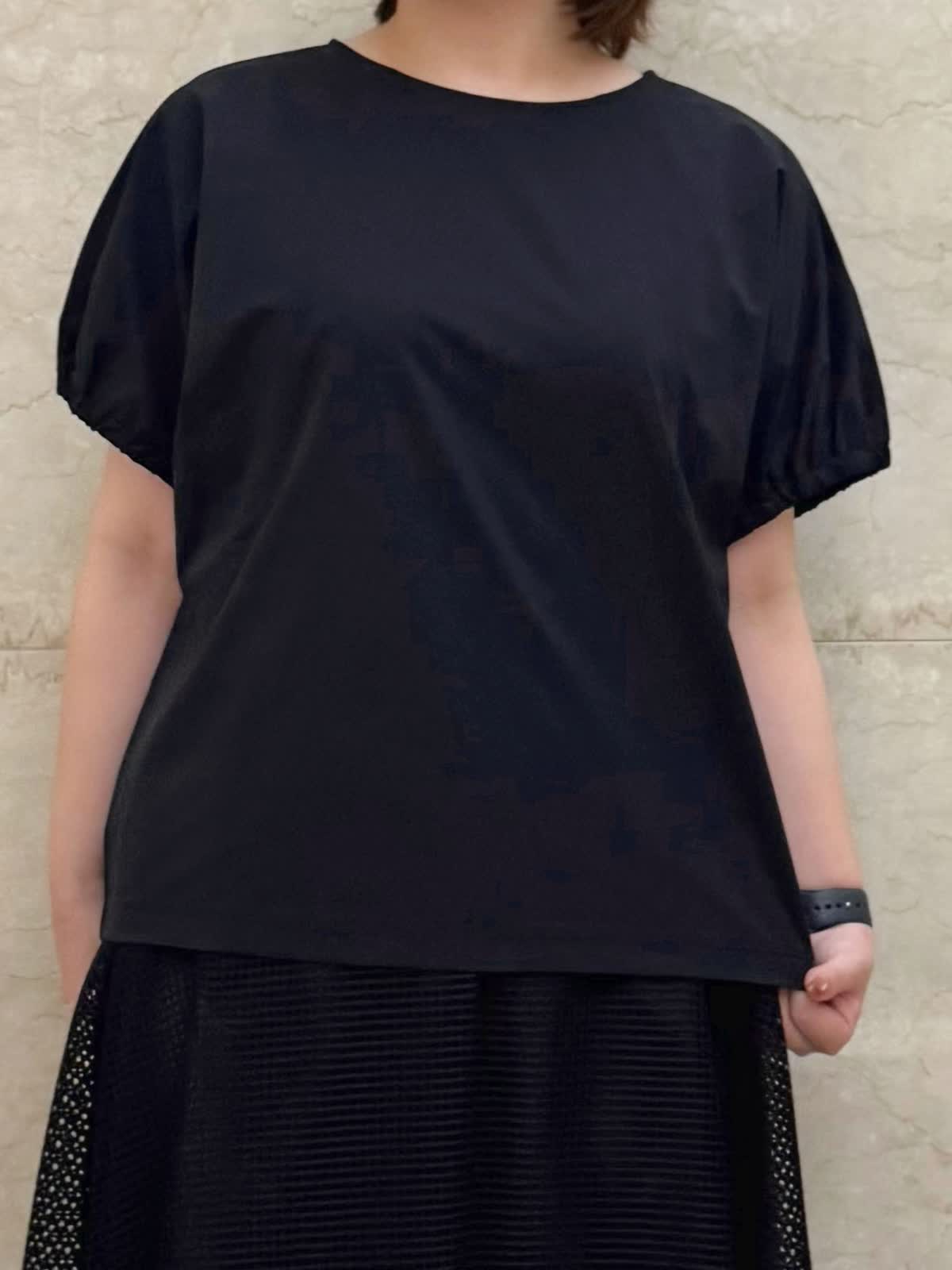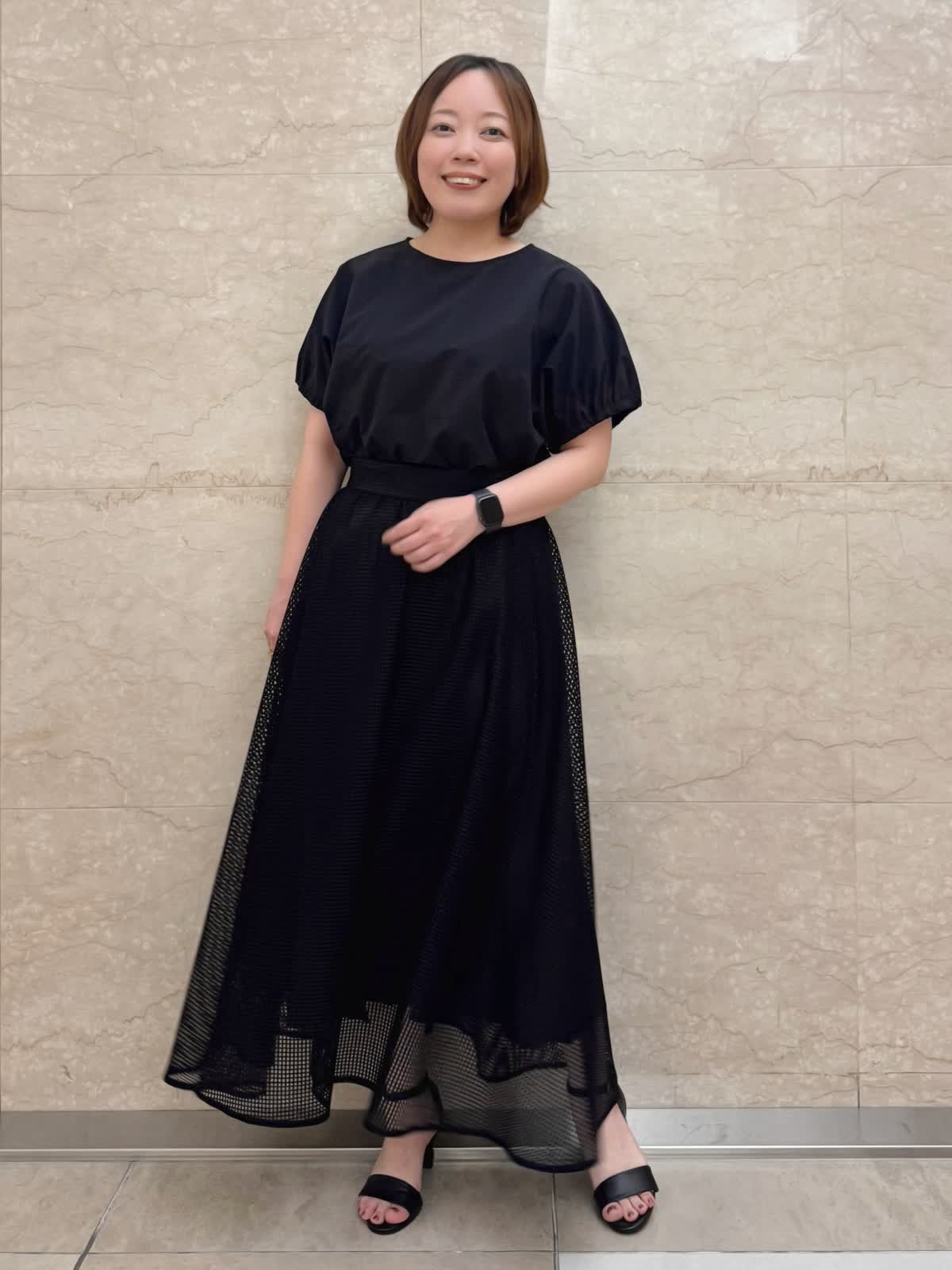 【着用カラー/サイズ】 ブラウス:ブラック/フリー スカート:ブラック/フリー お出掛けブラックコーデ。 トップスはギャザースリーブが二の腕もきちんとカバーしてくれます。 スクエアレースのスカートは足元のシアー感が涼しげ。甘過ぎないので幅広いシーンで着やすい大人可愛いスカートです。