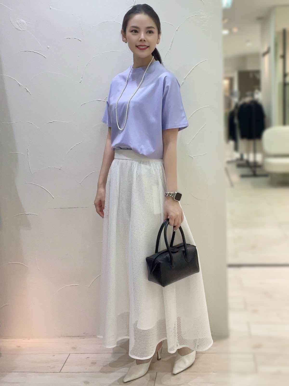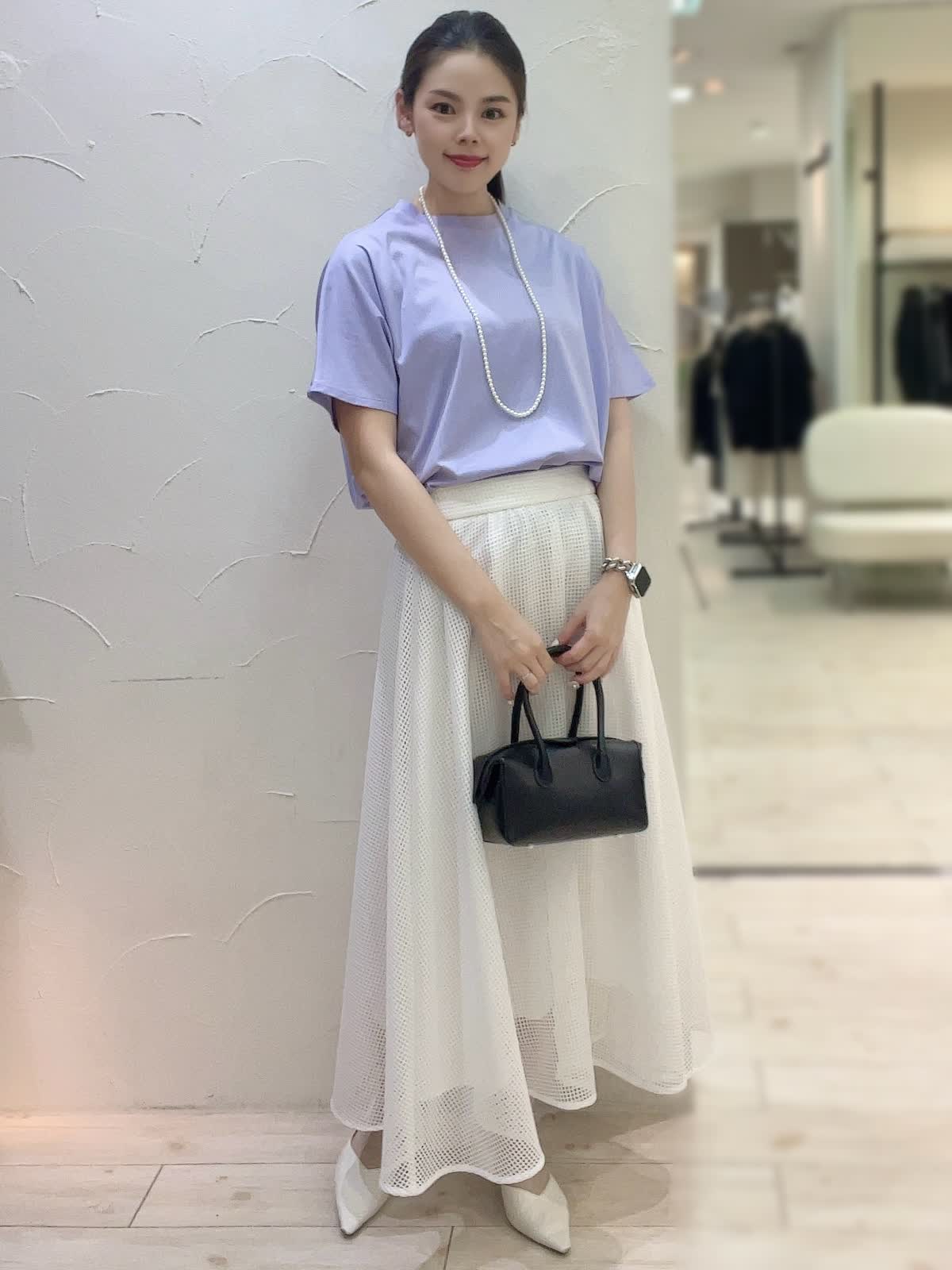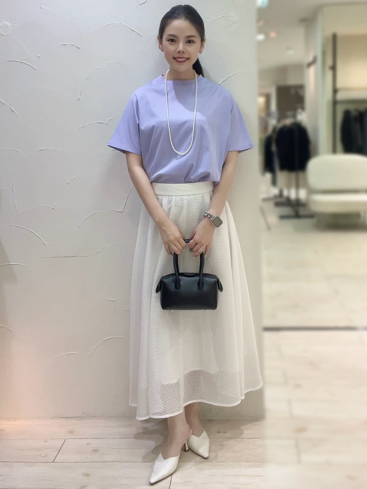 【着用サイズ】全て9号orフリーサイズ 【着用カラー】カットソー:パープル スカート:オフホワイト ネックレス:パール バック:ブラック 上品なお出かけコーディネート。トップスは接触冷感素材で涼しく快適にお召しいただけるお素材。動くたび上品に揺れるフレアラインのスカートで女性らしくお召しいただけます。