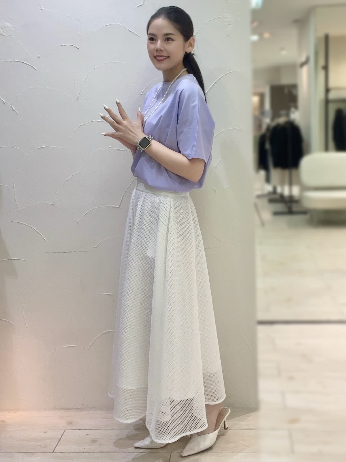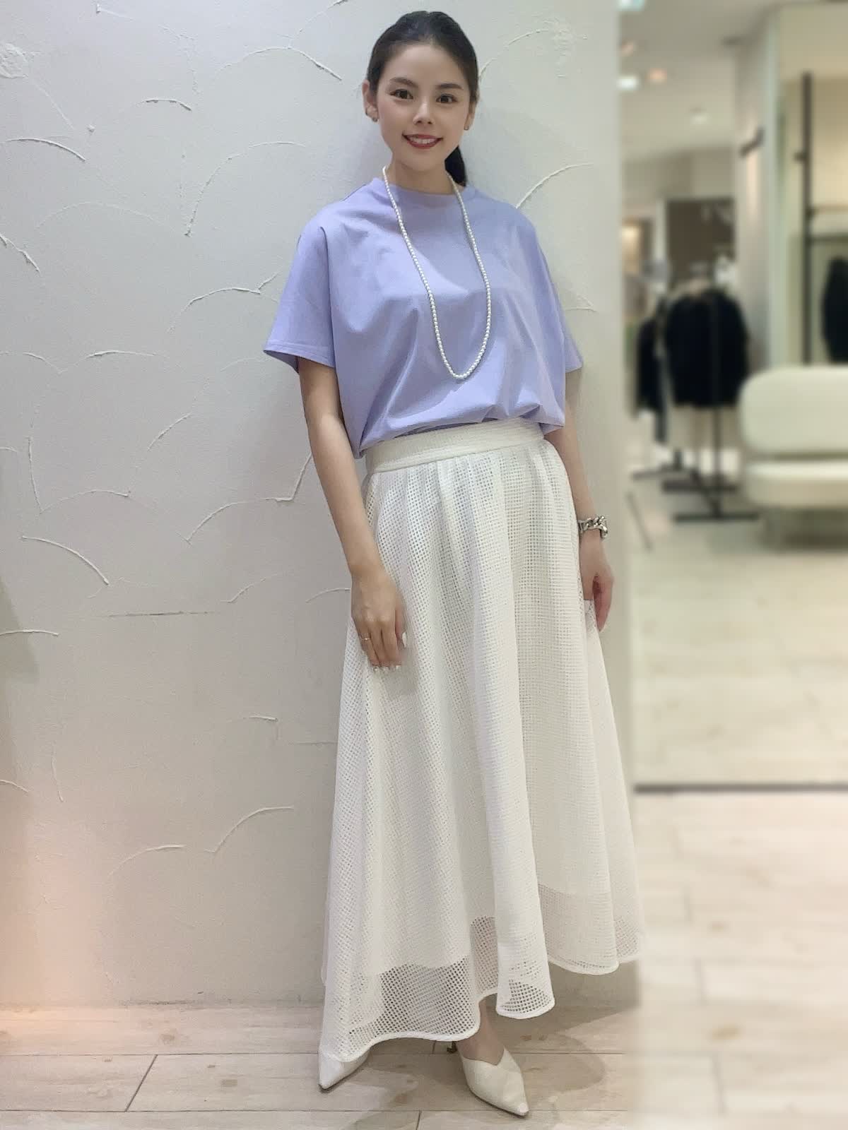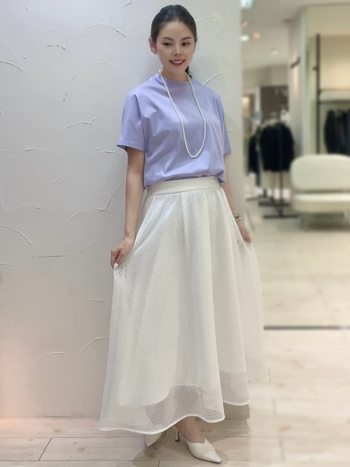 【着用サイズ】全て9号orフリーサイズ 【着用カラー】カットソー:パープル スカート:オフホワイト ネックレス:パール バック:ブラック 上品なお出かけコーディネート。トップスは接触冷感素材で涼しく快適にお召しいただけるお素材。動くたび上品に揺れるフレアラインのスカートで女性らしくお召しいただけます。