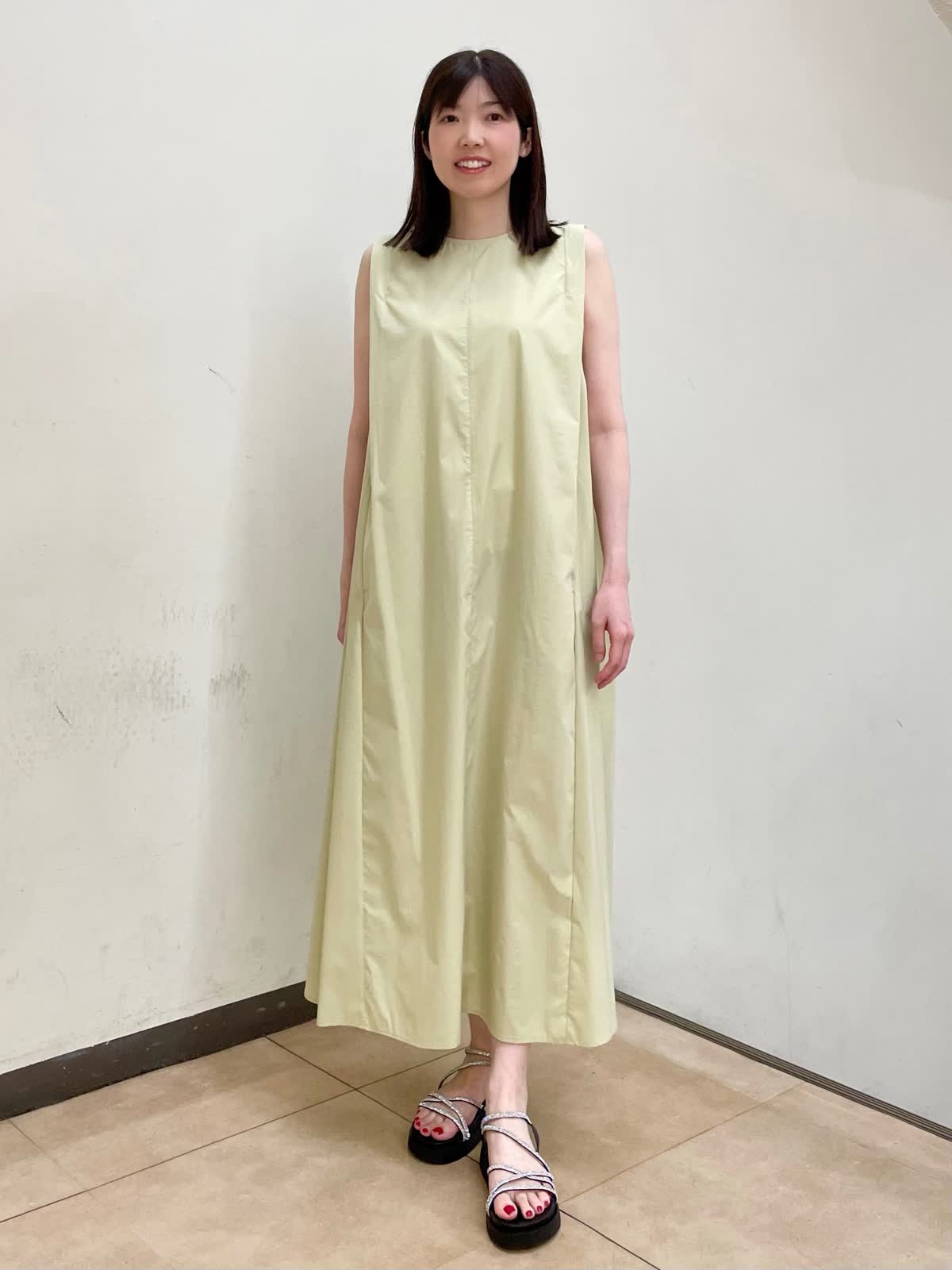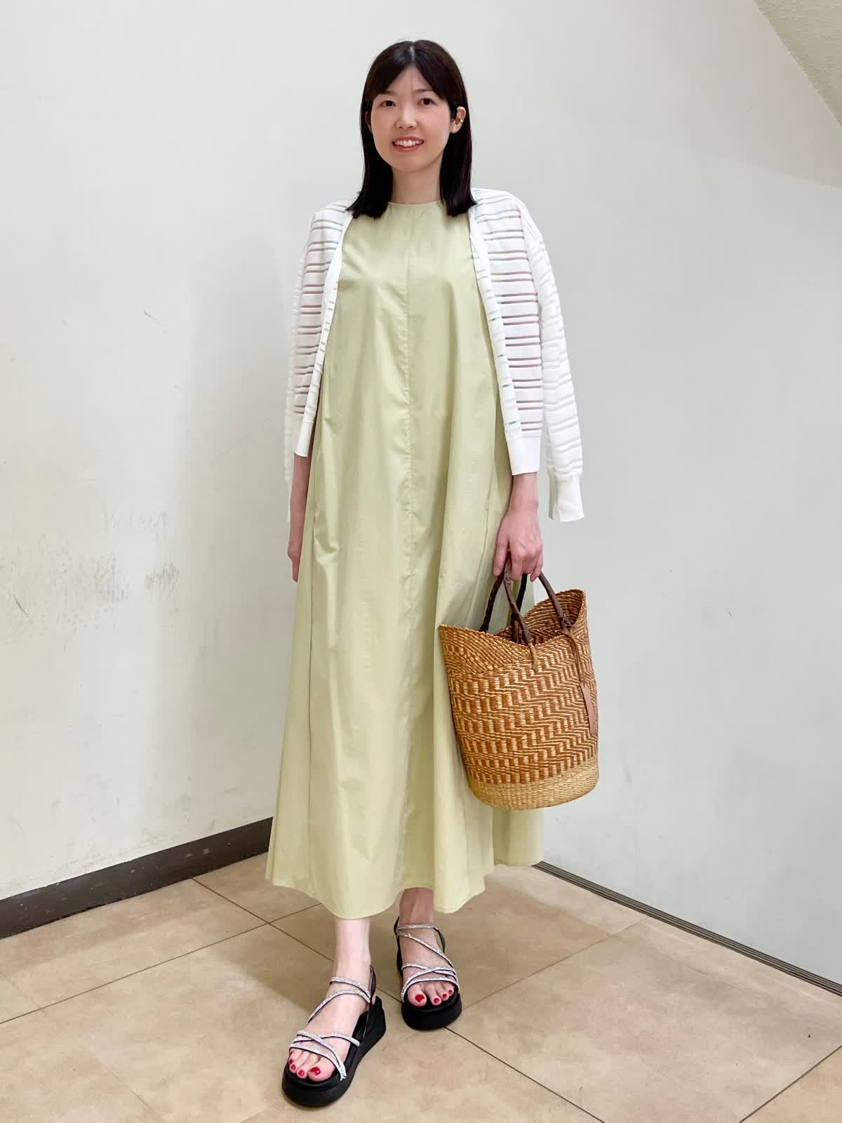 【着用サイズ】ワンピース:9号 カーディガン:フリー ノースリーブフレアワンピースは肩部分のタックが気になる二の腕ラインをカバーしてくれます。軽くてシワになりにくく、撥水加工やUVカット効果もある優れもの。旅行などお出掛けにもおすすめです。シーアな糸をボーダー状に編みたてたカーディガンはコンパクトな丈感でワンピースにもバランスよく着ていただけます。