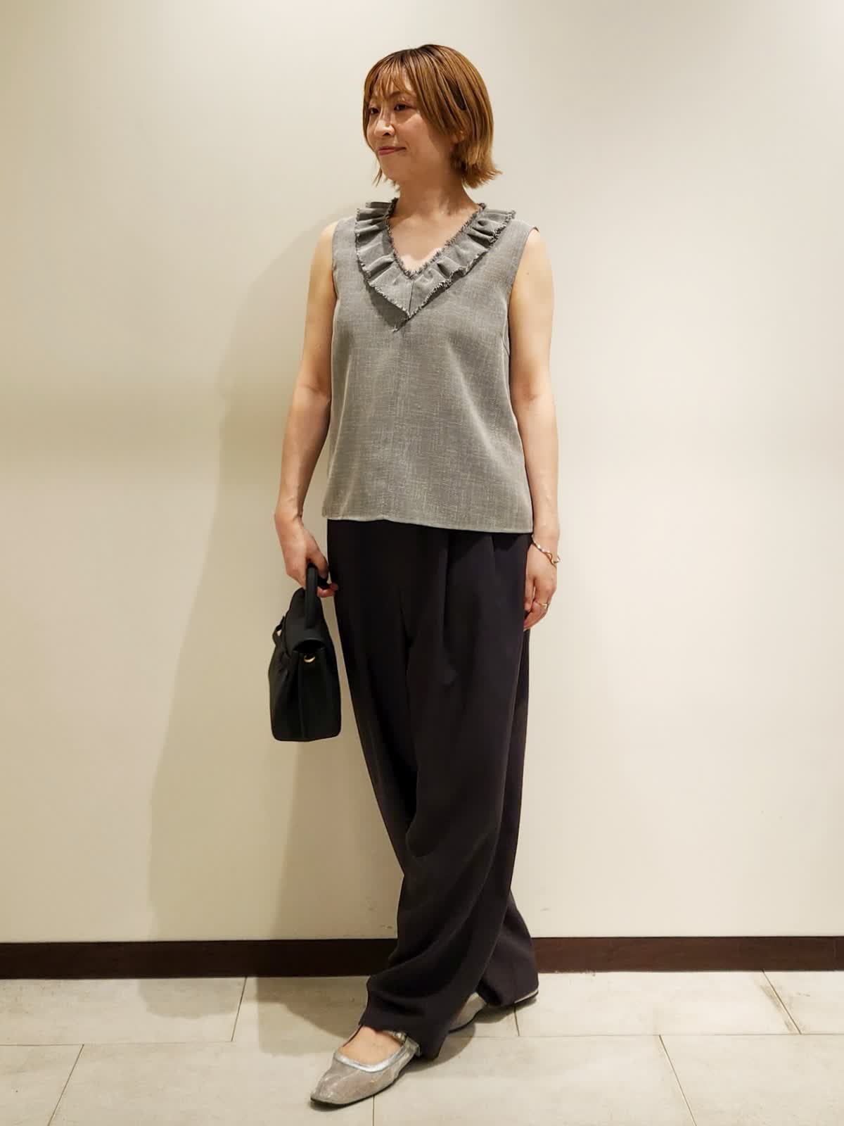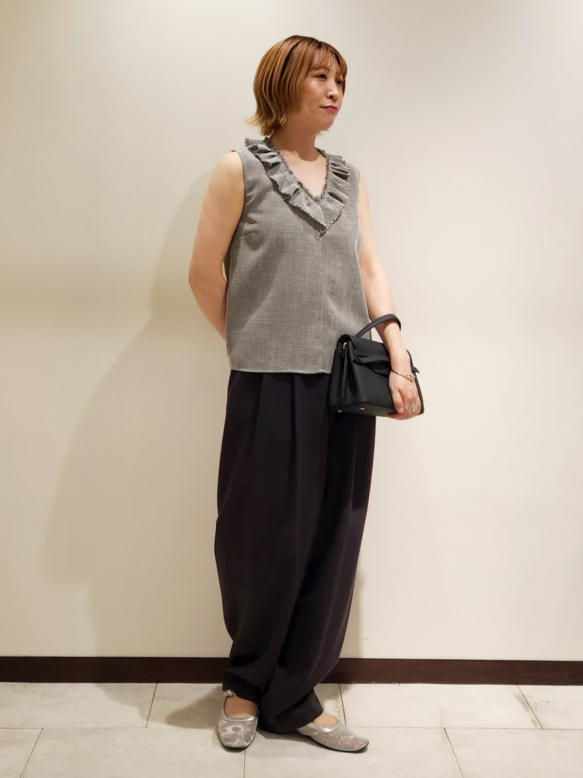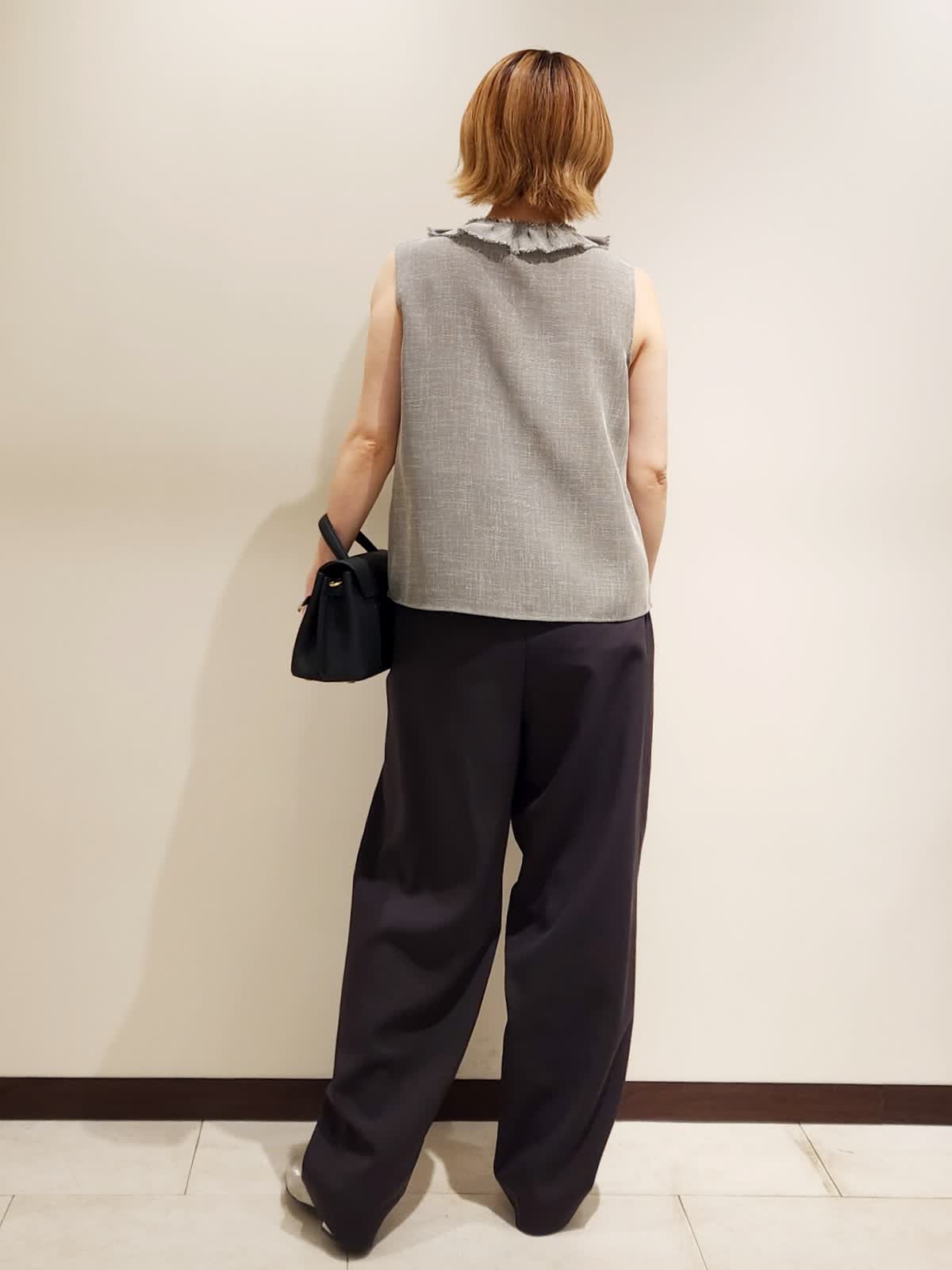 【着用サイズ】すべて9号 【着用カラー】ブラウス:グレー パンツ:チャコールグレー 夏にフリルブラウスでイメチェンコーデ。フリルの甘さにモード感あるパンツを合わせて程よい大人モードに仕上げました。ブラウスは気をつかわない軽やかな質感でラフさがちょうど良いです。パンツはシルエット間違いなしの三尋木さんコラボ!!