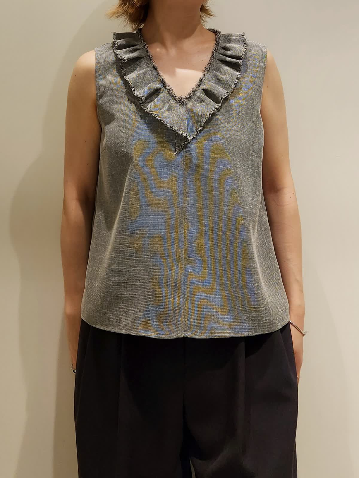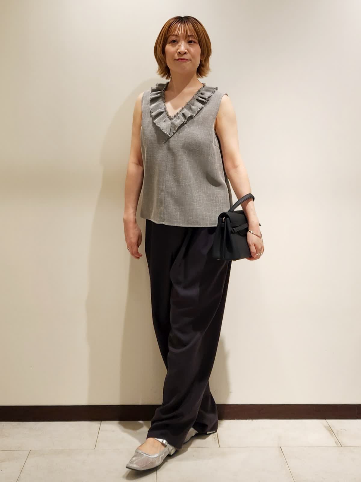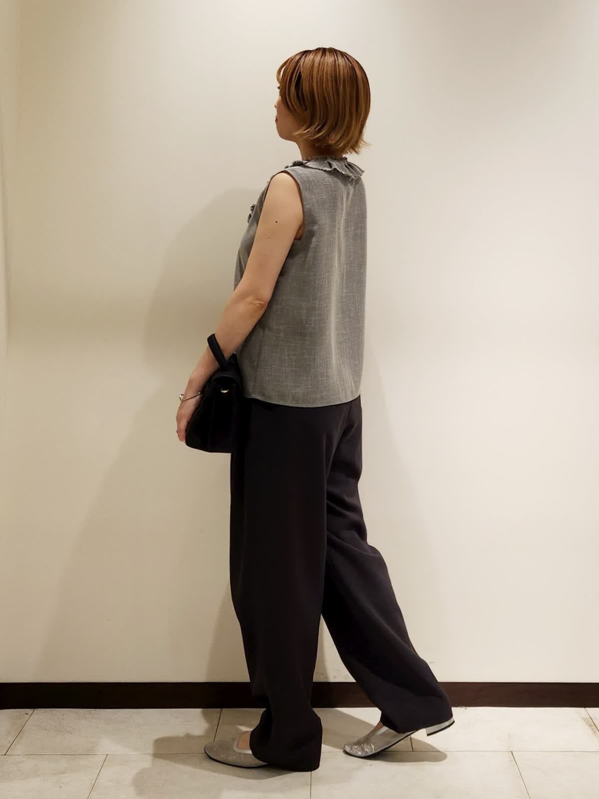 【着用サイズ】すべて9号 【着用カラー】ブラウス:グレー パンツ:チャコールグレー 夏にフリルブラウスでイメチェンコーデ。フリルの甘さにモード感あるパンツを合わせて程よい大人モードに仕上げました。ブラウスは気をつかわない軽やかな質感でラフさがちょうど良いです。パンツはシルエット間違いなしの三尋木さんコラボ!!