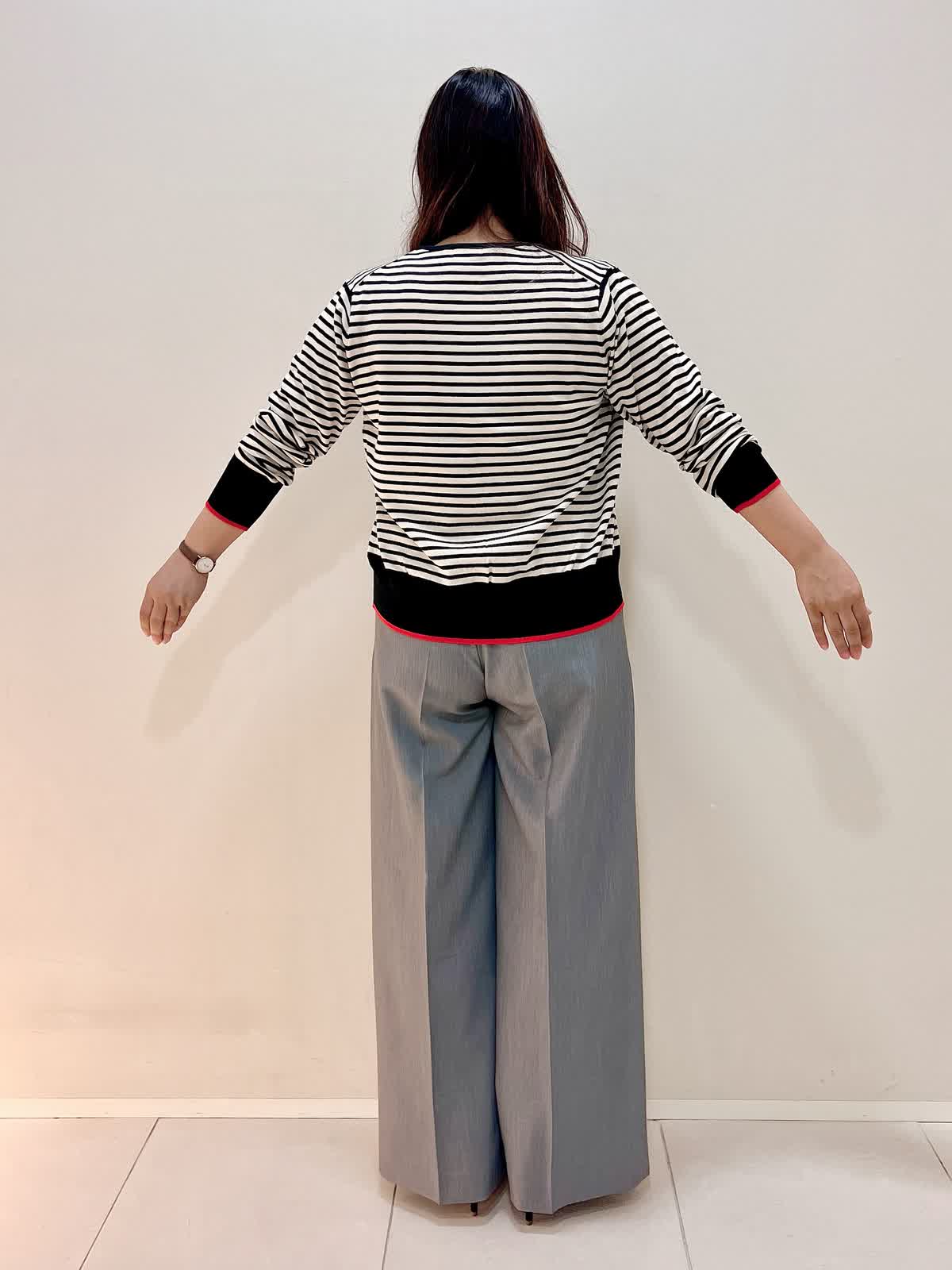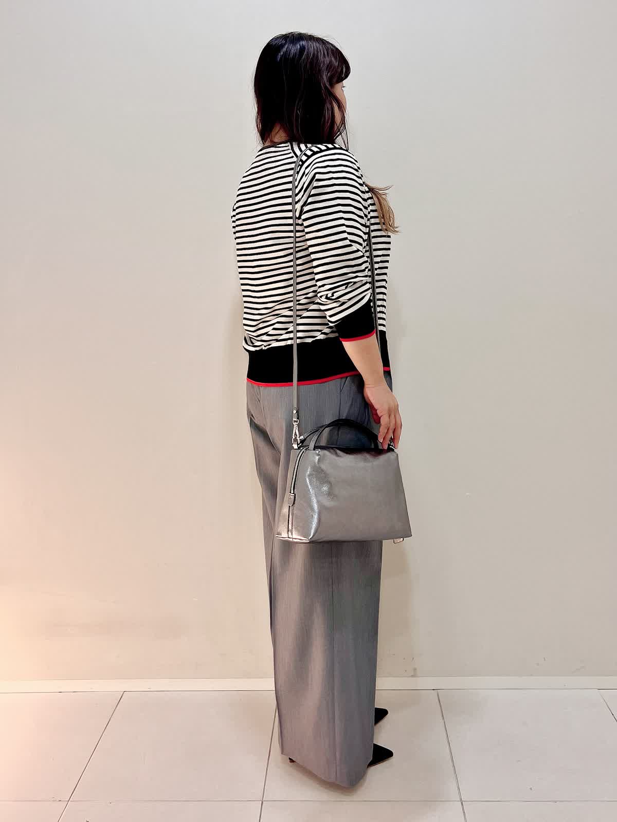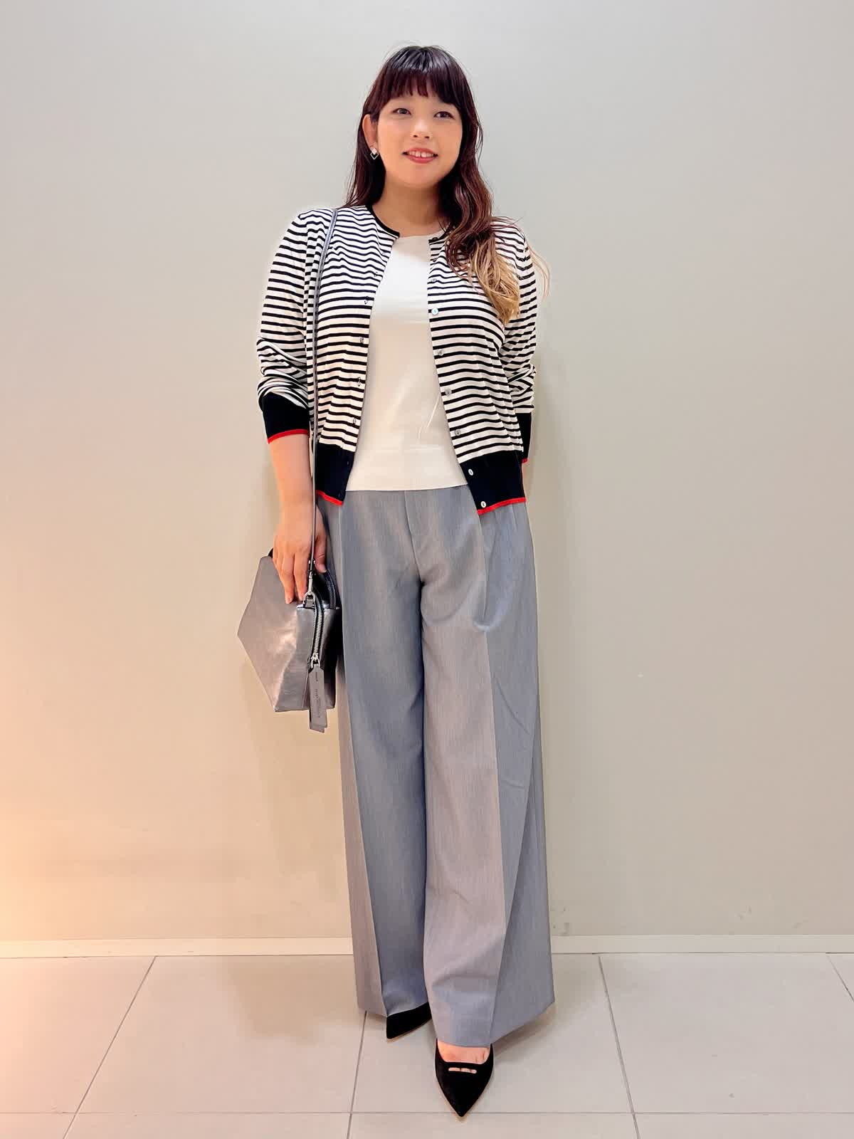 【着用サイズ】アンサンブル:11号 パンツ:11号 【着用カラー】アンサンブル:アイボリー パンツ:モクグレー バッグ:シルバー カラーをまとめたシンプルスタイル。 しなやかで柔らかい肌触りのアンサンブルは抗菌加工が施してあり機能性アップ。5分袖無地のインナーニットと長袖のカーディガンなので単品それぞれで着回しを楽しめるセットです。ボーダーは袖口と裾のカラーがコーディネートのポイントになります。 ラインのキレイなワイドパンツはウエスト内側に両サイドアジャスターが付いておりサイズ調節が可能。グレーはシーズン長く秋カラーのお洋服とも合わせやすくお勧めです。
