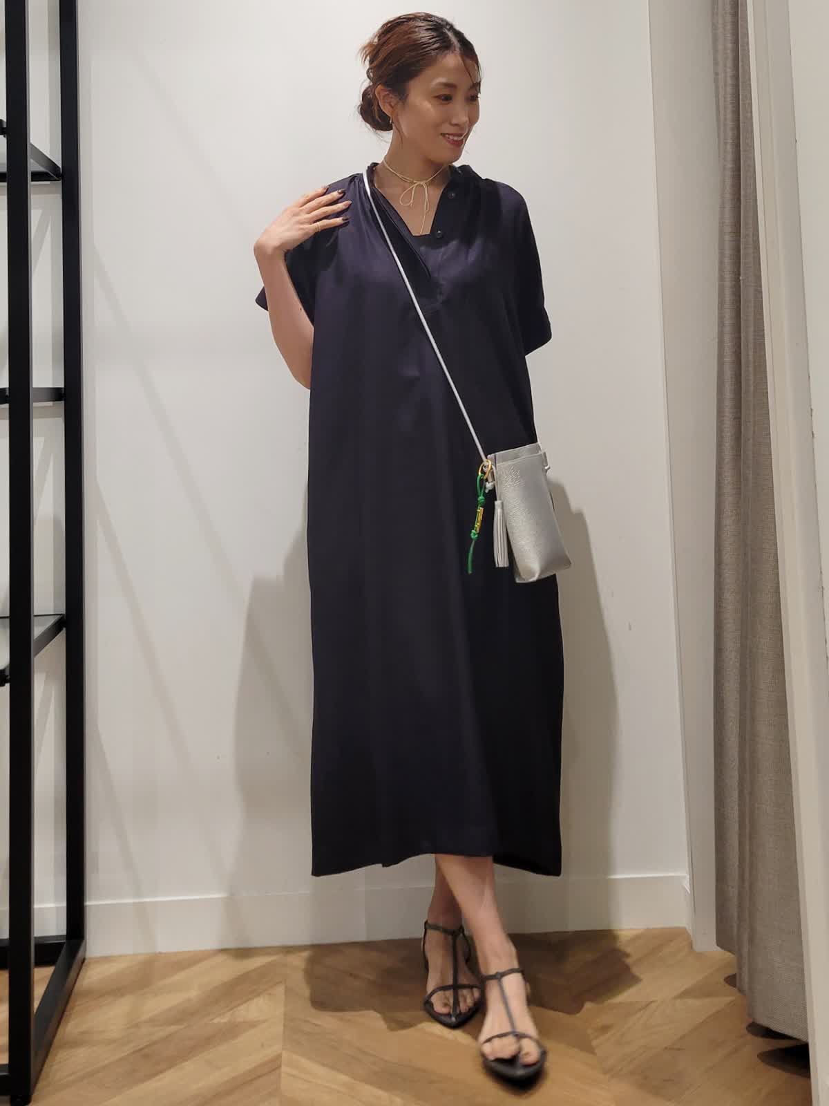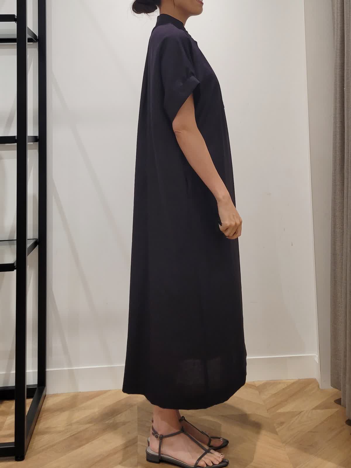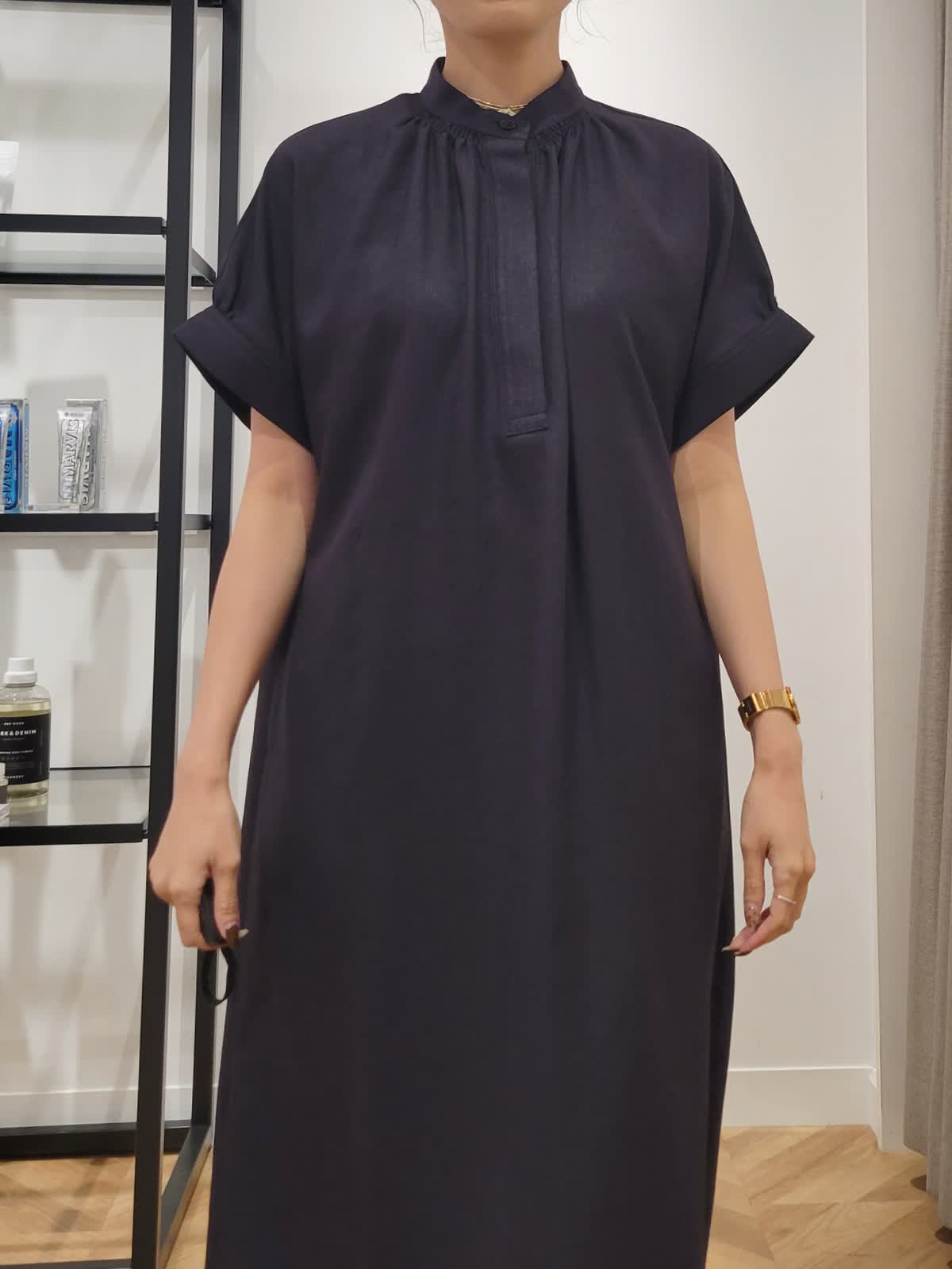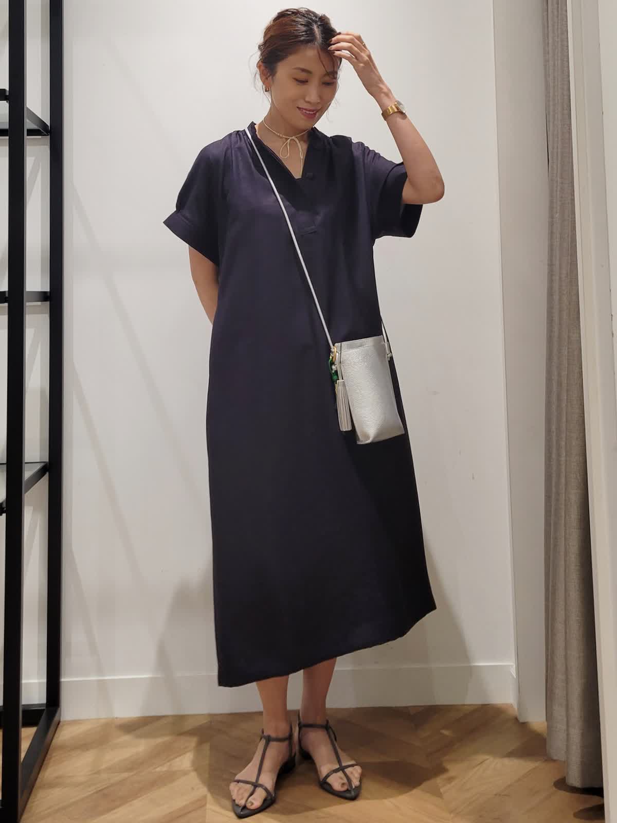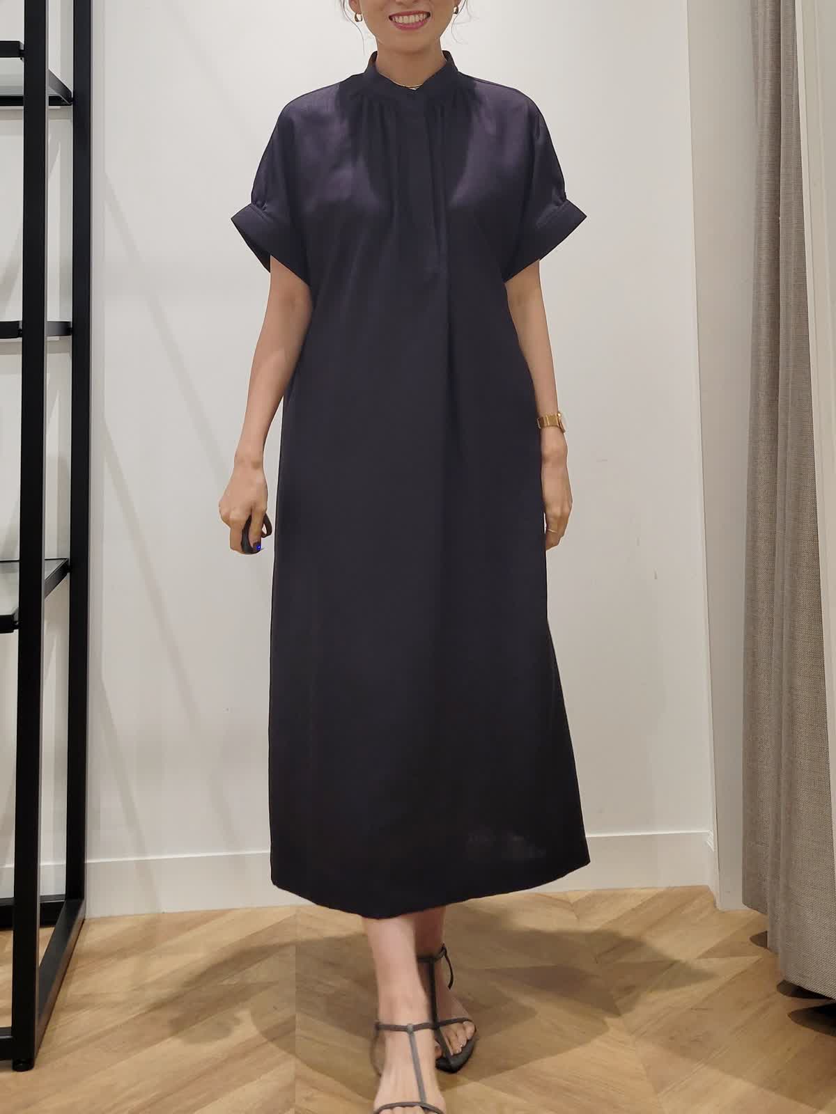 【着用サイズ】ワンピース:ネイビー:7号 リネンライクワンピース。 麻見えシリーズ。二の腕やウエストヒップなど気になるところをカバーしてくれるデザイン。ざっくり着ていただけるので風の通りもよく心地よく着ていただけます。胸元のボタンを開けてガラリと印象を変えて着ていただくのもおすすめです。気温が下がってきたらインナーに長袖をレイヤードしていただくのもおすすめです。ワイドパンツなどを合わせて裾から見せるのもお洒落。是非色々アレンジしてみてください♪