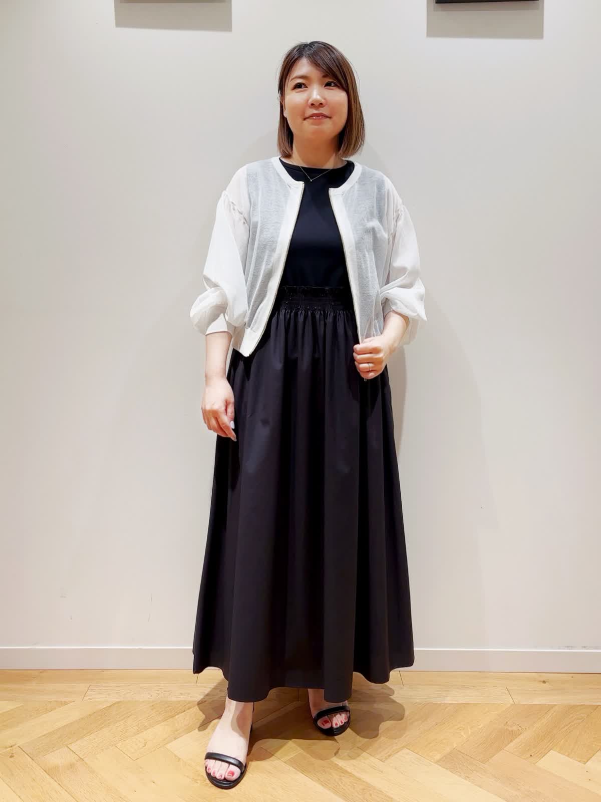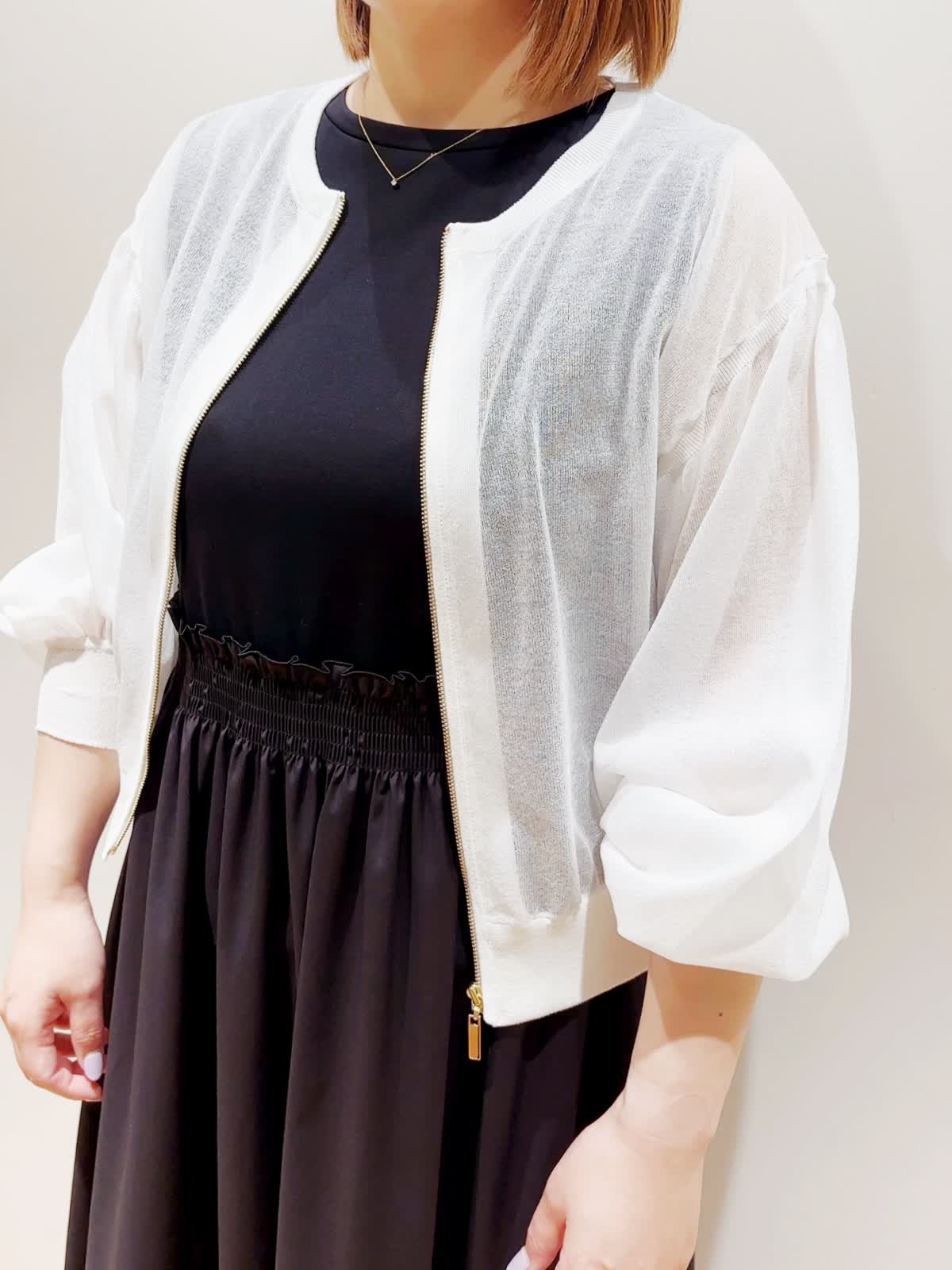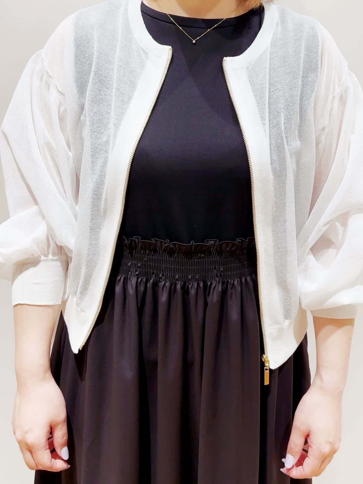 【着用サイズ】カーディガン:9号ワンピース:9号 【着用カラー】カーディガン:オフホワイト ワンピース:ブラック 楽ちんワンピースコーディネート。ウエストゴムでぴったりしすぎないストレスフリーのワンピースです。洗えてシワになりにくいのもポイント。カーディガンはシアー感があり夏から秋にかけて羽織れます。袖口を上げるとふんわりとしたボリューム感も楽しめます。女子会や旅行など、幅広く活躍します。