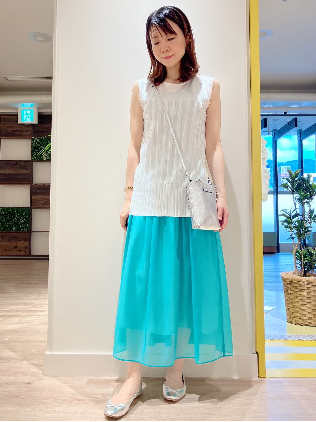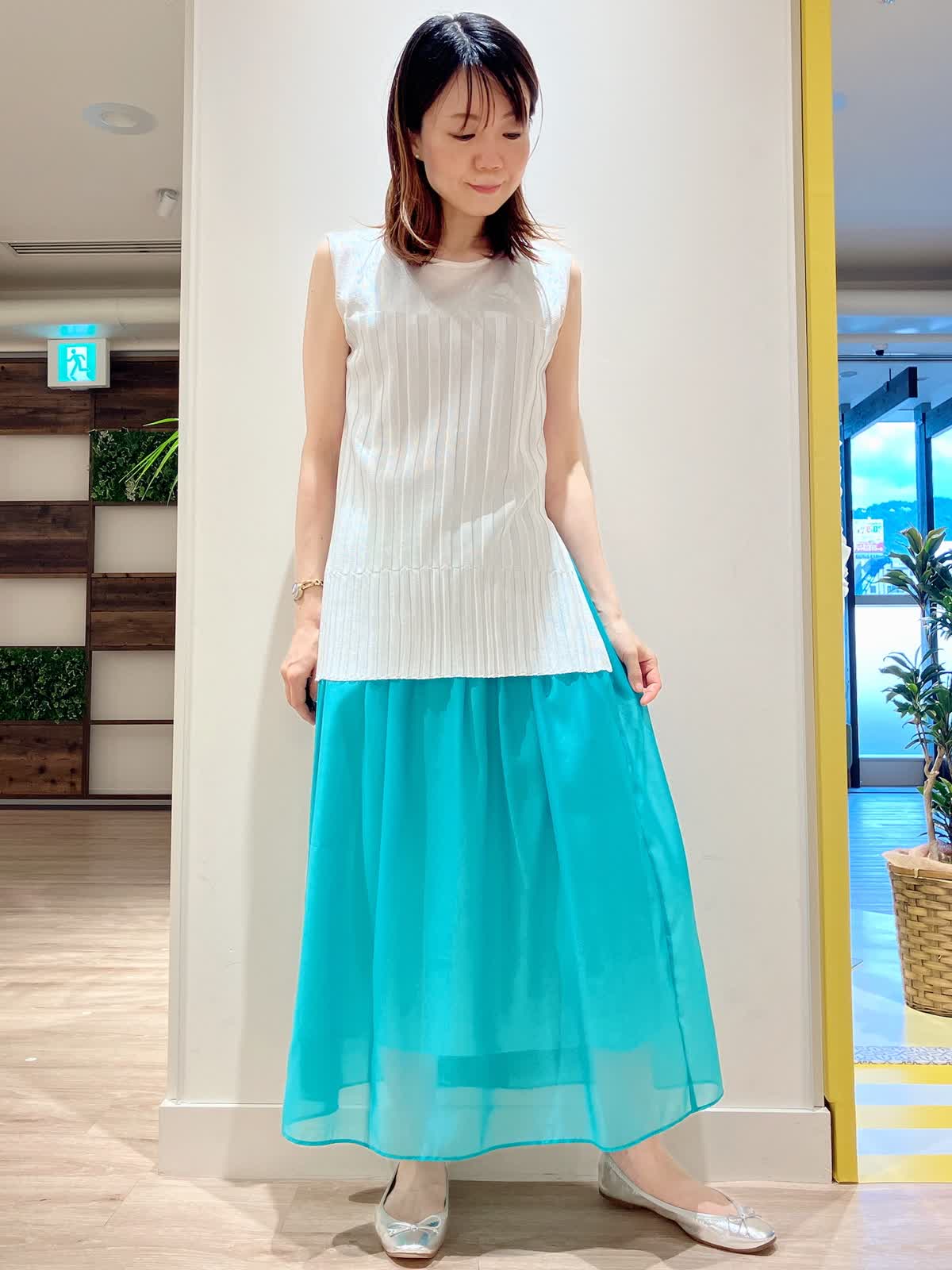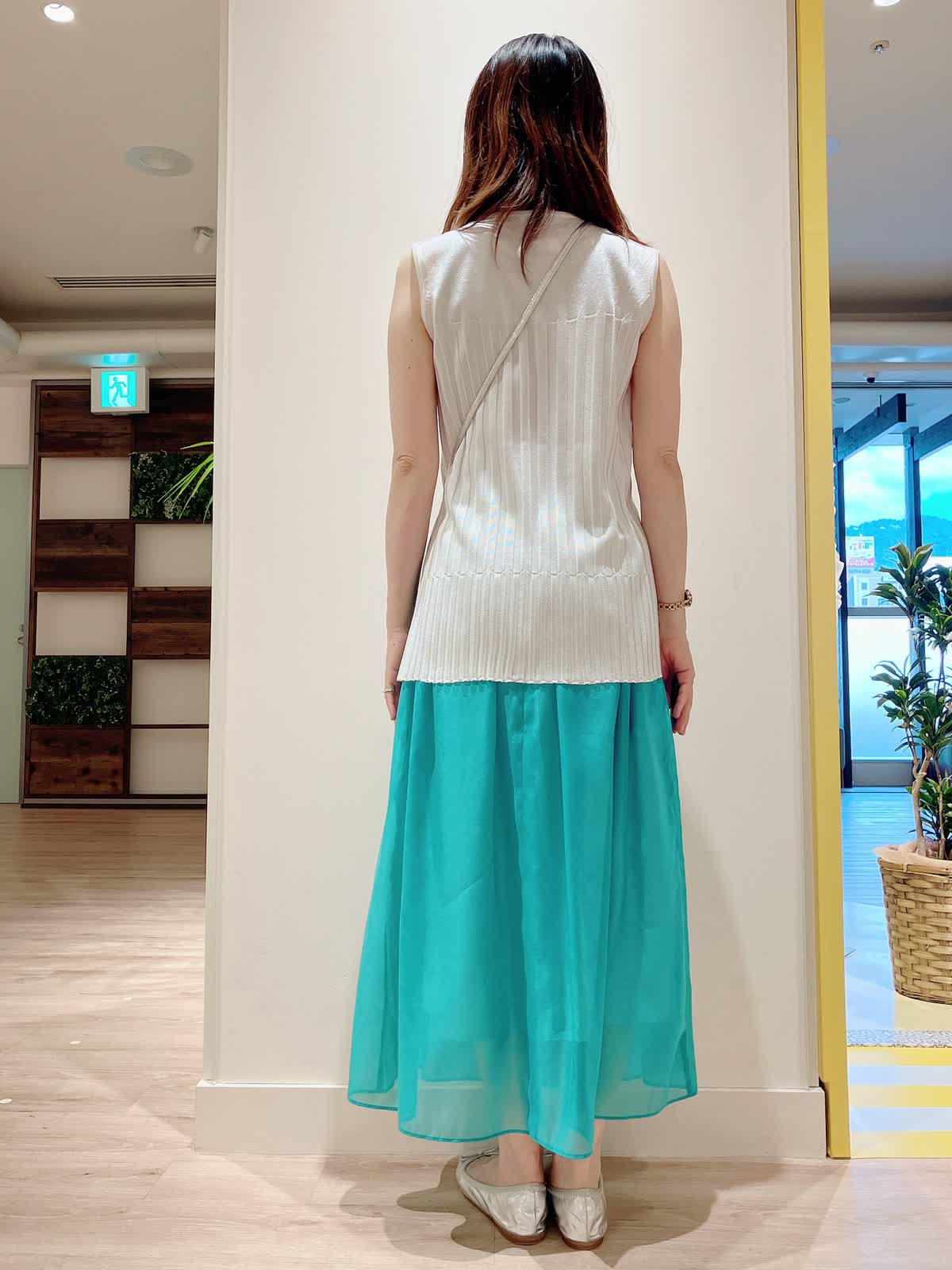 【着用サイズ】ニット:9号 スカート:7号 【着用カラー】ニット:オフホワイト スカート:ペールグリーン コーディネートのテーマはランチスタイリングです。シアー素材のペールグリーンのスカートは1枚でも着映え間違いなし。艶感のあるノースリーブニットで、Iラインのすっきりしたコーディネートに。小物はシルバー系で合わせて涼やかな印象に。ランチや、お出かけにおすすめのコーディネートです。