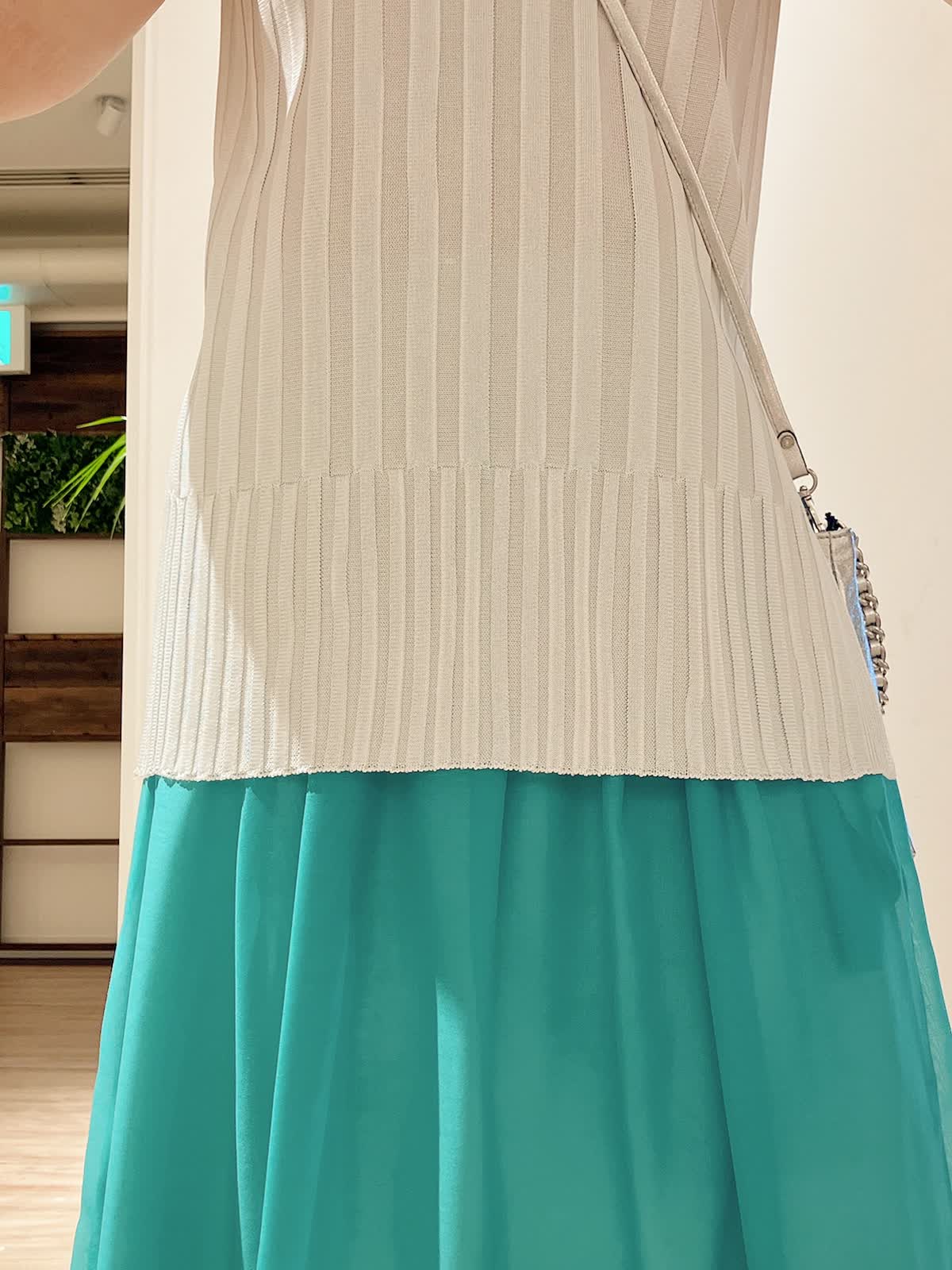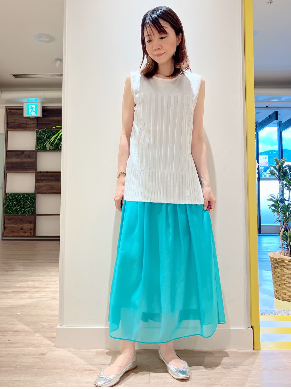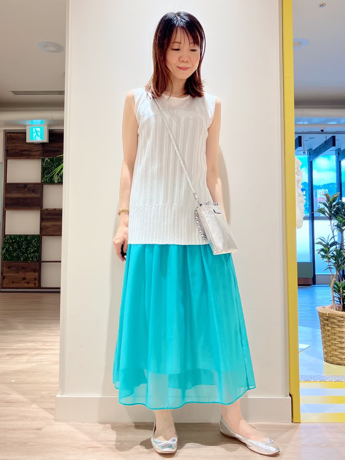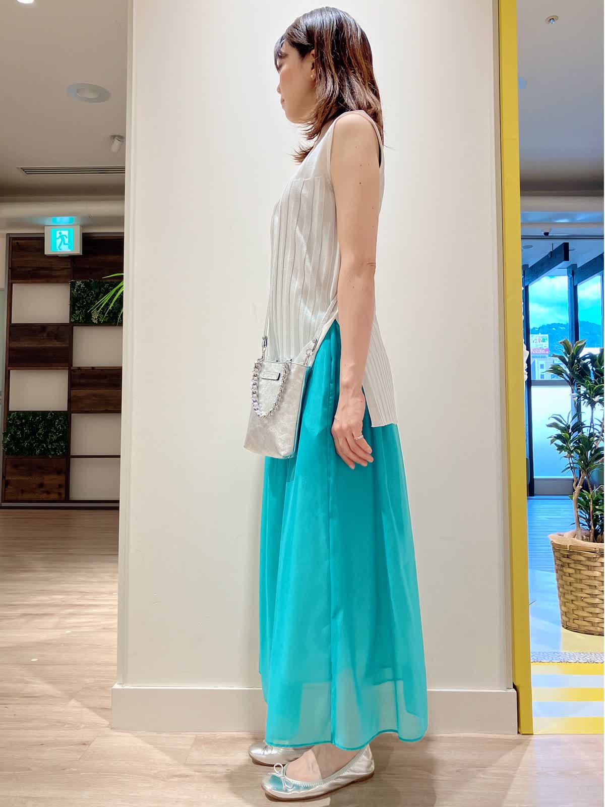【着用サイズ】ニット:9号 スカート:7号 【着用カラー】ニット:オフホワイト スカート:ペールグリーン コーディネートのテーマはランチスタイリングです。シアー素材のペールグリーンのスカートは1枚でも着映え間違いなし。艶感のあるノースリーブニットで、Iラインのすっきりしたコーディネートに。小物はシルバー系で合わせて涼やかな印象に。ランチや、お出かけにおすすめのコーディネートです。