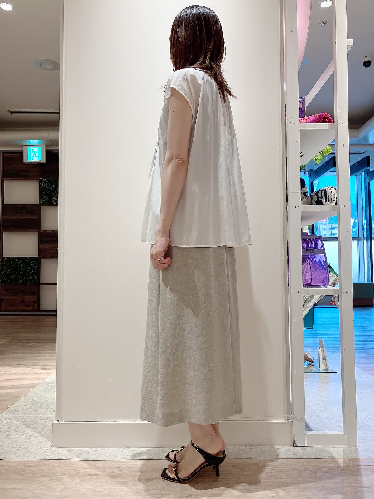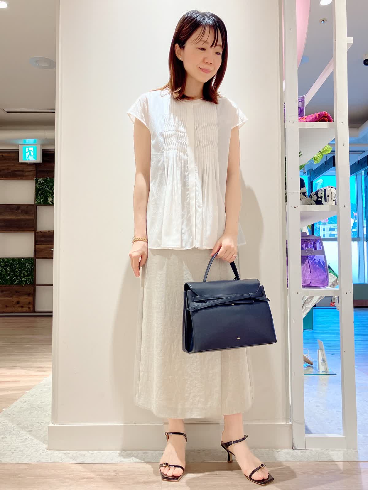 【着用サイズ】ブラウス:9号 スカート:7号 【着用カラー】ブラウス:オフホワイト スカート:ベージュ コーディネートのテーマは真夏の通勤スタイリングです。 ブラウスは、ピンタックが華やかでキュプラ素材なので涼しく着られます。お袖も少しあるので1枚でもオッケー。タイトめのスカートと合わせて、真夏の通勤にもおすすめです。