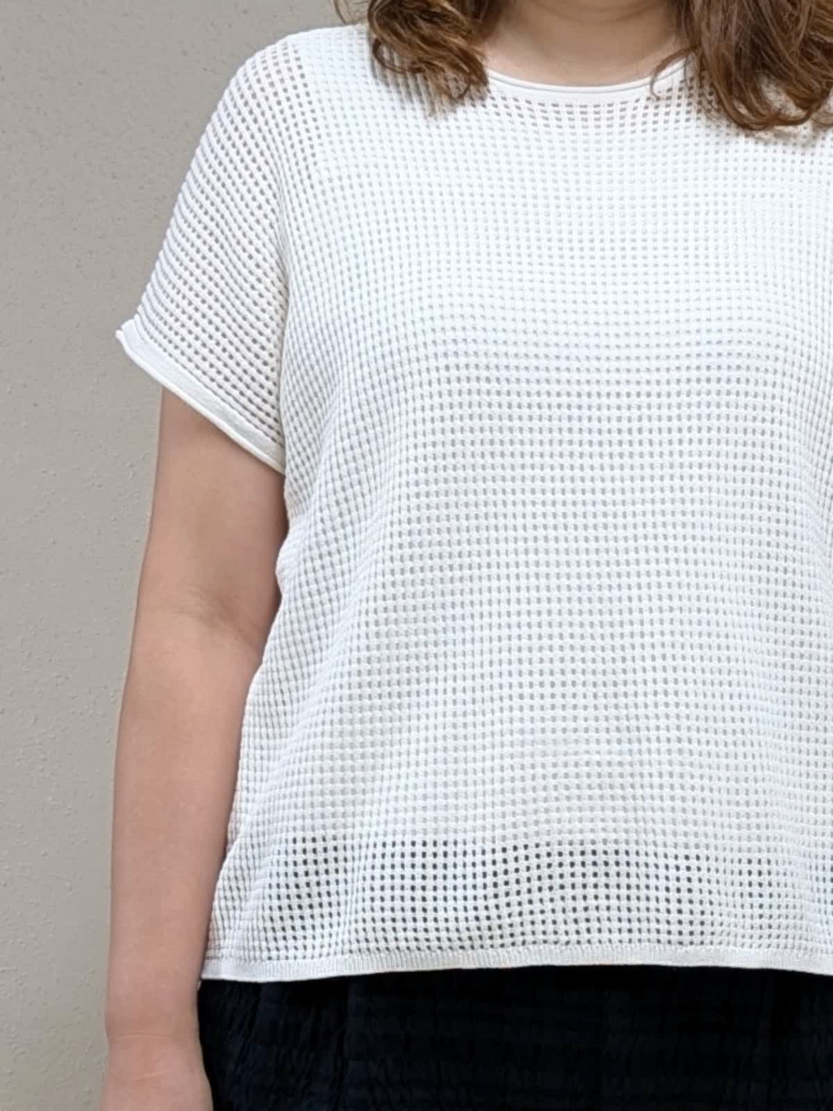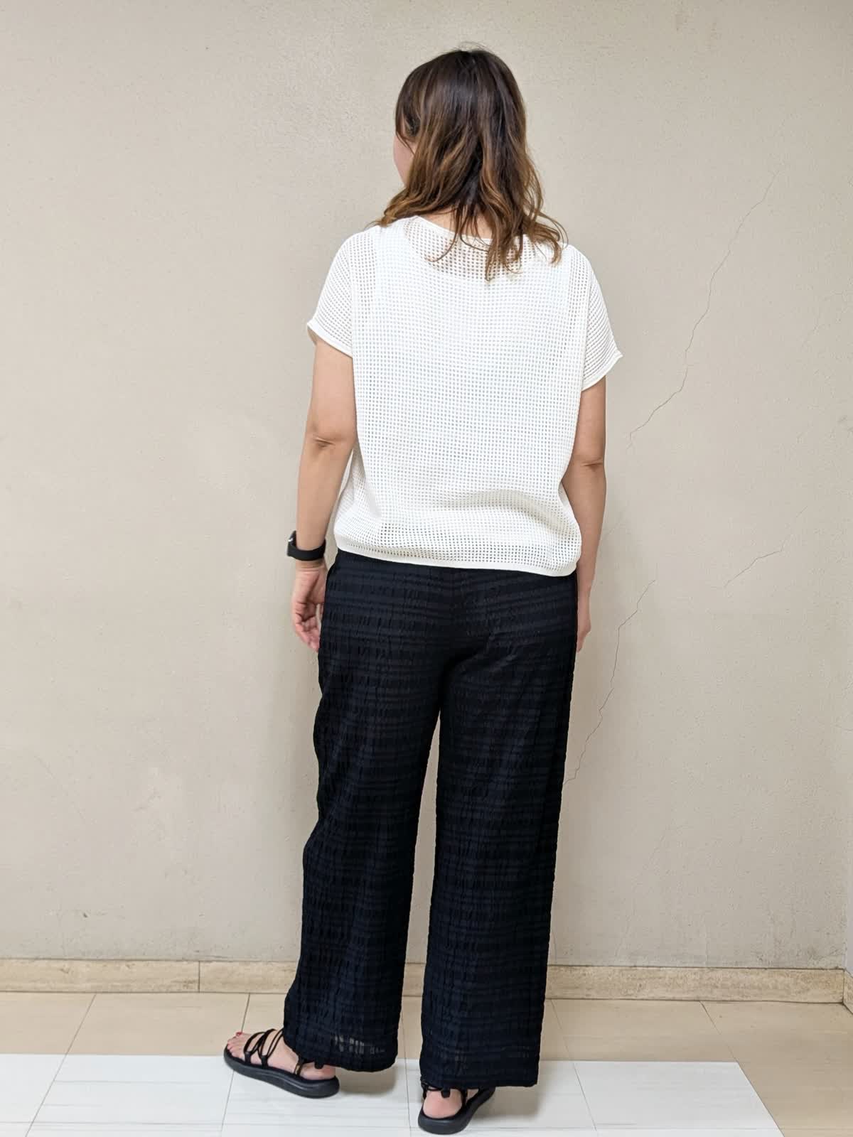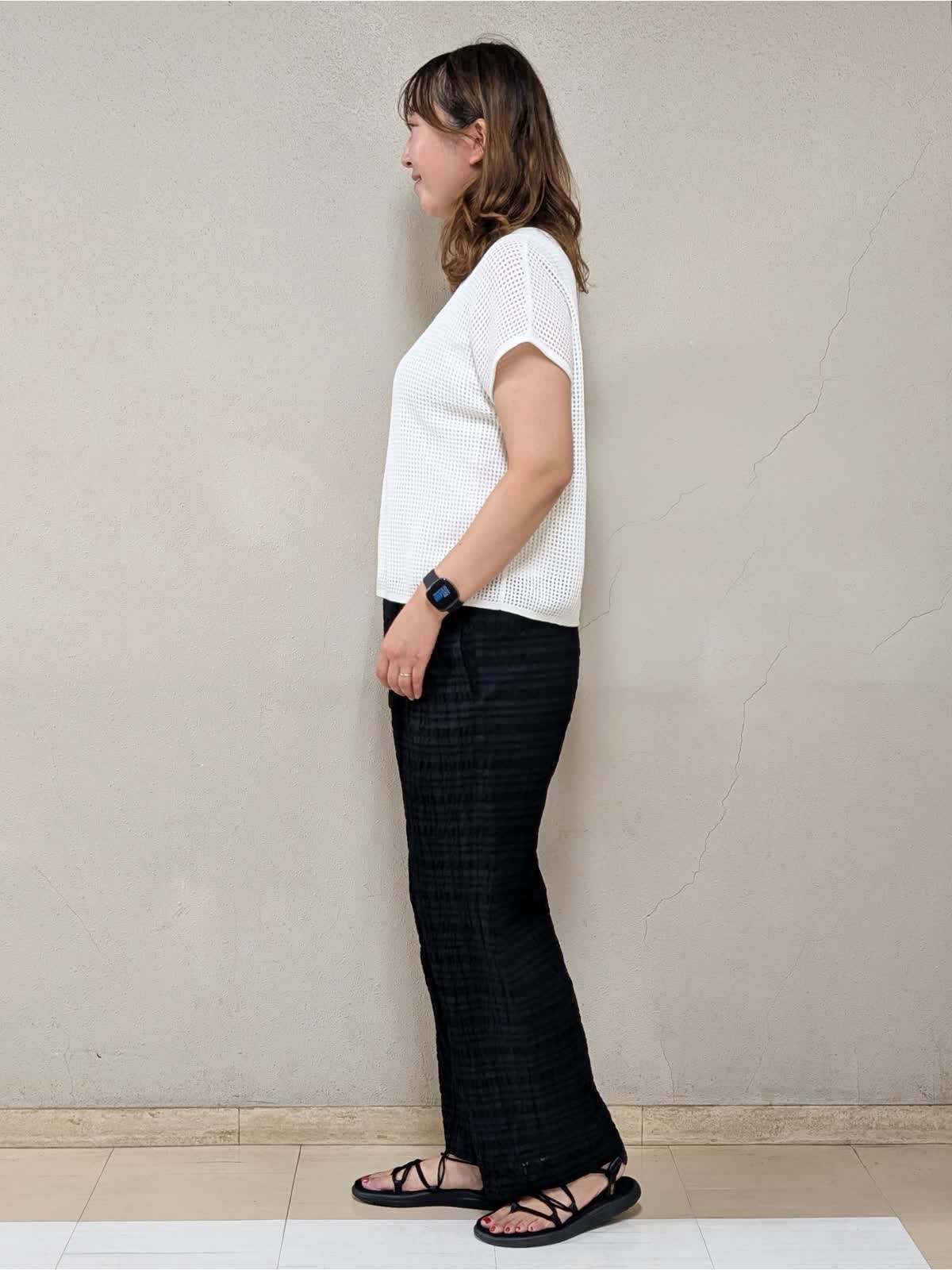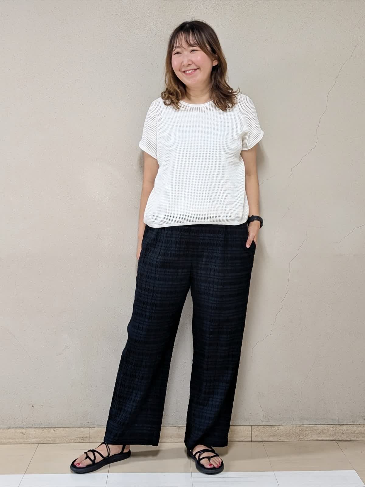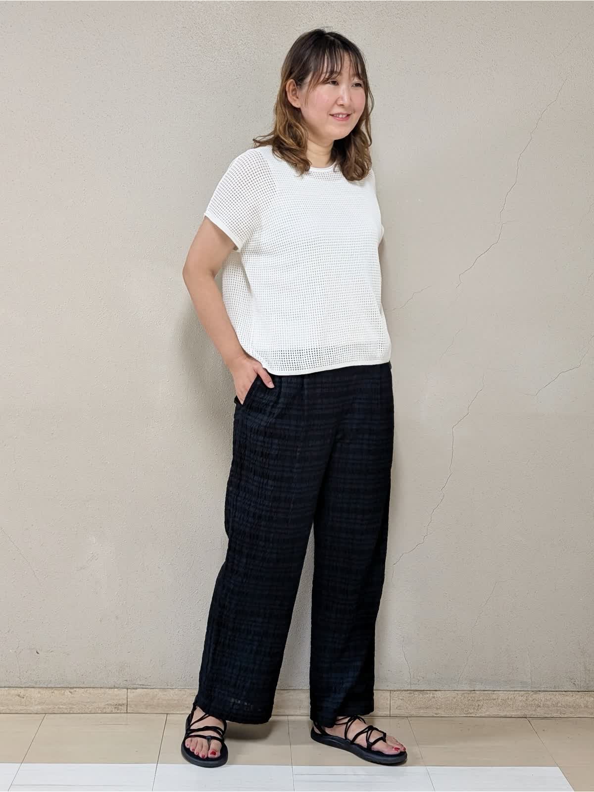 【着用サイズ】ニット、パンツ:フリー タンクトップ:11号【着用カラー】ニット:オフホワイト タンクトップ:ホワイト パンツ:ブラック 休日のお出掛けコーディネートです。カジュアルなアイテムをモノトーンでモードな雰囲気にまとめました。メッシュのニットは和紙で作られた素材でシャリ感があり、サラッと涼しいです。スクエアの編み地で、インナーに合わせるタンクトップの色で透け感を楽しめます。今回は透け感が目立たない同色のインナーを合わせました。パンツは織りでチェック柄を作っていて、無地でも華やかさがあります。フリーサイズですが、普段11号の私にも穿けるサイズ感です。