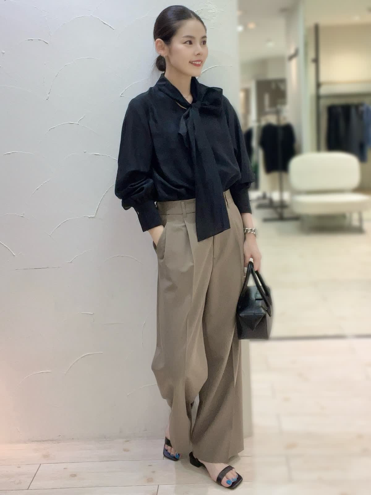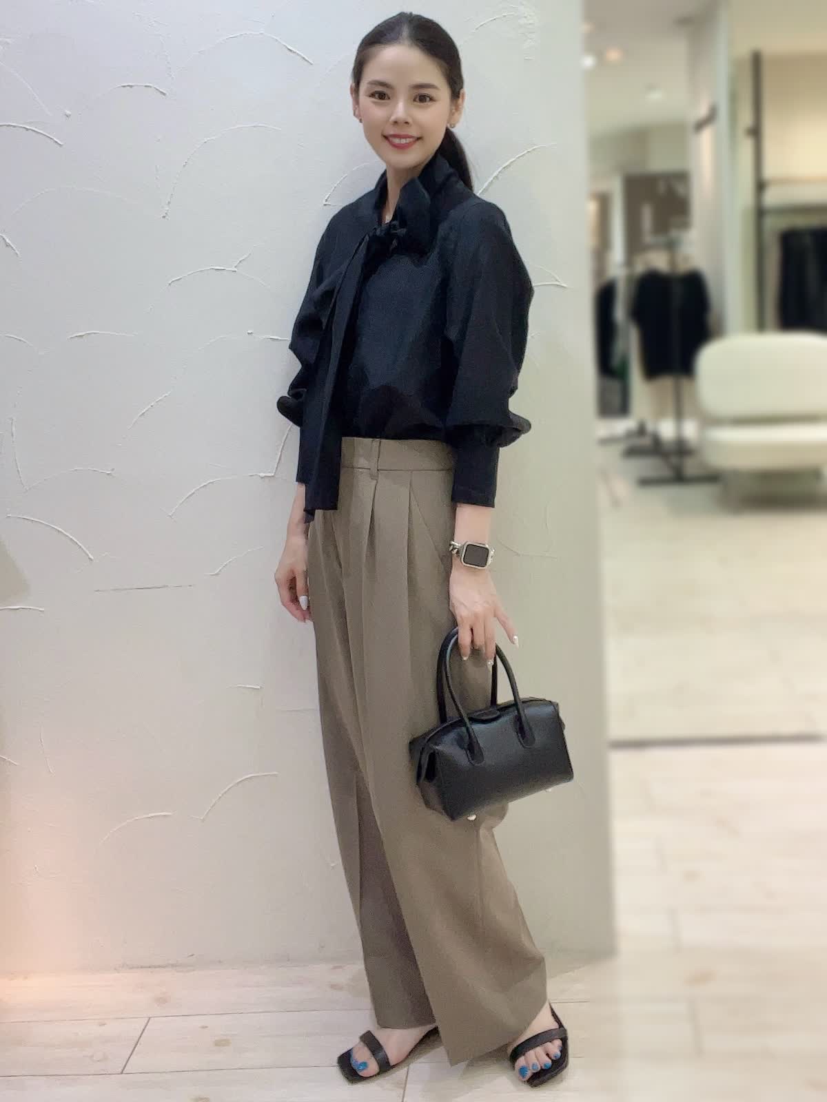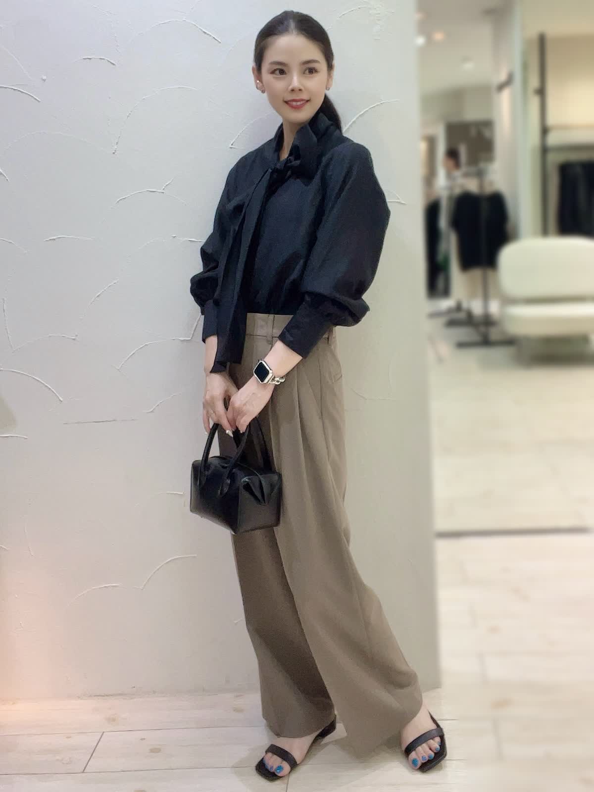 I.T.'S. international × STORY 2wayシアーボウタイブラウス。シンプルなワイドパンツと合わせて通勤やオフィススタイルにもおすすめ。華やかなボウタイが雰囲気を明るく見せてくれます。秋まで長く着られるデザイン。パンツは定番TR素材。軽い素材で晩夏からお召しいただけます。
