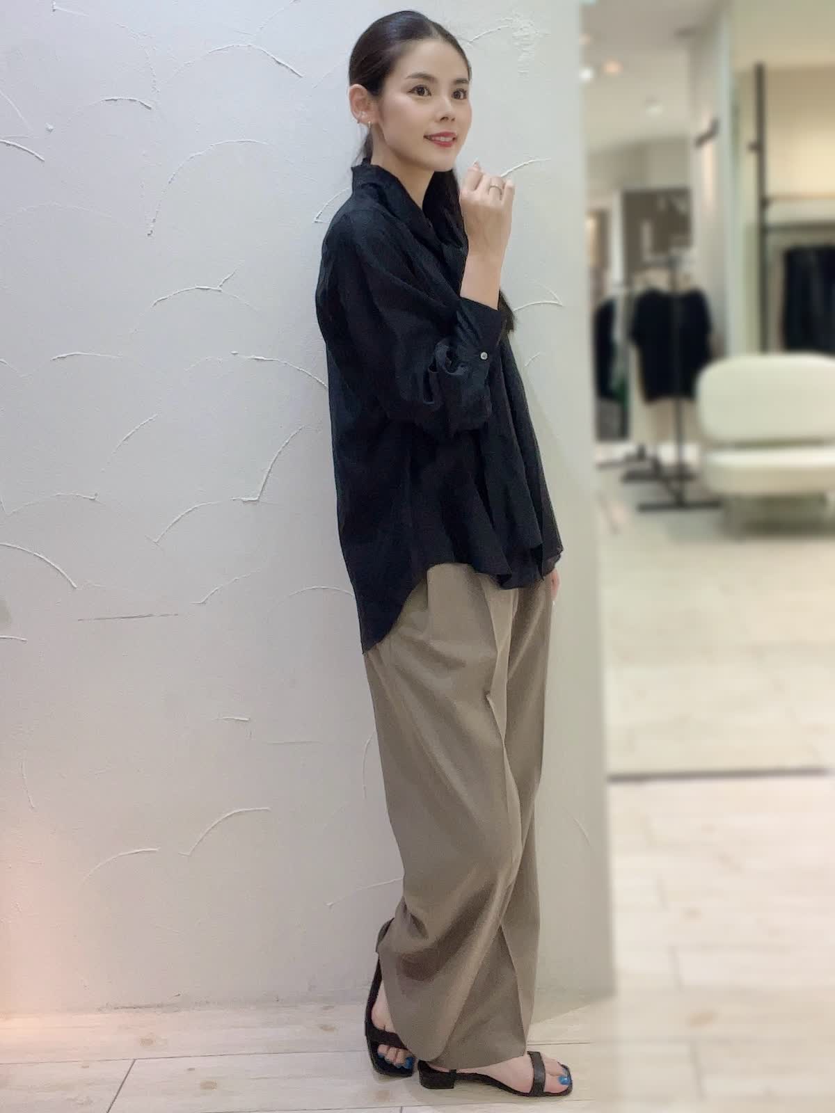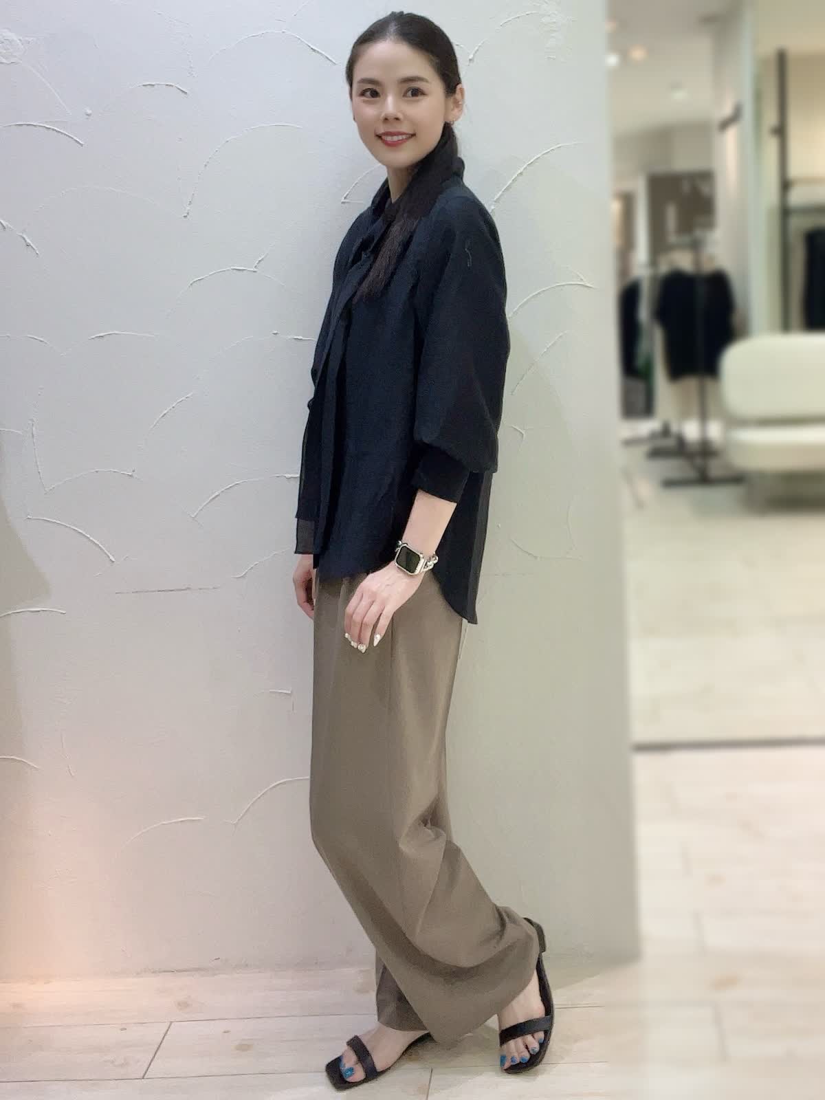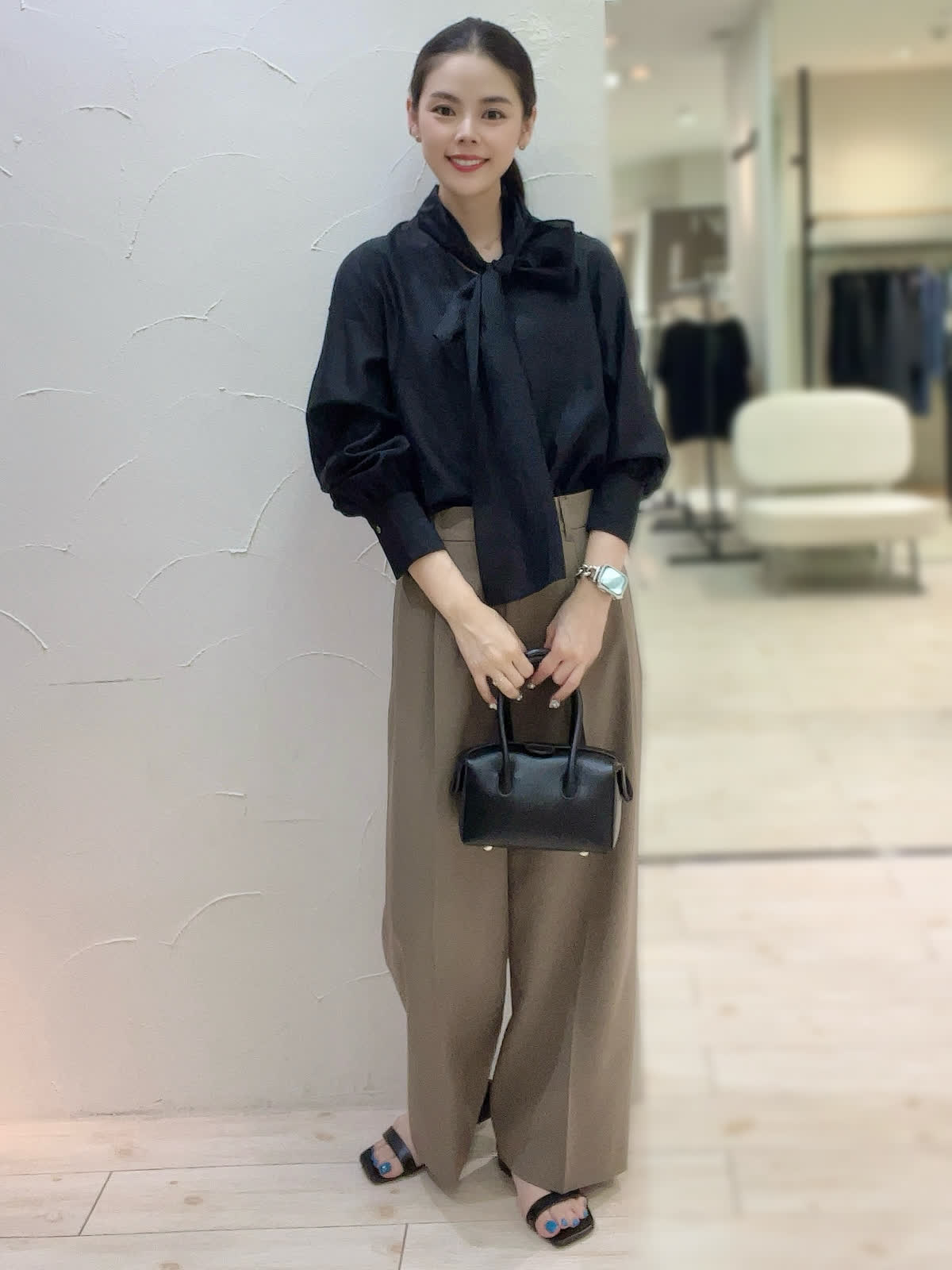 I.T.'S. international × STORY 2wayシアーボウタイブラウス。シンプルなワイドパンツと合わせて通勤やオフィススタイルにもおすすめ。華やかなボウタイが雰囲気を明るく見せてくれます。秋まで長く着られるデザイン。パンツは定番TR素材。軽い素材で晩夏からお召しいただけます。
