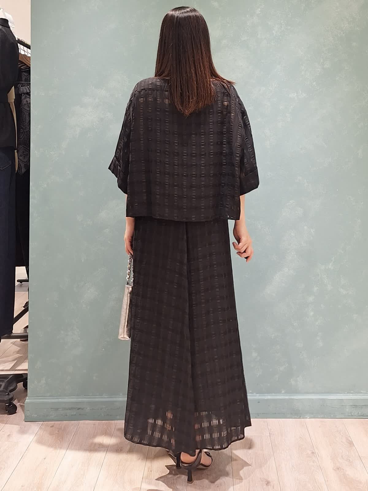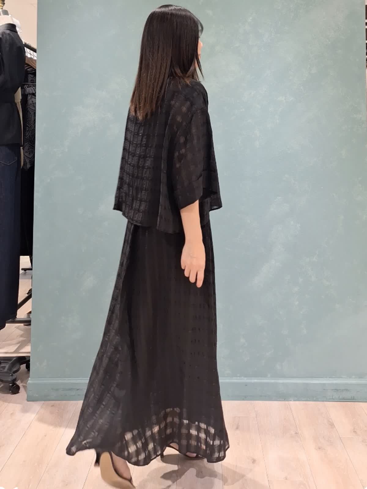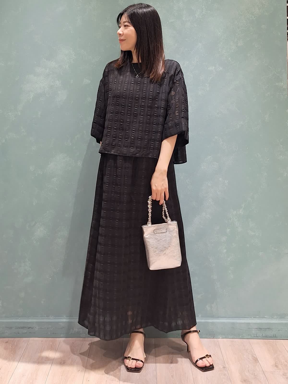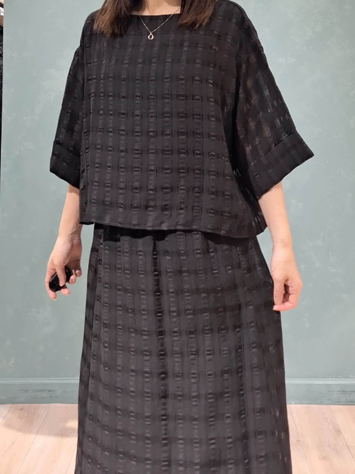 【着用サイズ、カラー】ブラウス:9号、ブラック スカート:7号、ブラック キャミソール:7号、ブラック 休日のお出掛けスタイル《シアーチェックツーピース》ブラウスは横幅があり、着丈は短め。ハイウエストのボトムとバランス良く着ていただけます。気になる二の腕がしっかり隠れるのも嬉しいポイントです♪スカートはオールゴム仕様のウエスト、サイズ調節ができる紐付きで体型を選びません。腰周りはスッキリ、広がりすぎないラインです。足首が見えるくらいのロング丈で露出は少なめ。安心感があります。バッグやアクセサリー次第で、印象が変わるツーピースです。