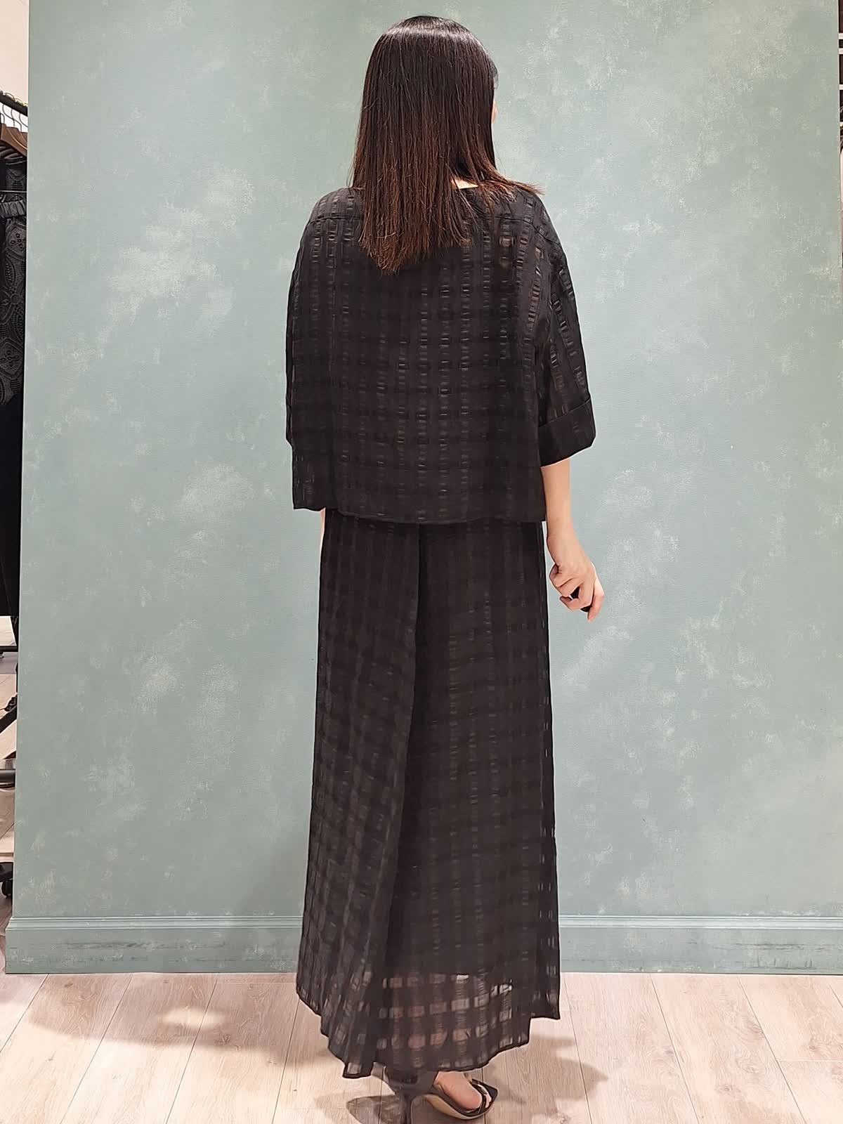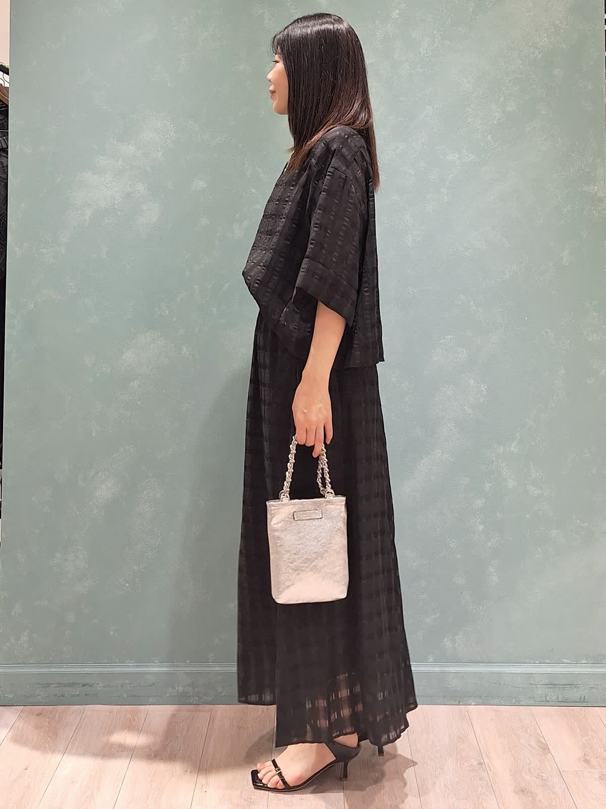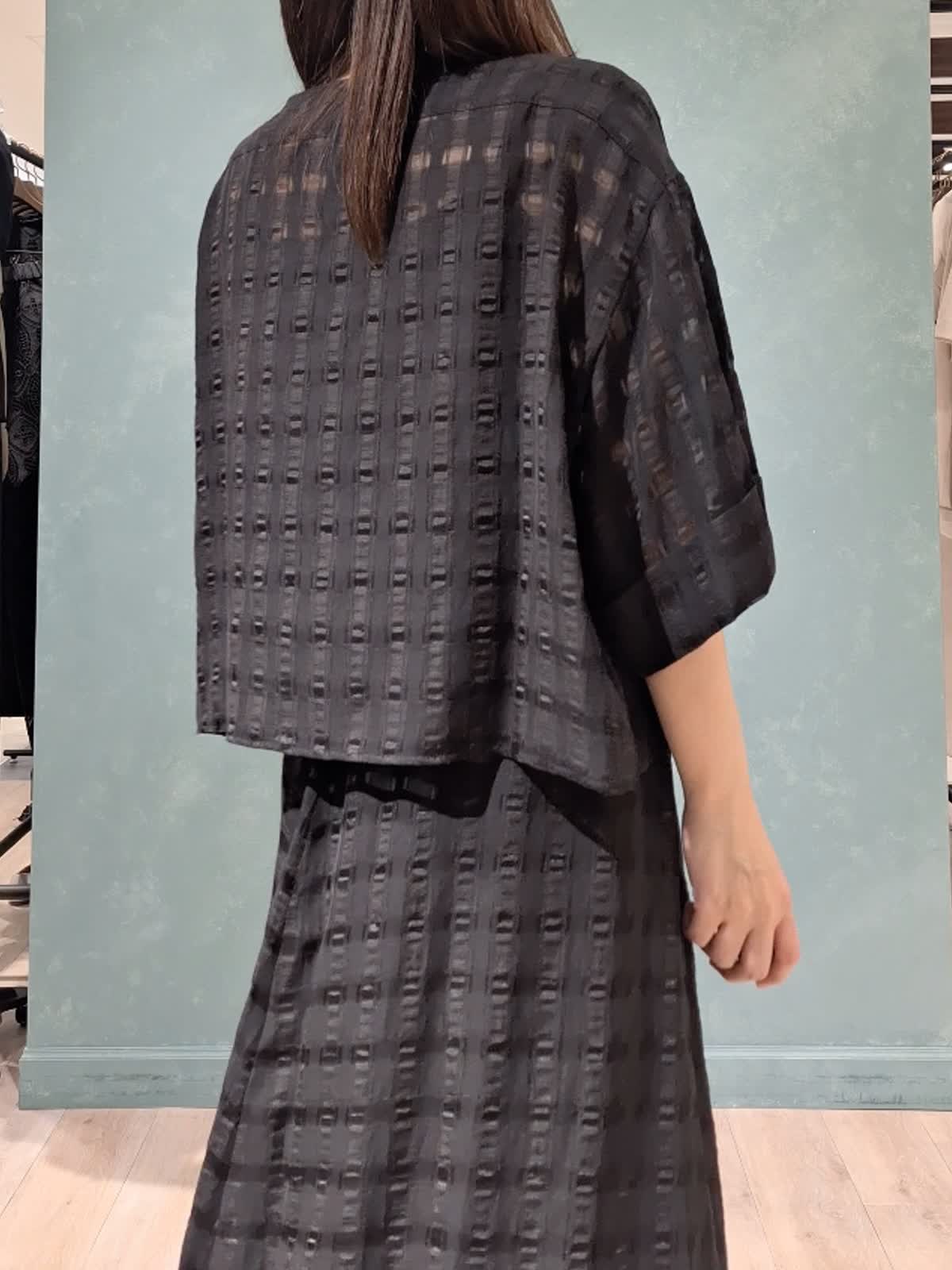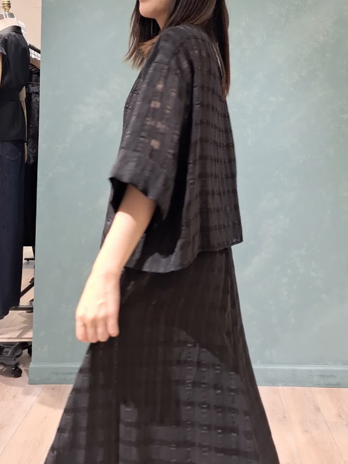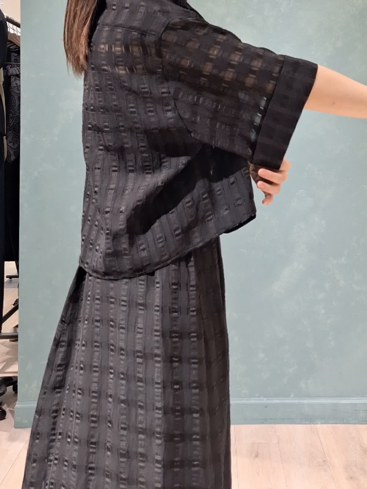 【着用サイズ、カラー】ブラウス:9号、ブラック スカート:7号、ブラック キャミソール:7号、ブラック 休日のお出掛けスタイル《シアーチェックツーピース》ブラウスは横幅があり、着丈は短め。ハイウエストのボトムとバランス良く着ていただけます。気になる二の腕がしっかり隠れるのも嬉しいポイントです♪スカートはオールゴム仕様のウエスト、サイズ調節ができる紐付きで体型を選びません。腰周りはスッキリ、広がりすぎないラインです。足首が見えるくらいのロング丈で露出は少なめ。安心感があります。バッグやアクセサリー次第で、印象が変わるツーピースです。
