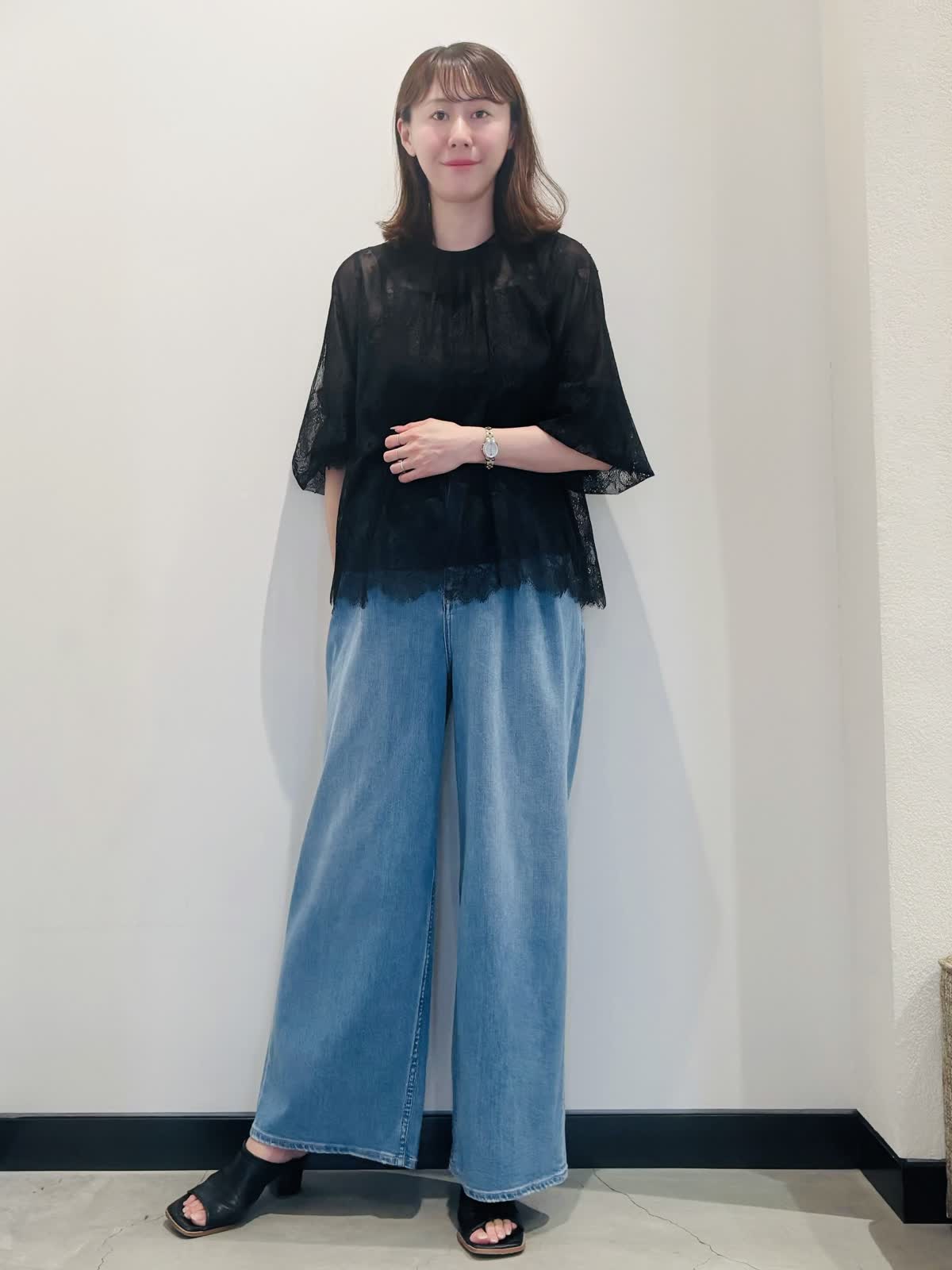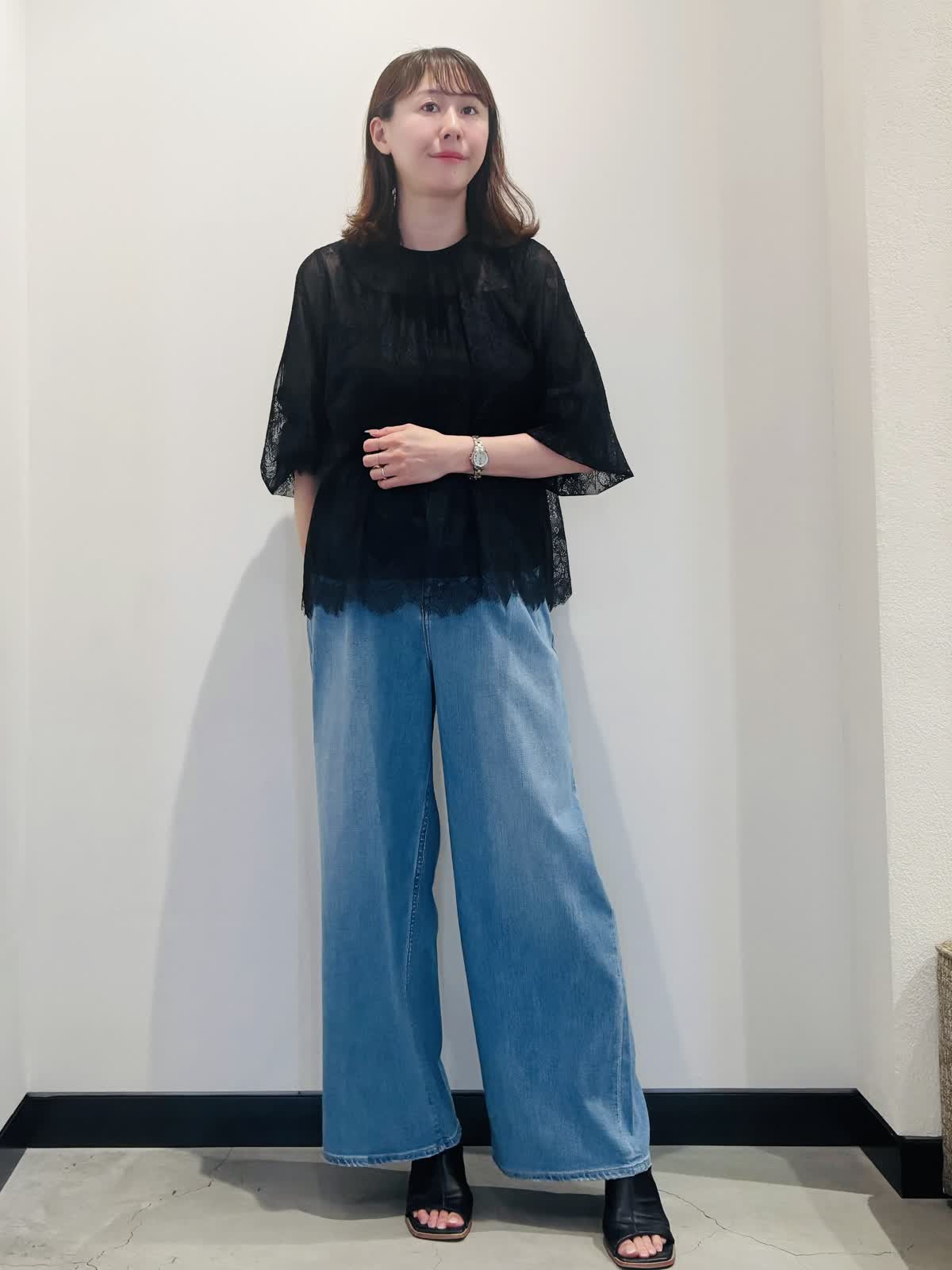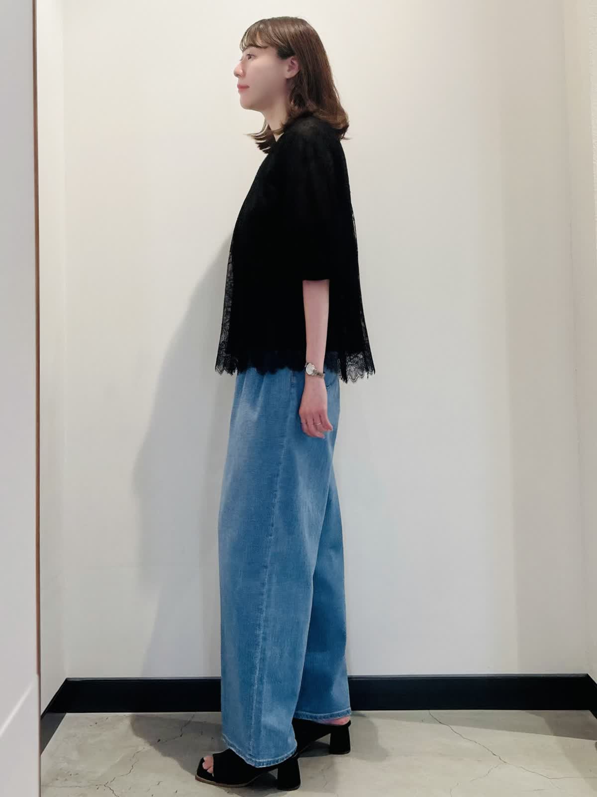 【着用サイズ/カラー】ブラウス:9号/ブラック パンツ:9号/サックス 季節の端境期にぴったりな黒レースブラウス。 トレンドのシアー感は、秋も継続注目のキーワード。 ボトムはワイドデニムでカジュアルダウンしつつ、抜け感を演出。 甘さ控えめの大人フェミニンな秋スタイルです。