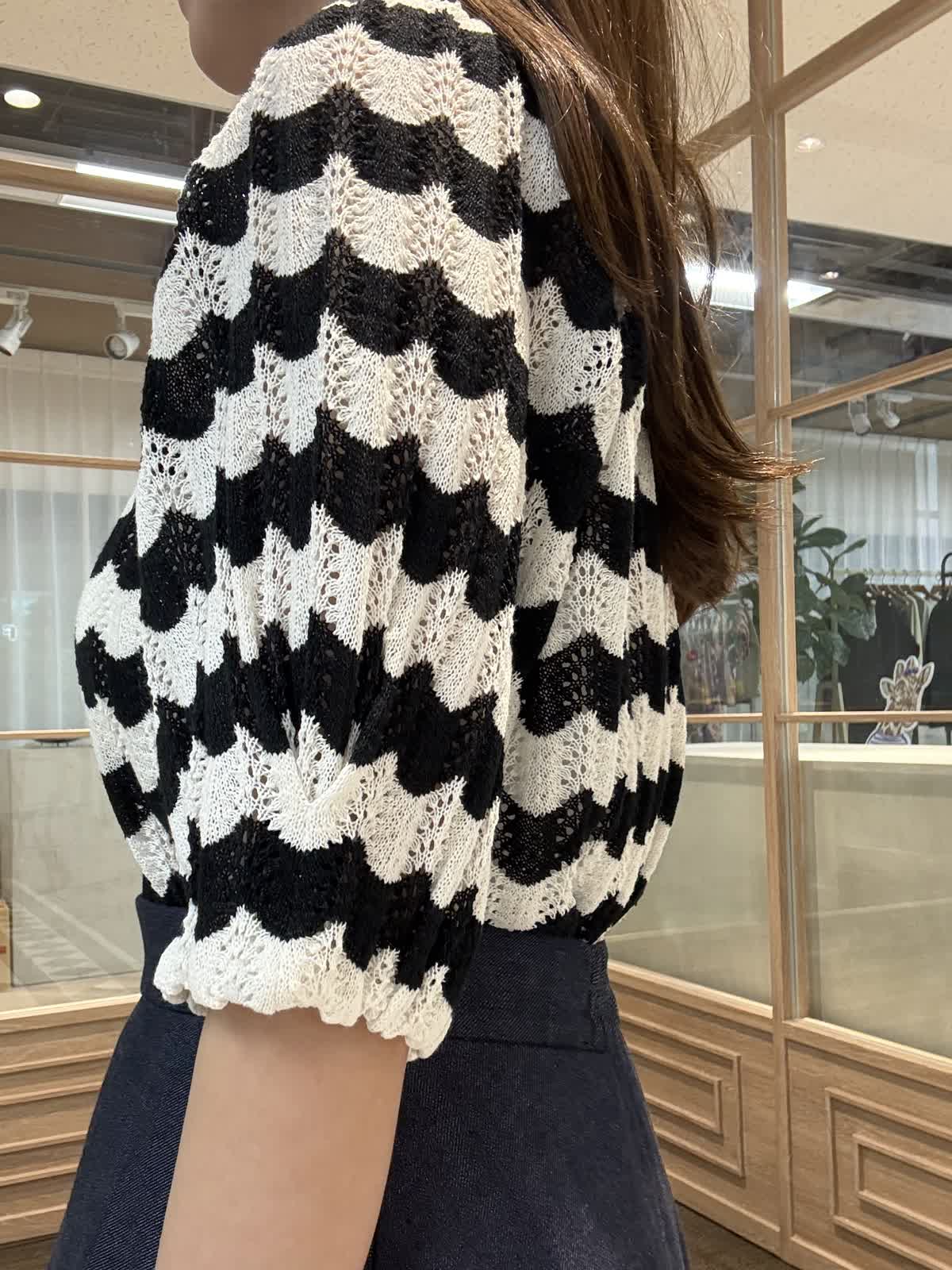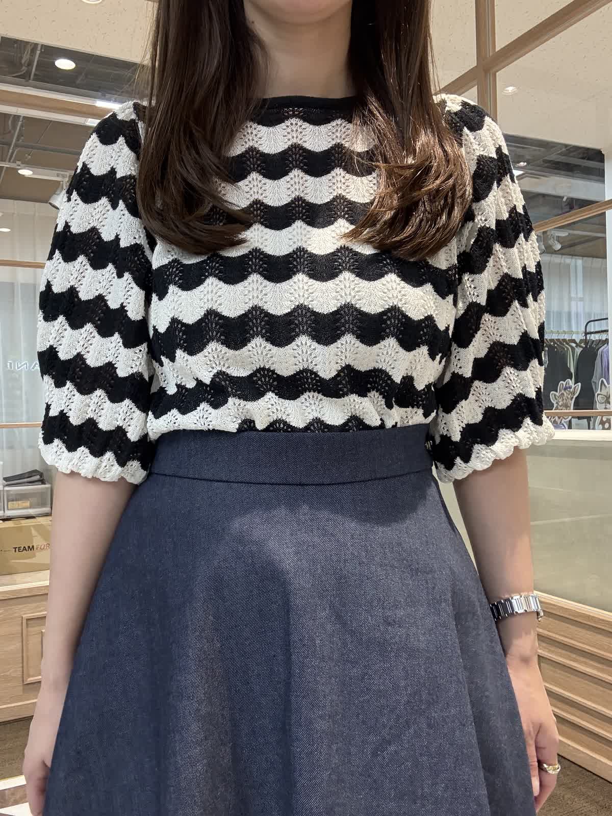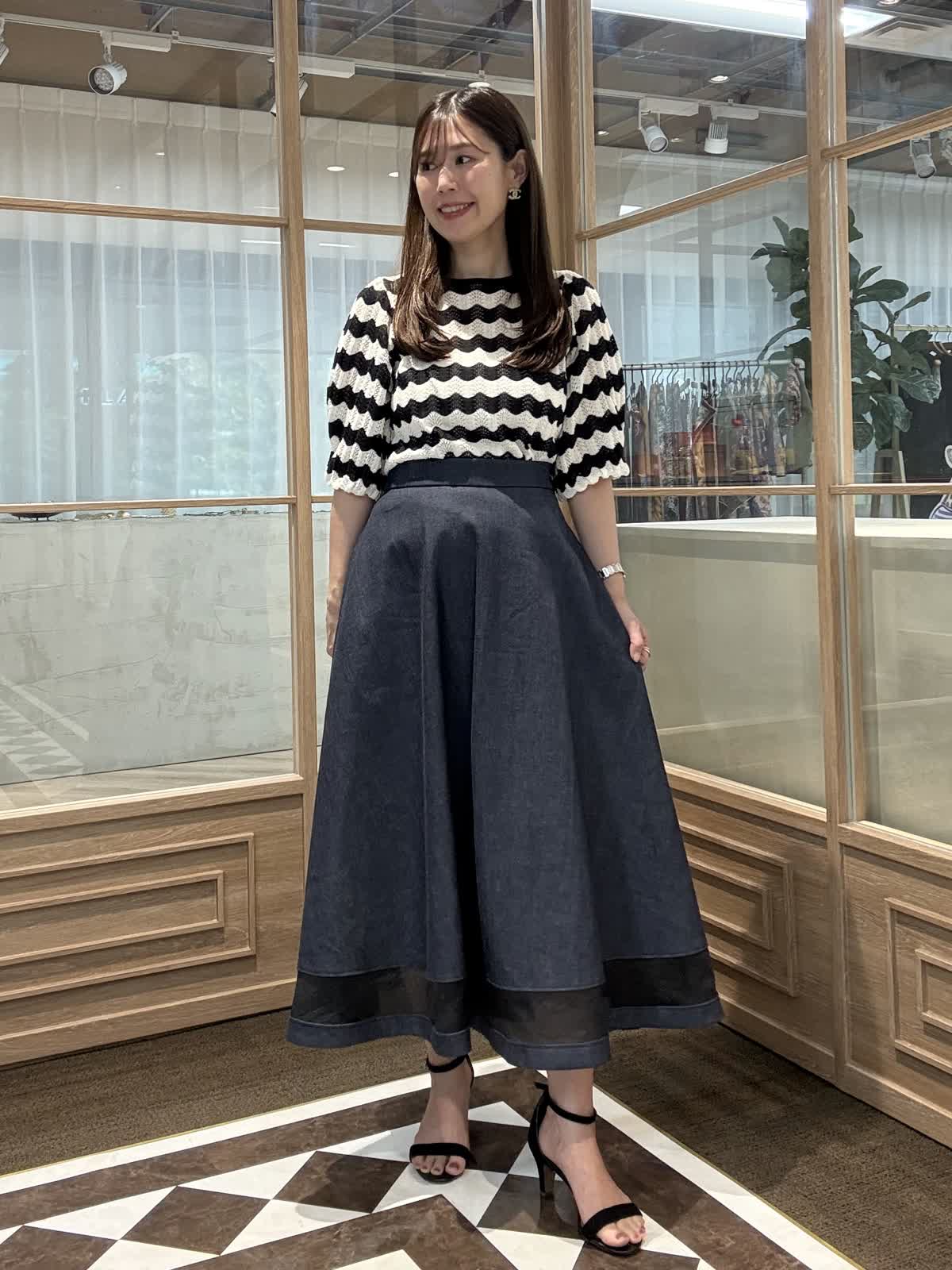 【着用アイテム】 ニット9号 スカート 7号 スカラップのような波状のボーダーが目を惹くニットはシャリっとした清涼感のある素材で着心地抜群。 今シーズンも大注目のデニムを使ったスカートは上品なフレアラインで腰回りもスッキリ着れます。 裾にシアーを挟み込むことで足元が軽く見えてバランスを取りやすいのもおすすめポイントです。