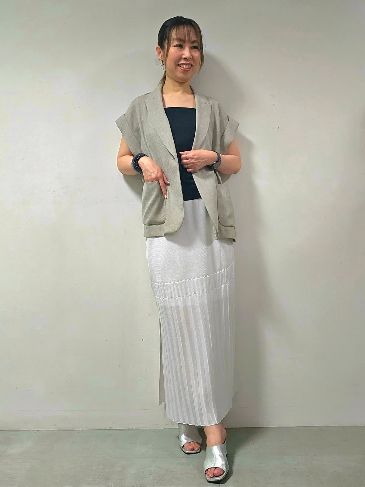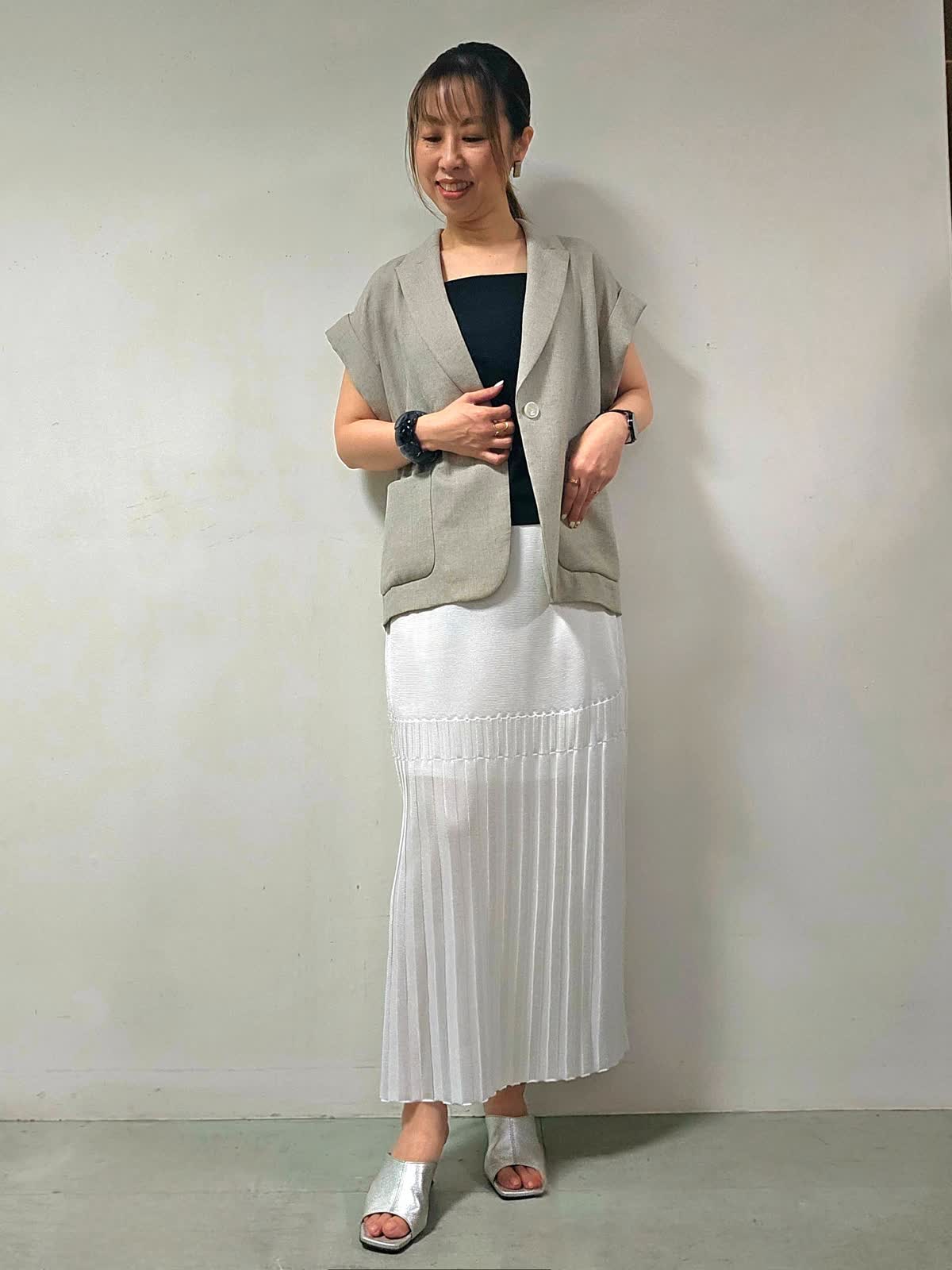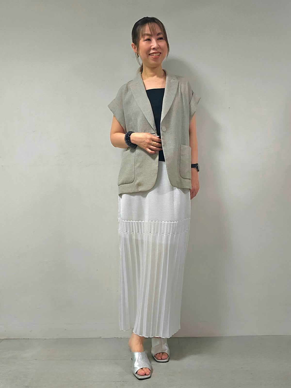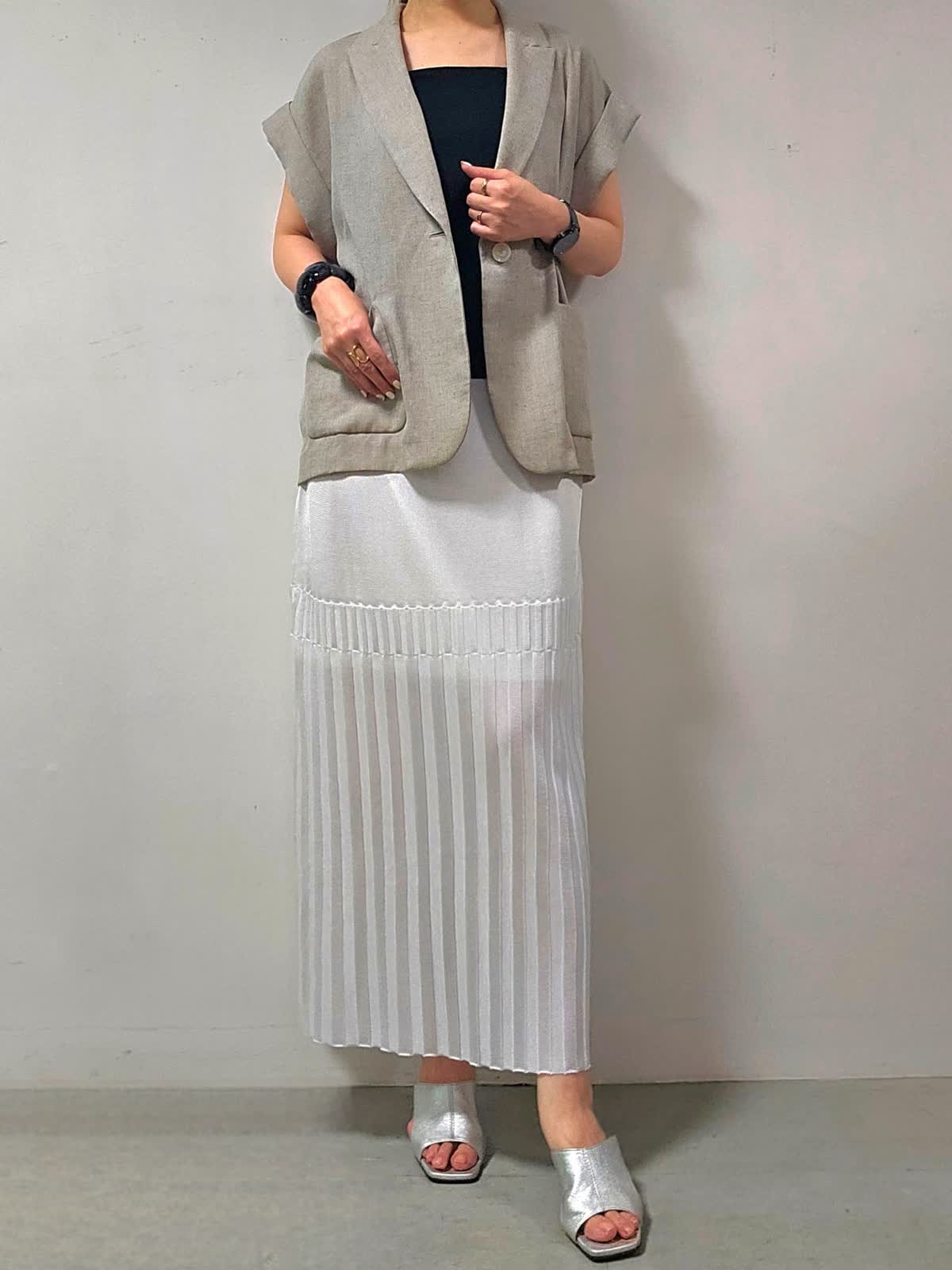 【着用サイズ】ジャケット:7号 キャミソール・スカート:9号 【着用カラー】ジャケット:ベージュ キャミソール:ブラック スカート:オフホワイト 上品に映えるニットスカートコーデ☆ スカートは揺れ感が綺麗なのがおすすめのポイントです! 旬なきれい目コーデが決まりやすいのがニットスカートの良いところ! スッキリしたシルエットなので、低身長さんにもおすすめです。