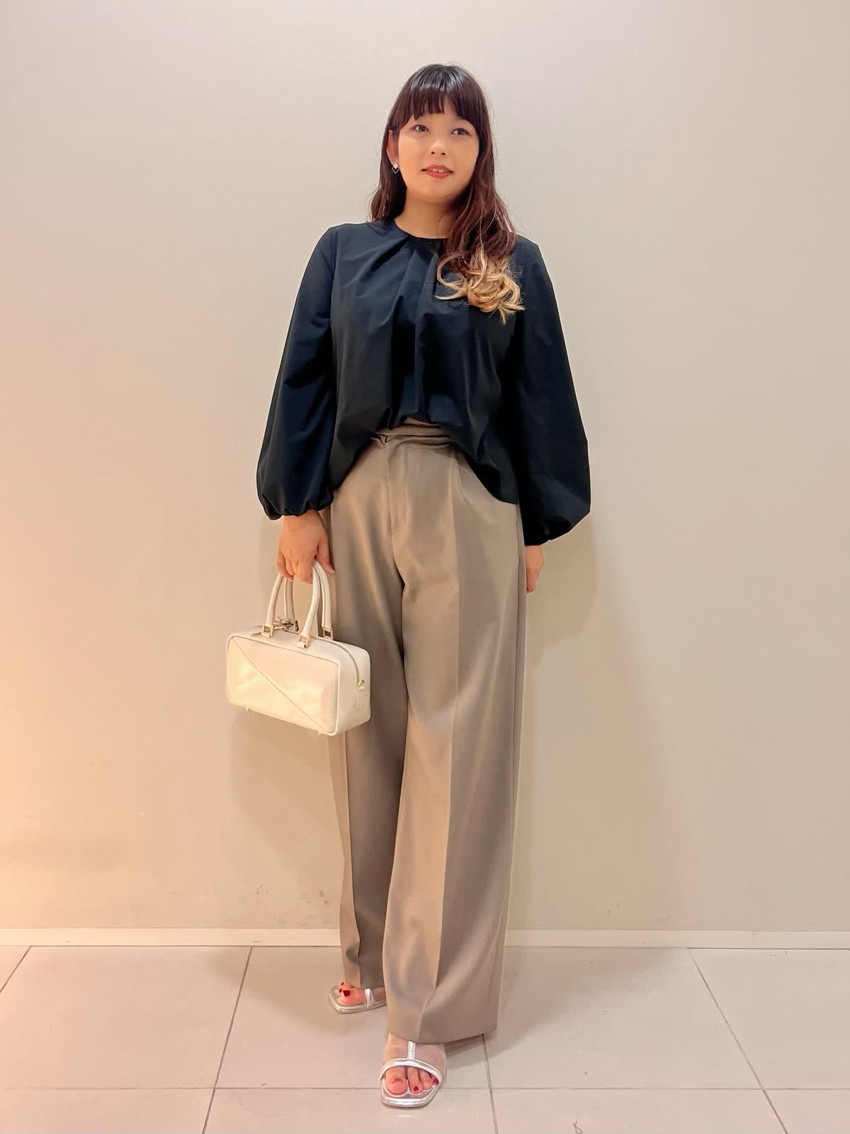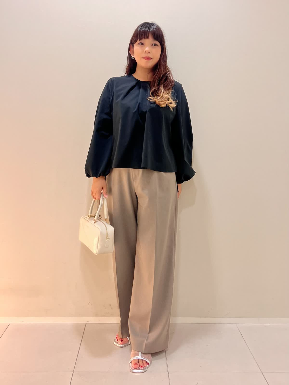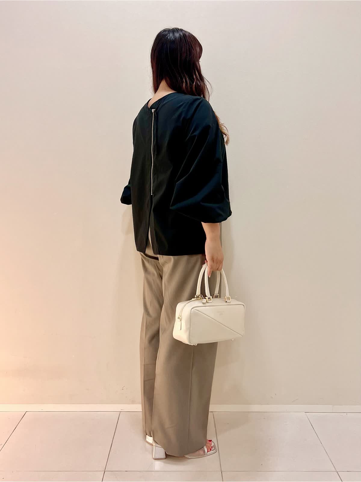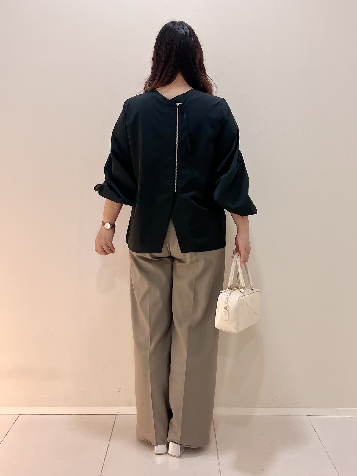 【着用サイズ】ブラウス:フリー パンツ:11号 【着用カラー】ブラウス:ブラック パンツ:モカチャ バッグ:オフホワイト 秋の装いにもぴったりのブラウススタイル。 適度なハリ感のあるボリュームスリーブブラウスはシーズン長く着用可能。バックジップのデザインがポイントとなり、一枚でお洒落に着こなしていただけます。 さらっとした着心地のモカチャのワイドパンツと合わせて秋のお出掛けコーディネートにお勧めです。