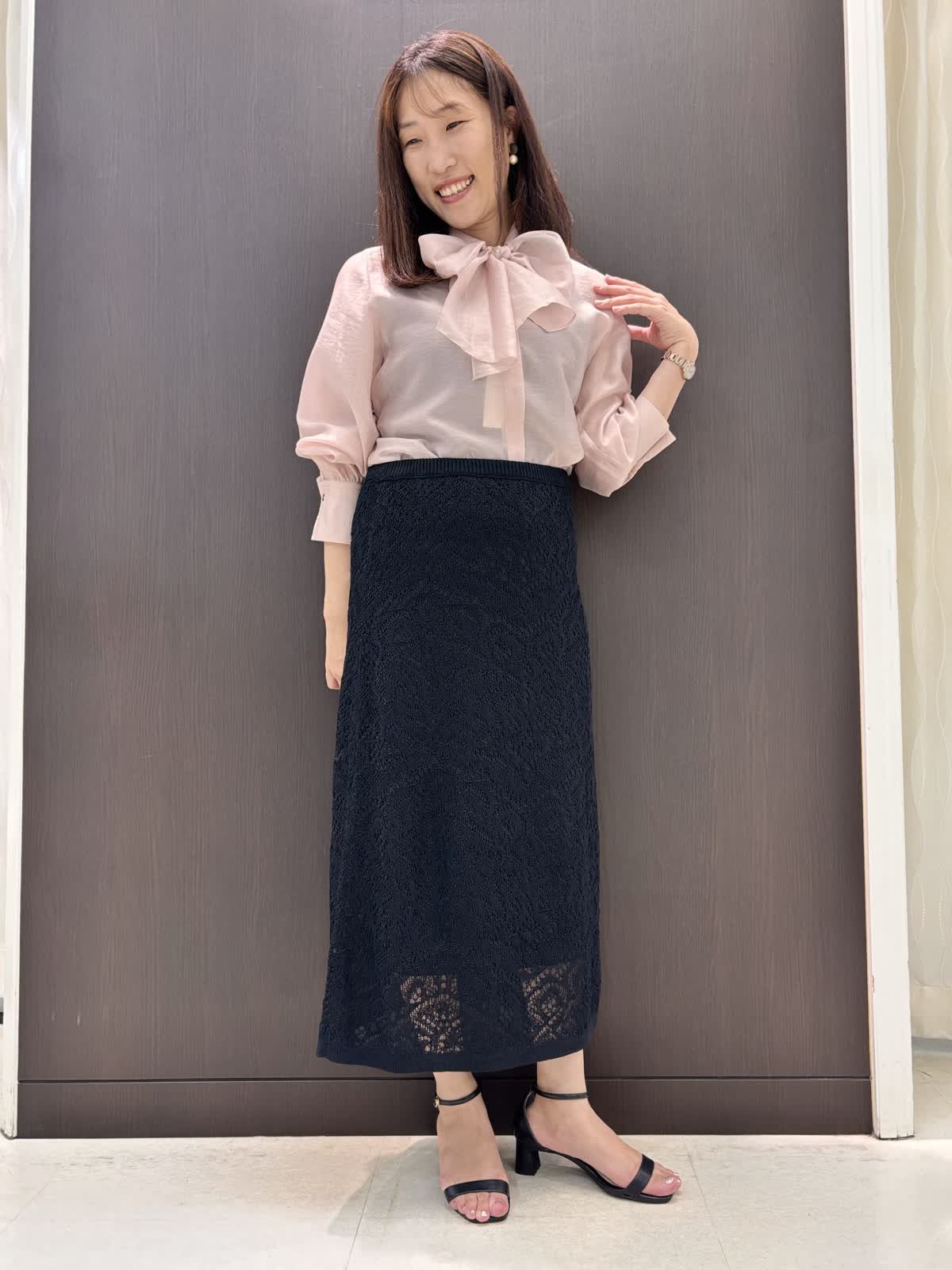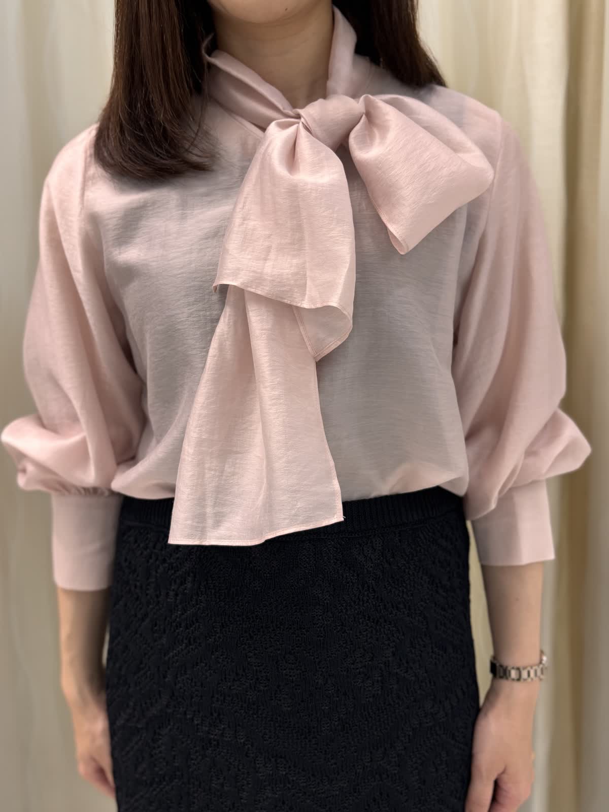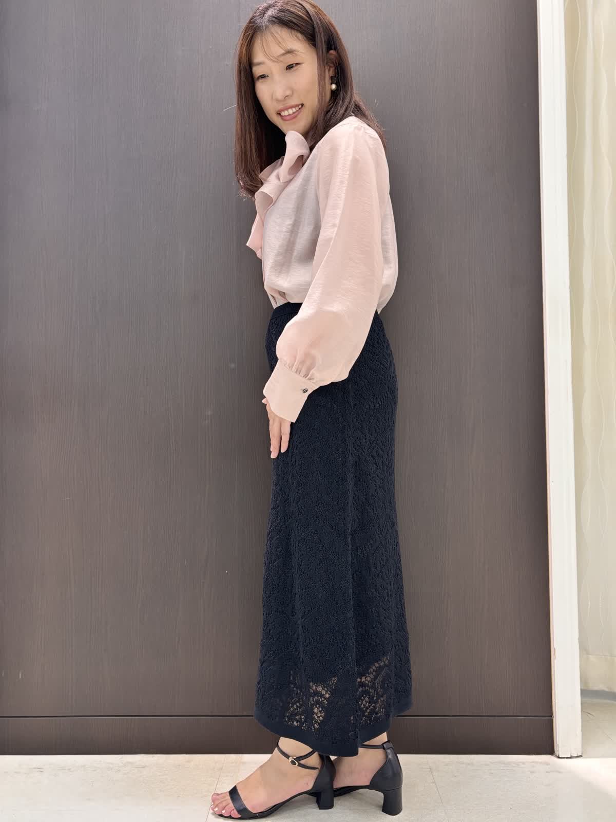 品のある大人ピンクのブラウス。フワッとオーガンジーのような軽さの素材でリボンがこんなにらキレイに。結んでも、垂らすだけでもお好きなデザインをチョイスして、TPOに合わせてお使いいただける万能なブラウスです。袖口のギャザーでまくるだけでもふんわり雰囲気の出せる所もポイントです。スカートはウエストのサイズはゆったり。レース地ですが、ニットなのでとても履きやすいです。キレイめに使えるので持っていれば何かと便利そうです。ウエストのサイズがゆったりでとても楽です。スソが少し透けるシルエットなの長めなのを感じさせません。