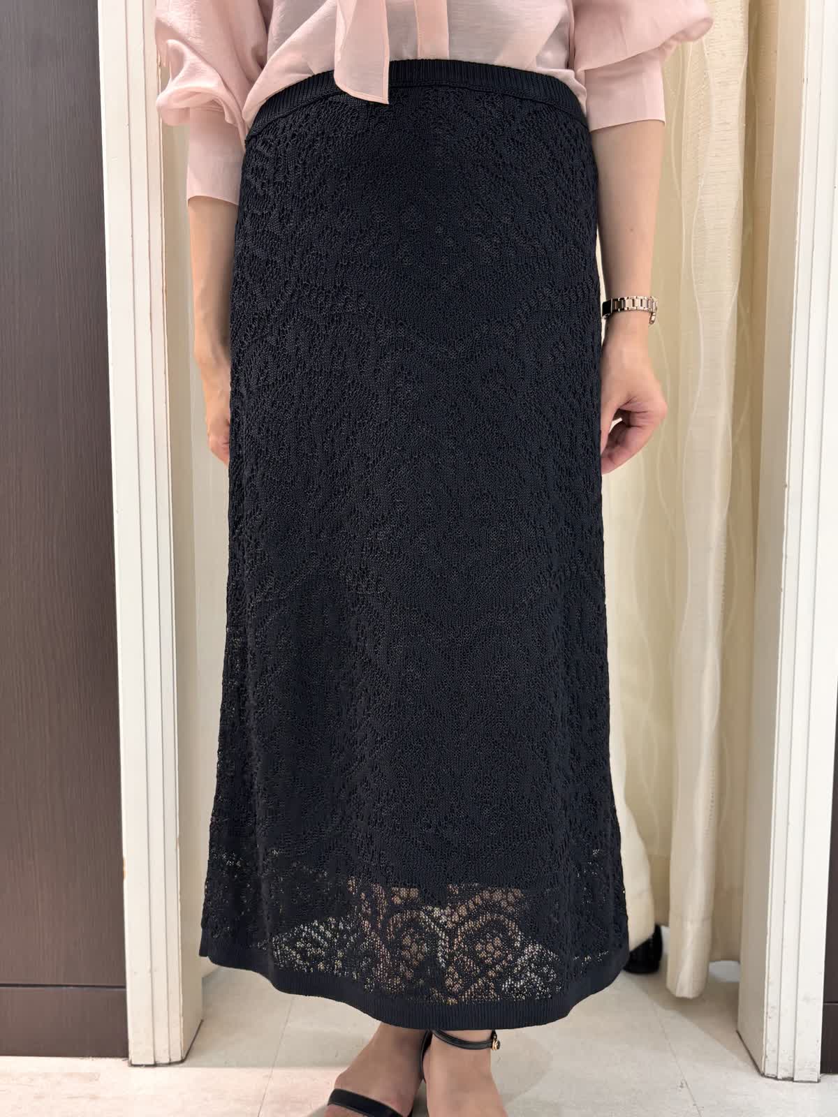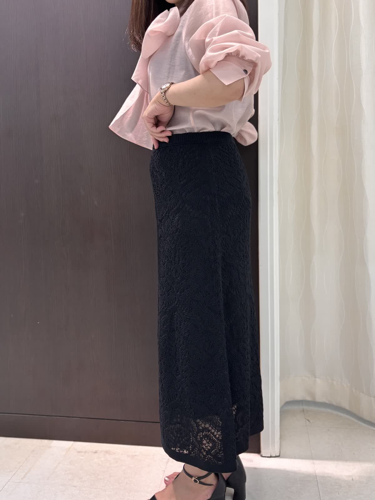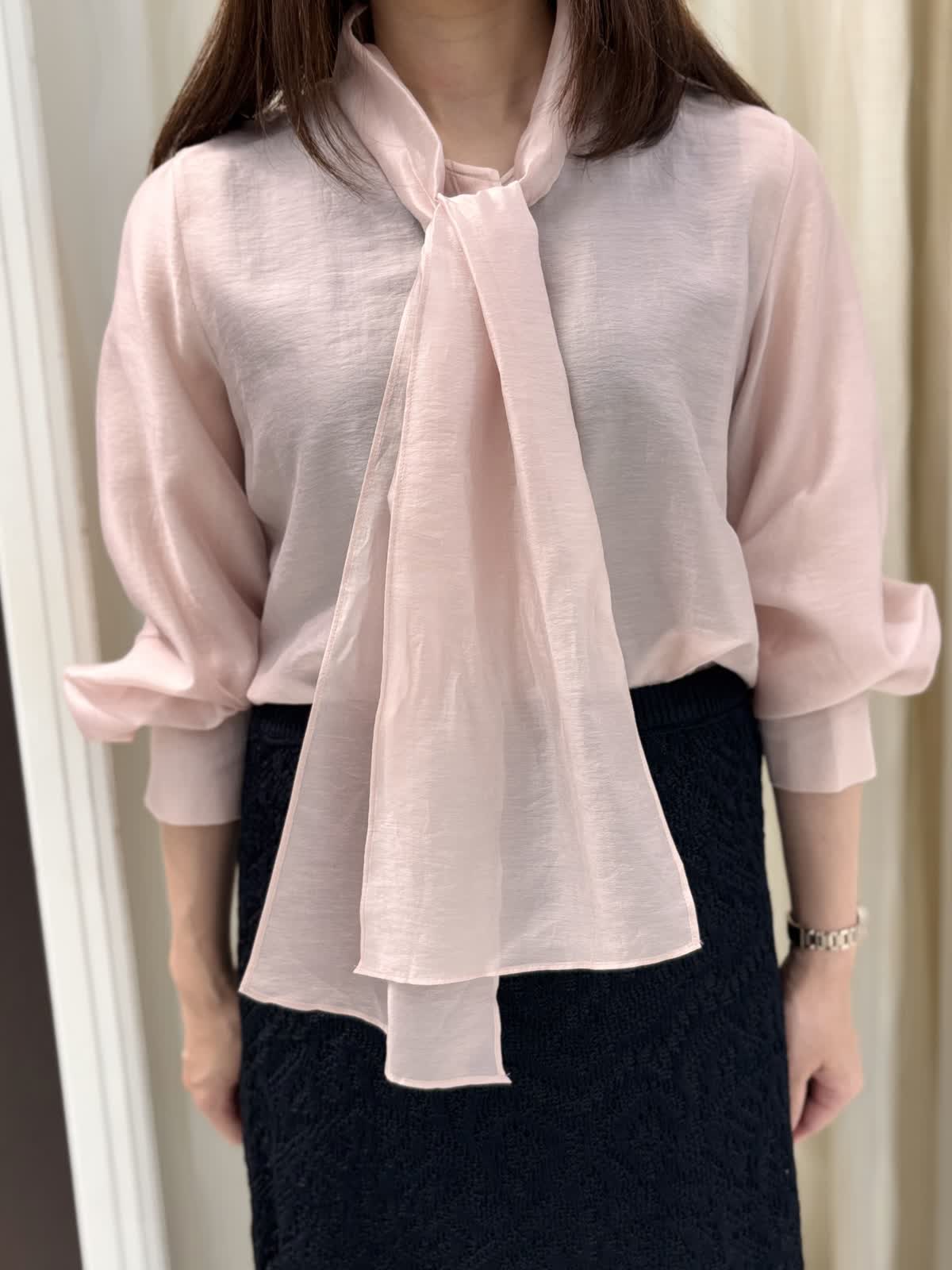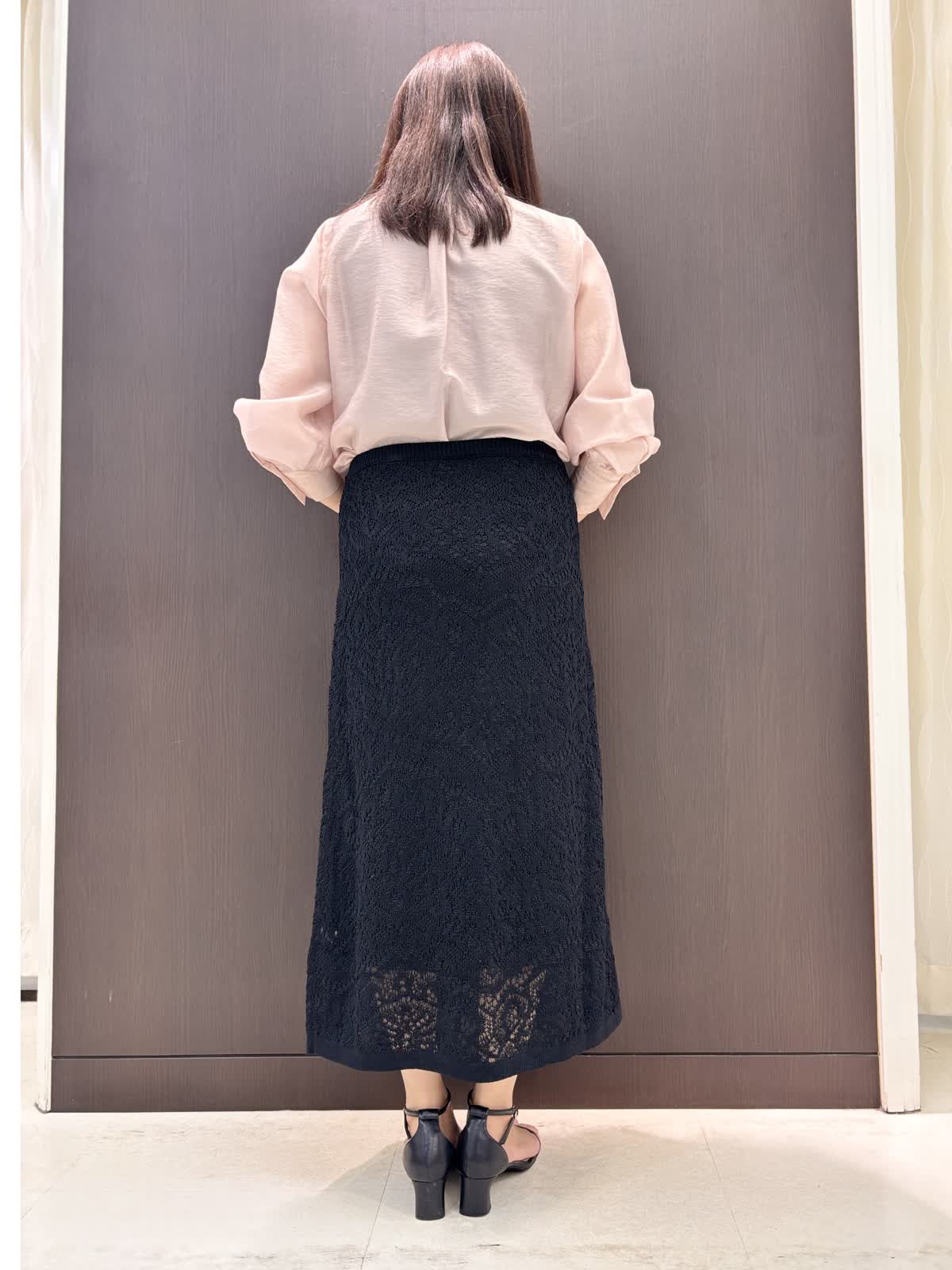品のある大人ピンクのブラウス。フワッとオーガンジーのような軽さの素材でリボンがこんなにらキレイに。結んでも、垂らすだけでもお好きなデザインをチョイスして、TPOに合わせてお使いいただける万能なブラウスです。袖口のギャザーでまくるだけでもふんわり雰囲気の出せる所もポイントです。スカートはウエストのサイズはゆったり。レース地ですが、ニットなのでとても履きやすいです。キレイめに使えるので持っていれば何かと便利そうです。ウエストのサイズがゆったりでとても楽です。スソが少し透けるシルエットなの長めなのを感じさせません。