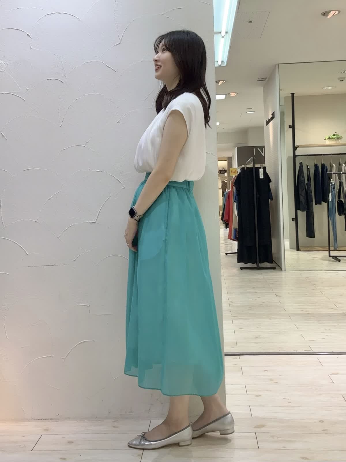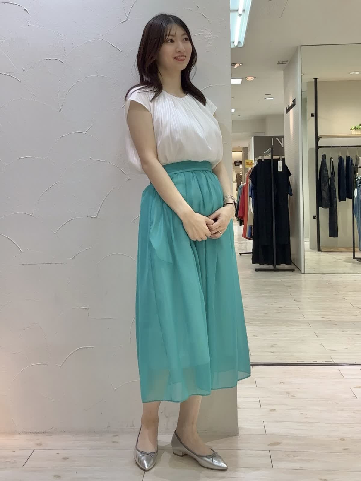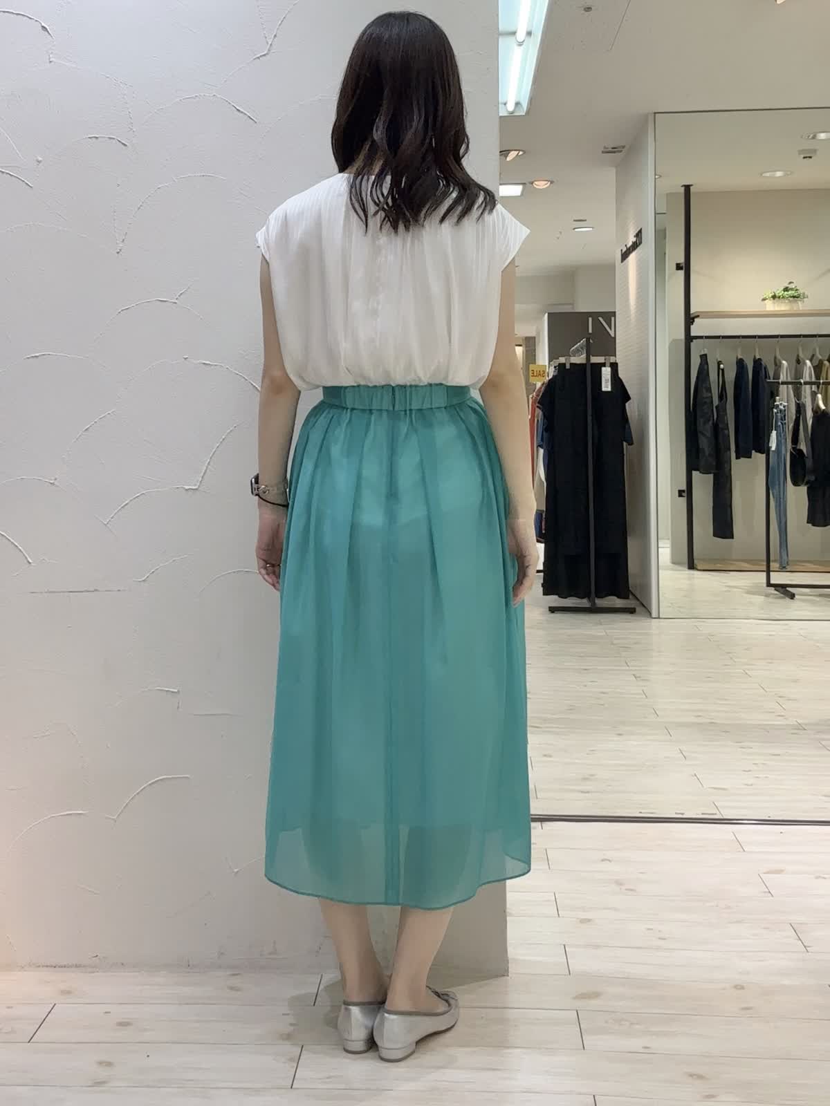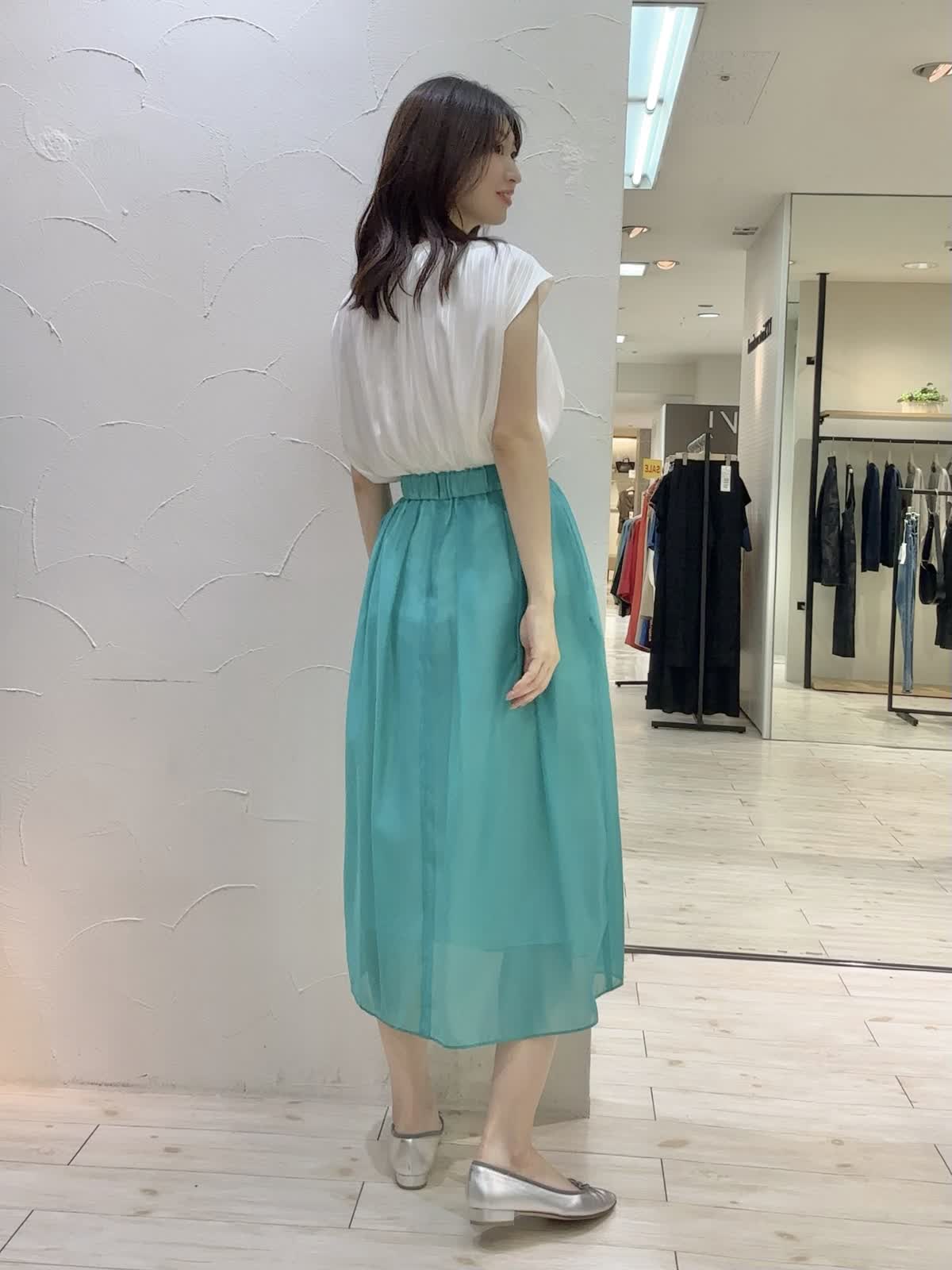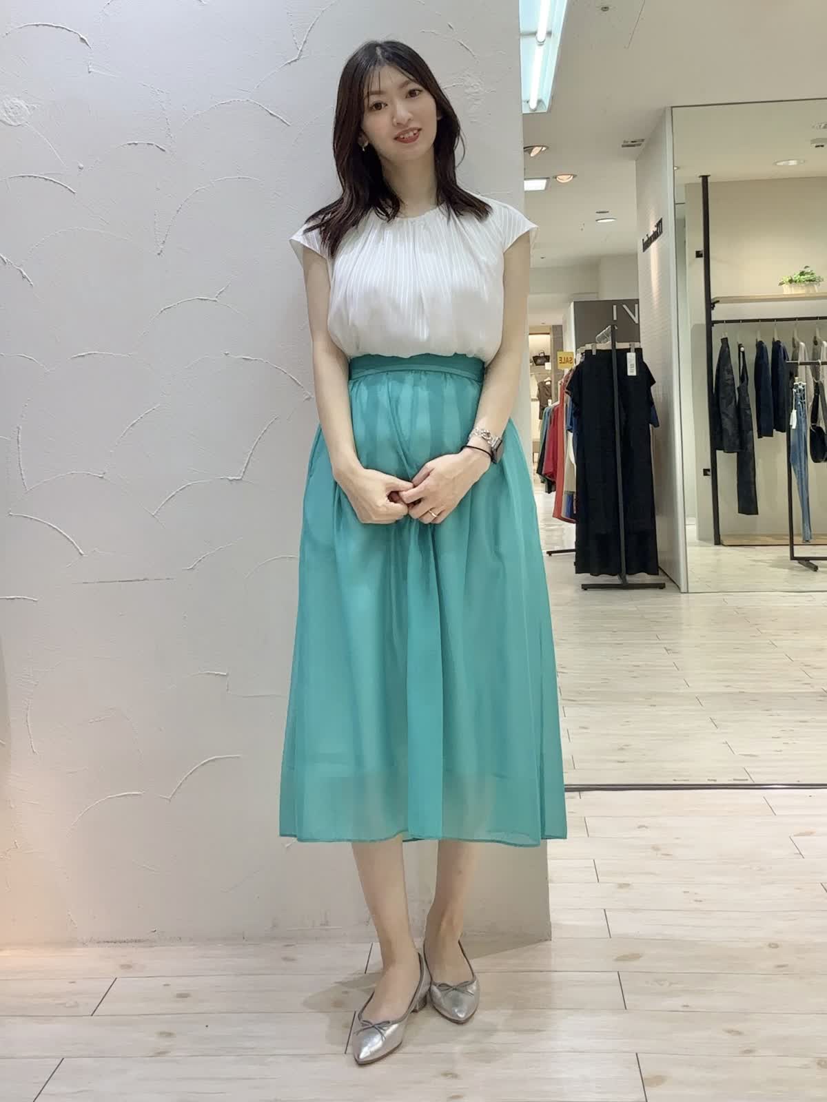 【着用サイズ】ブラウス:9号 スカート:9号 【着用カラー】ブラウス:オフホワイト スカート:ペールグリーン ペールグリーンが爽やかなお出かけコーデ。ブラウスはよく見るとストライプ柄になっており、オンオフ問わずお召しいただけます。裏地付きなので透け感も気にならないです。スカートはシアー素材で上品な印象。後ろがゴムになっており締め付け感も気にならないです。