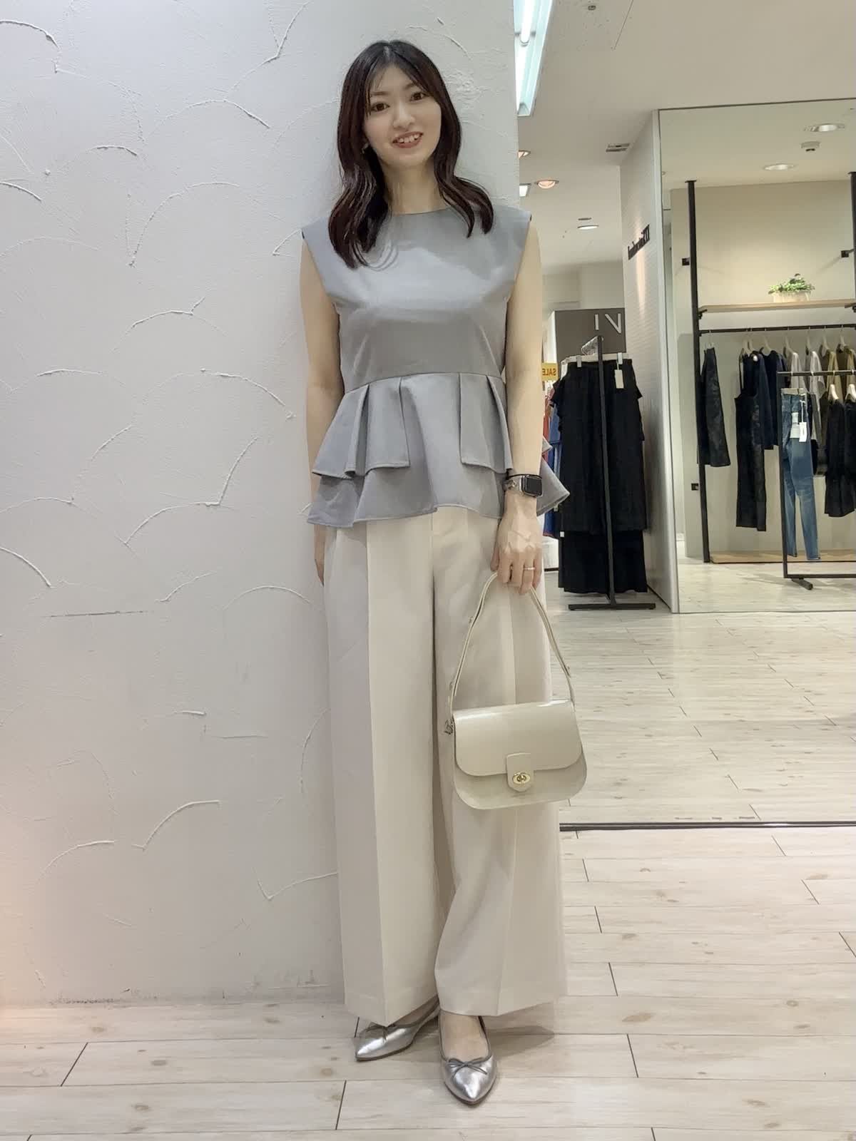 【着用カラー】ブラウス:グレー パンツ:オフホワイト バッグ:ベージュ