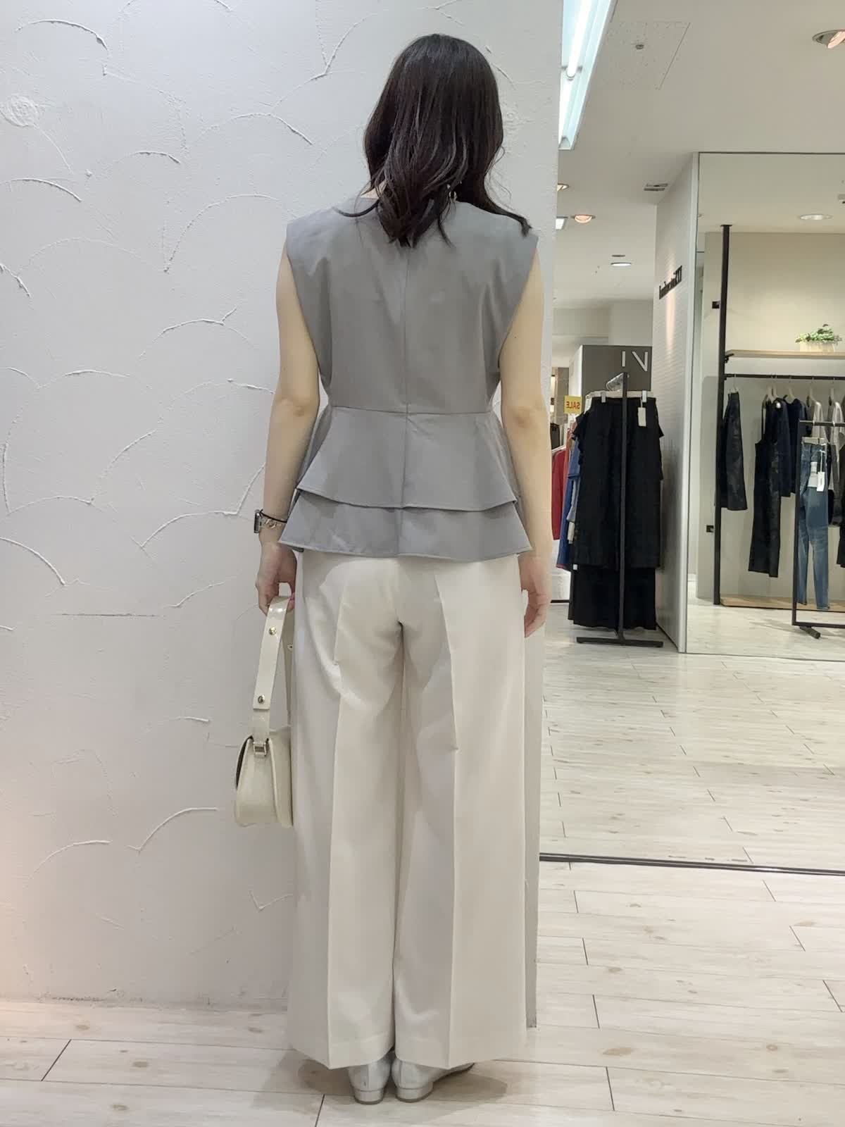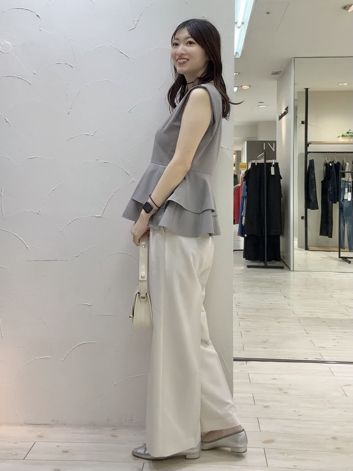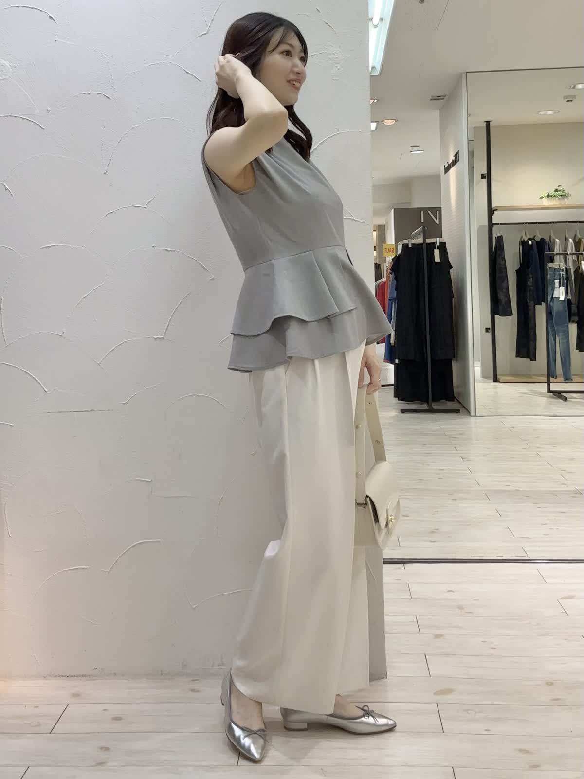 コラボのSTORYのブラウスを使ったオフィスコーデ。肩先まで丈があるノースリーブなので一枚でも挑戦しやすいシルエット。ウエスト位置から2段フレアのペプラムが大人かわいいです。新作のパンツと合わせてみました。ウエストの内側にアジャスターが付いており、サイズ調節が可能です。シルエットもとても綺麗なのでおすすめです。