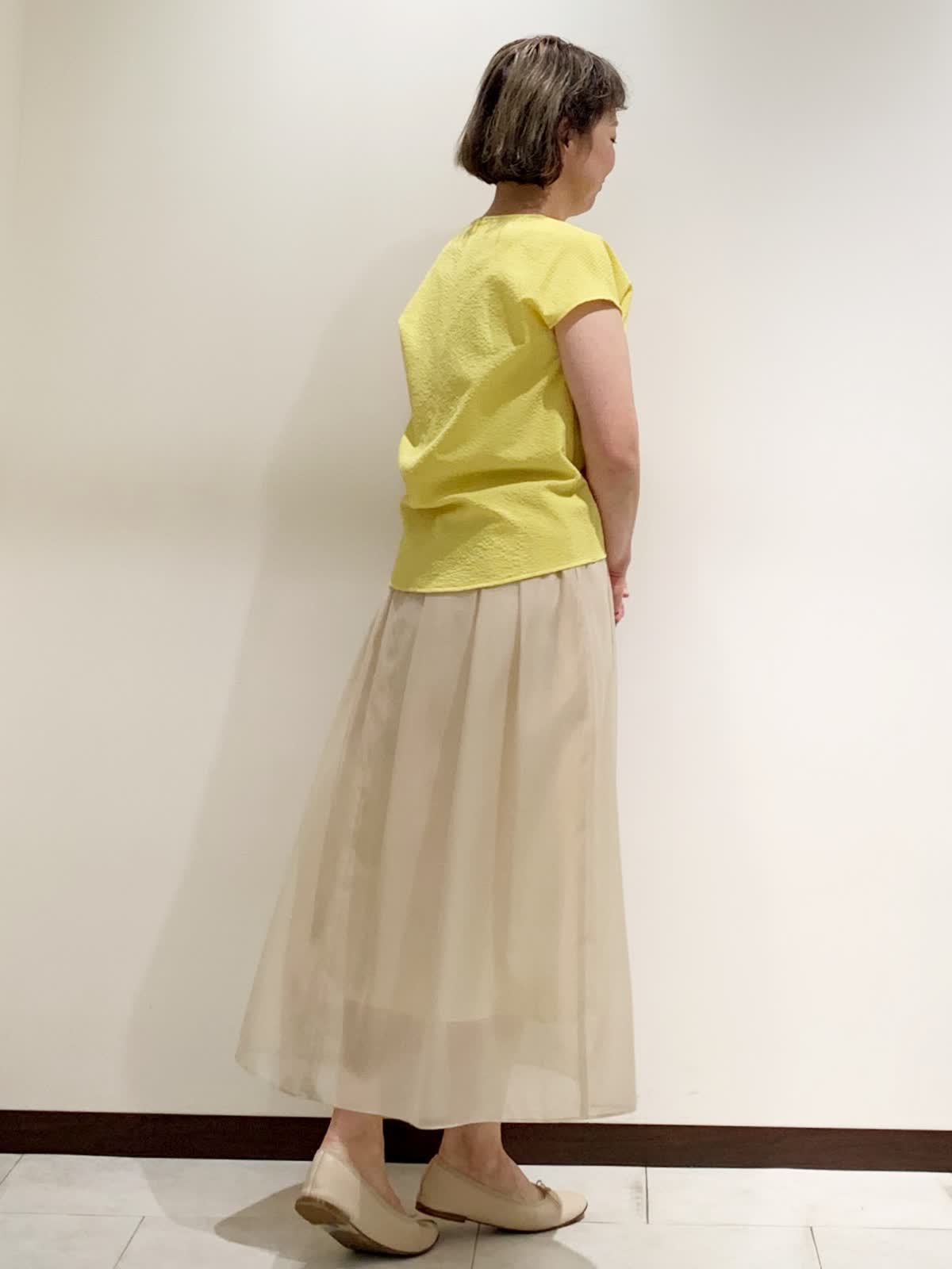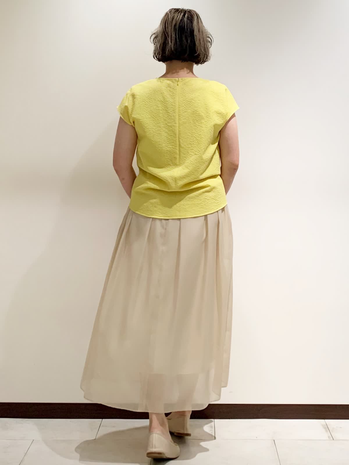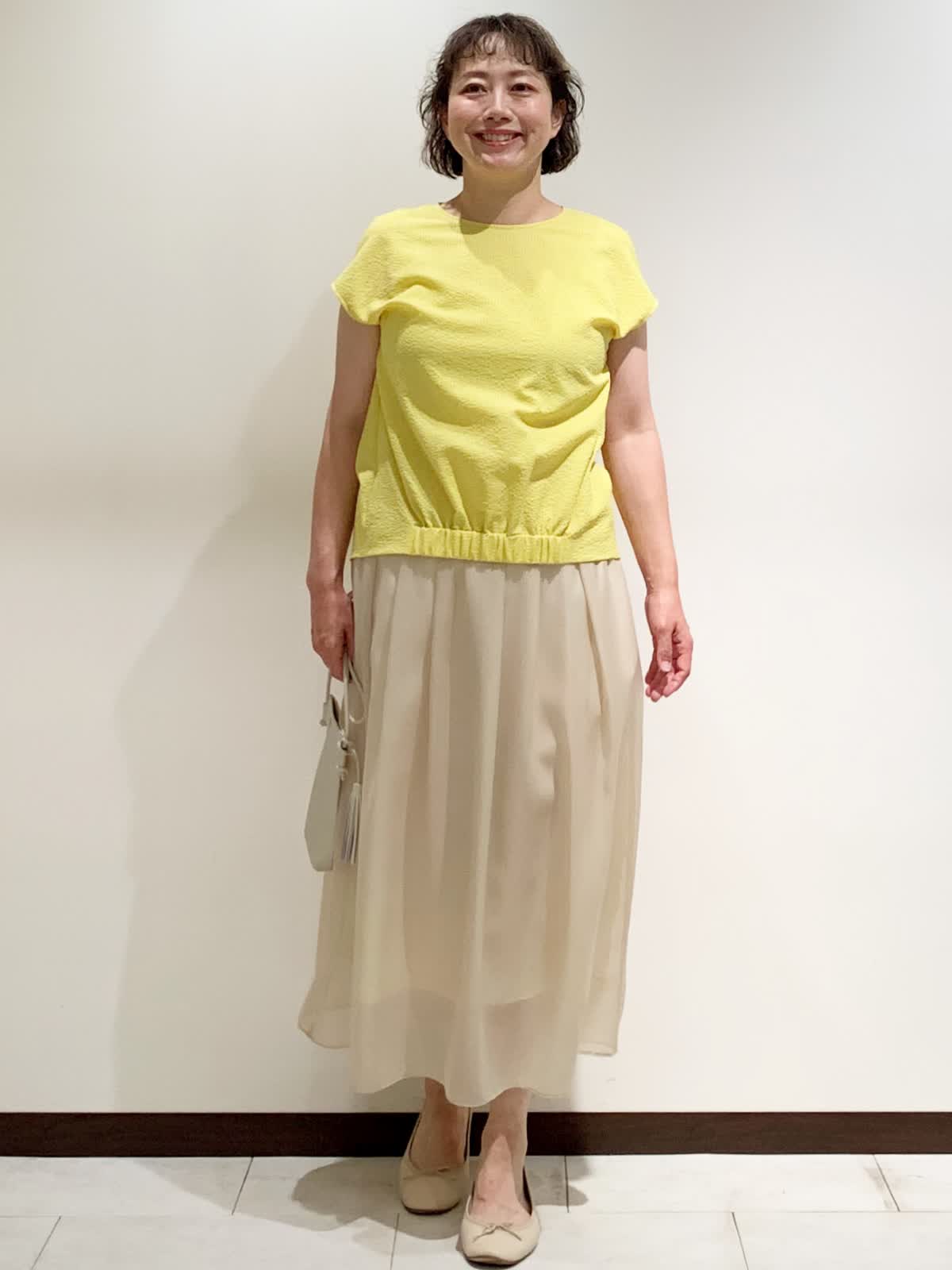 【着用サイズ】全て9号サイズ 【着用カラー】トップス:イエロー スカート:ベージュ バッグ:オフホワイト 吸水速乾性があるので汗をかくこ時期にサラッと着られます。ストレッチ性にも優れているので着心地もとても良いです。清涼感のあるスカートを合わせた軽やかな装いです。