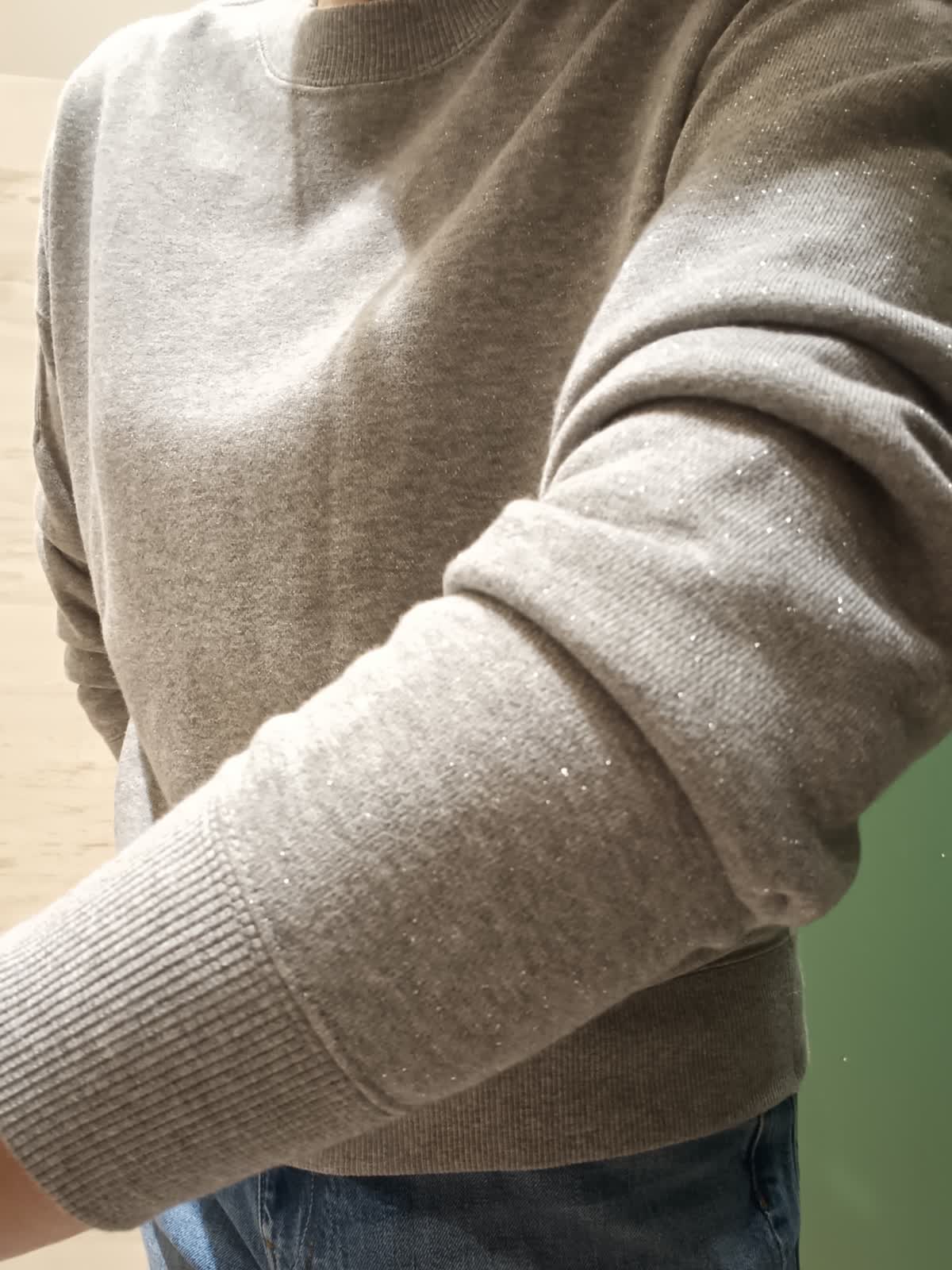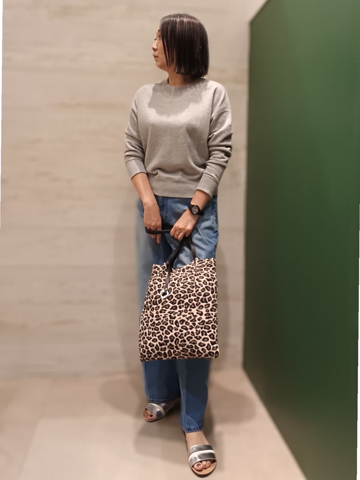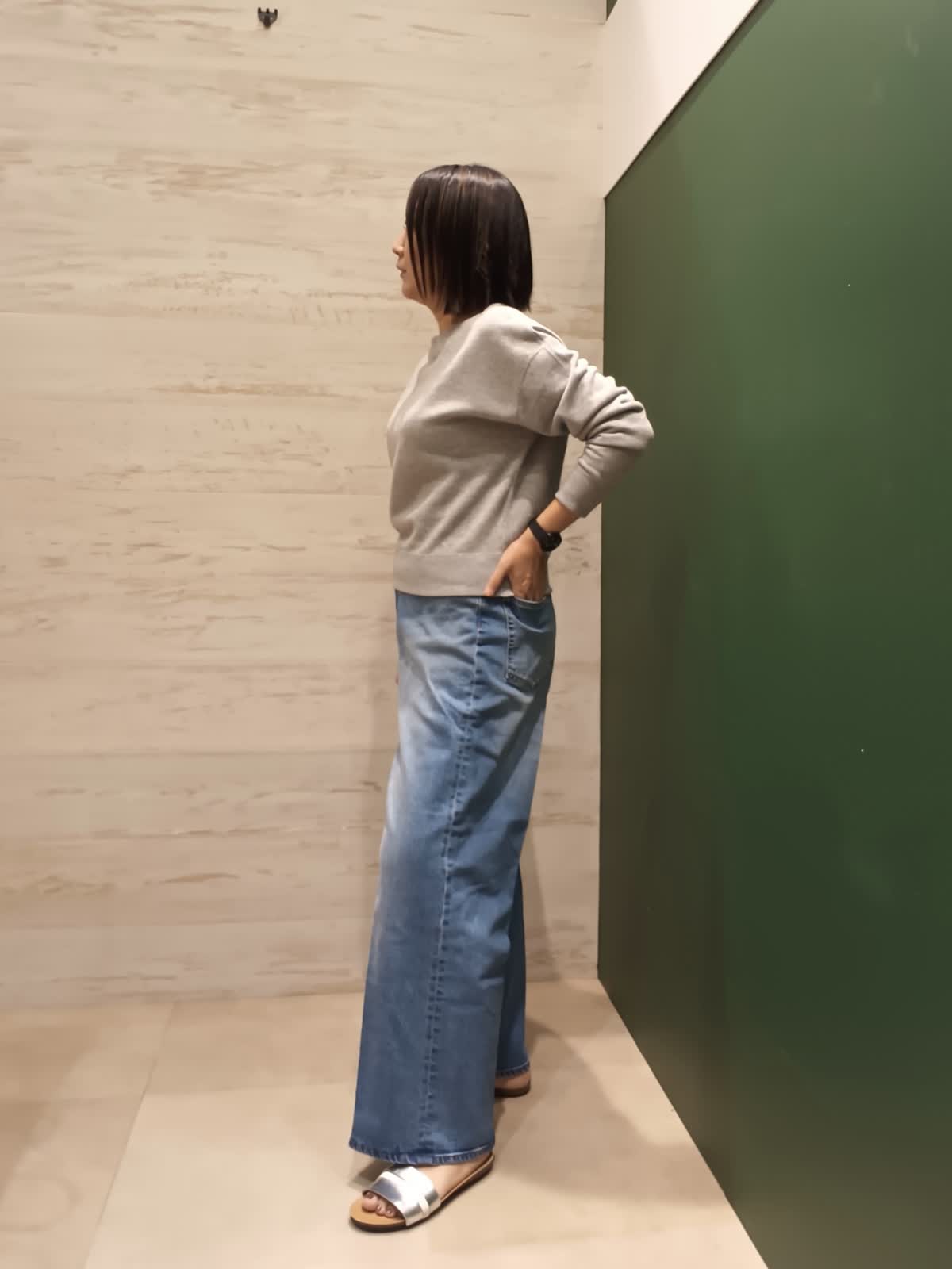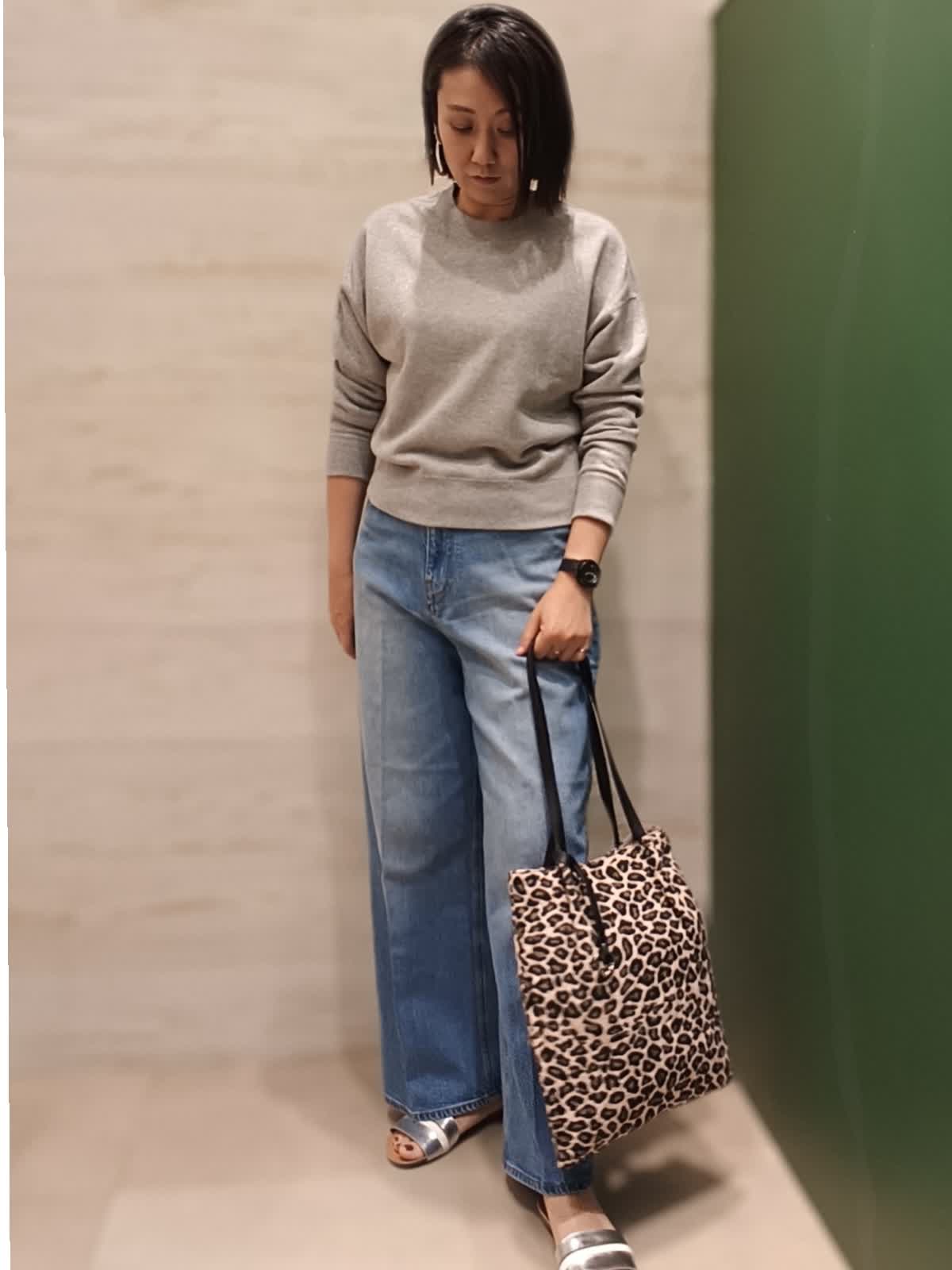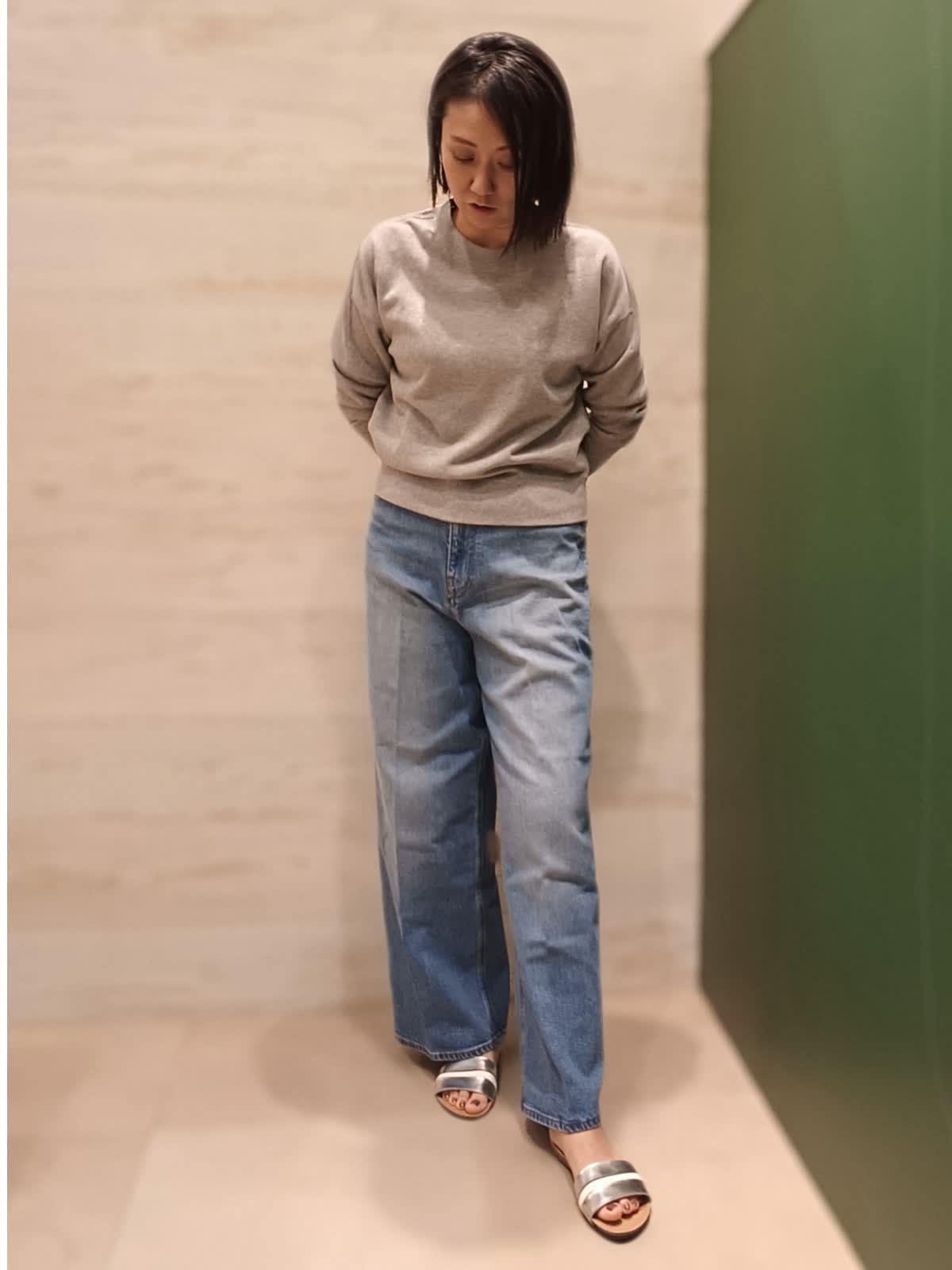 【着用カラー】カットソー:グレー パンツ:ブルー 【着用サイズ】カットソー:9号 パンツ11号 ボリュームの出すぎないラメ入りスウェットは大人カジュアルで着回し力が期待大。ワイドデニムでバランス良く、センタープレス入りでキレイめに着てみました。