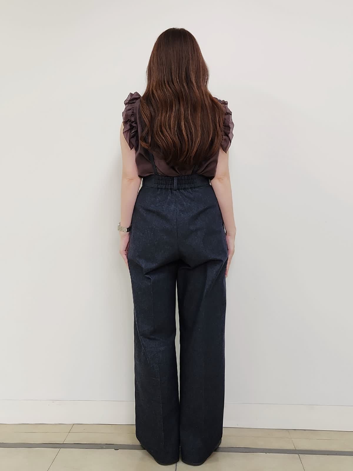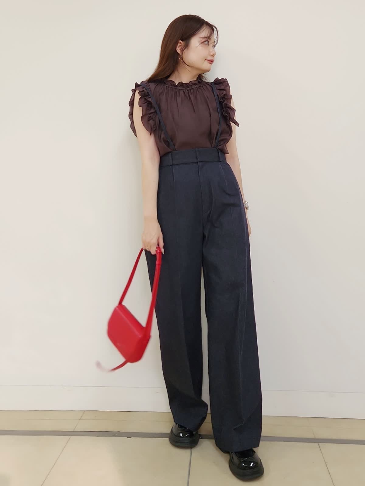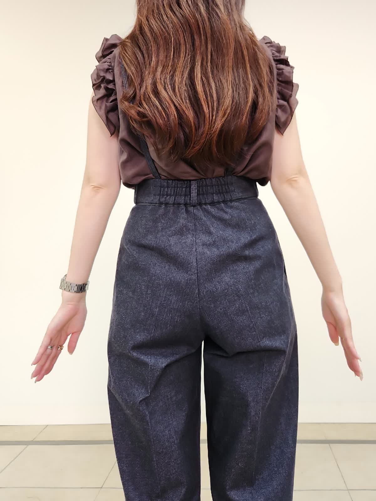 【着用サイズ】ブラウス:9号/ダークブラウン パンツ:11号/インディゴ 雑誌「美人百花」掲載中のサスペンダーデニムパンツ。ハイウエストで美脚効果抜群♪ヒップや太もも周りはゆとりありますが、ウエストはジャストでハイウエストなので通常より1サイズUPの11号サイズを選びました。着丈もMaglieのパンツの中でもやや長めの方なので厚底やヒールを履かない方は丈詰め必須です。