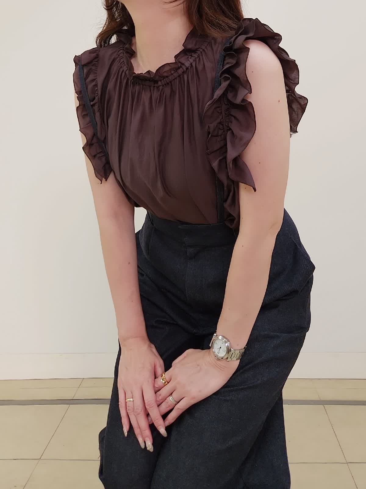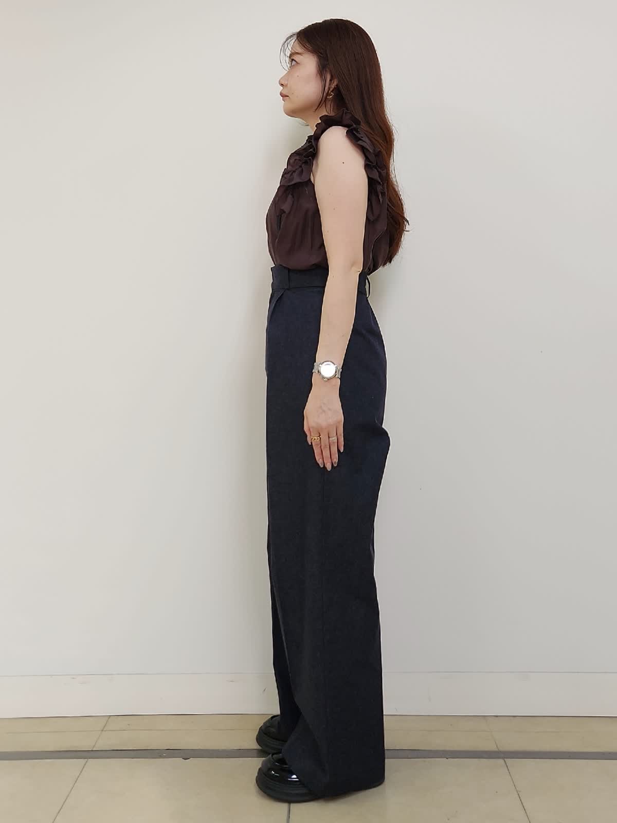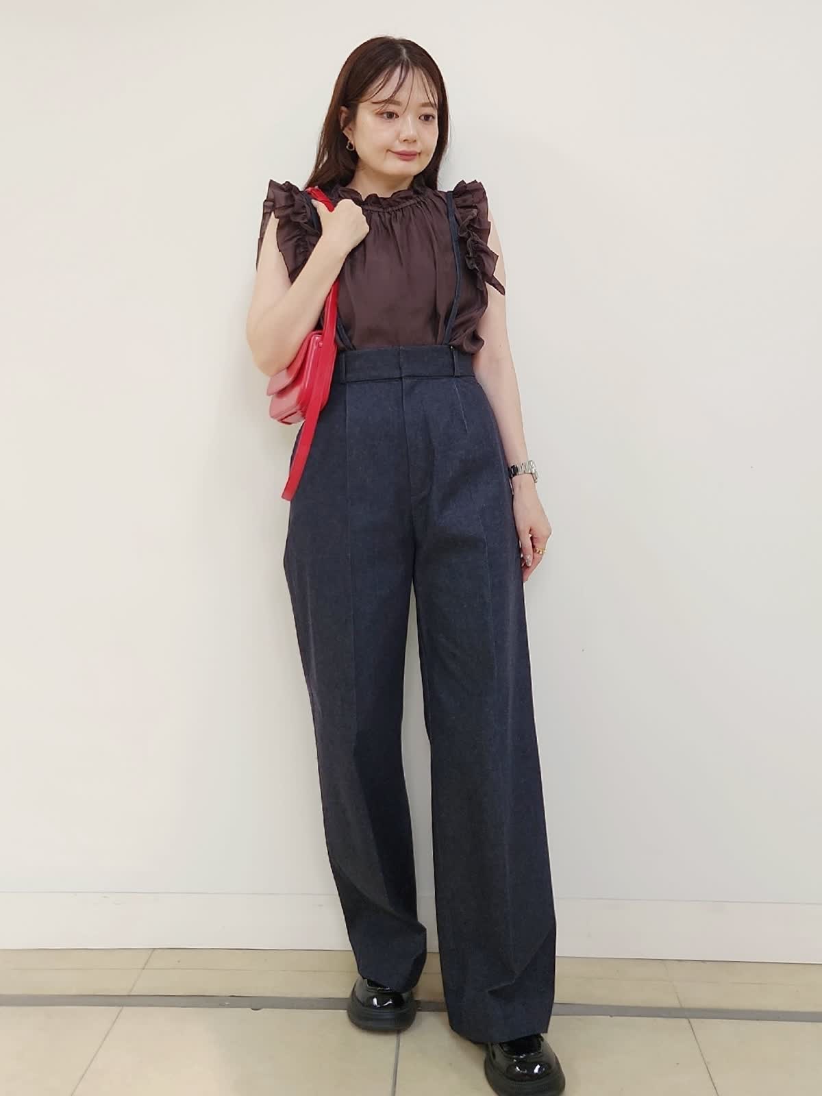 【着用サイズ】ブラウス:9号/ダークブラウン パンツ:11号/インディゴ 雑誌「美人百花」掲載中のサスペンダーデニムパンツ。ハイウエストで美脚効果抜群♪ヒップや太もも周りはゆとりありますが、ウエストはジャストでハイウエストなので通常より1サイズUPの11号サイズを選びました。着丈もMaglieのパンツの中でもやや長めの方なので厚底やヒールを履かない方は丈詰め必須です。
