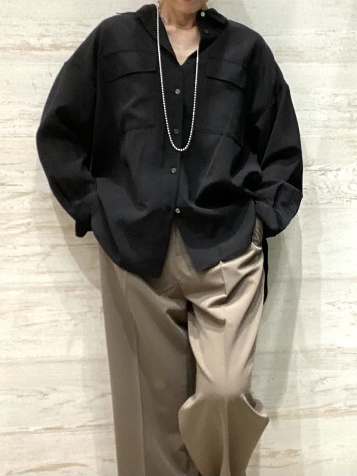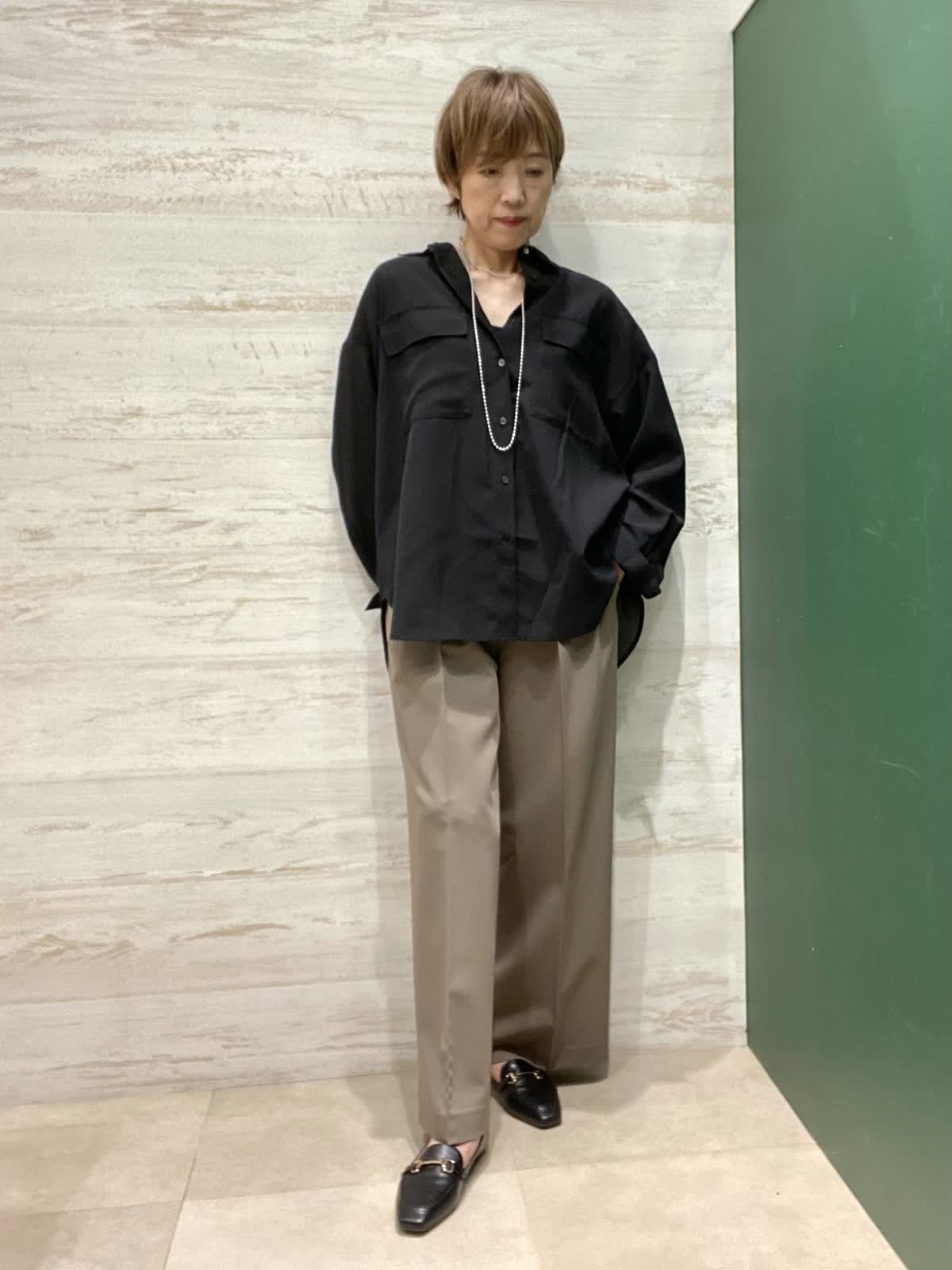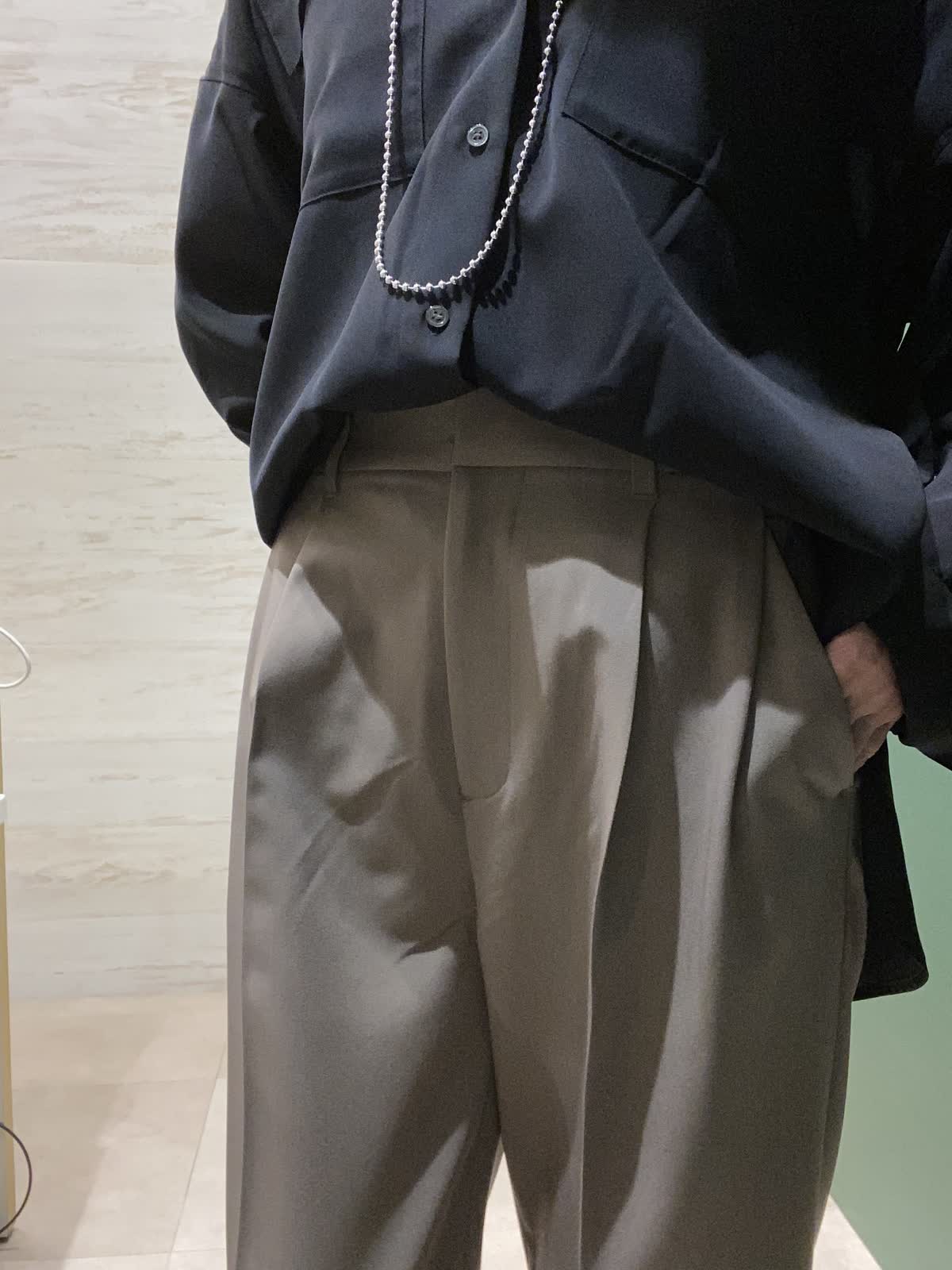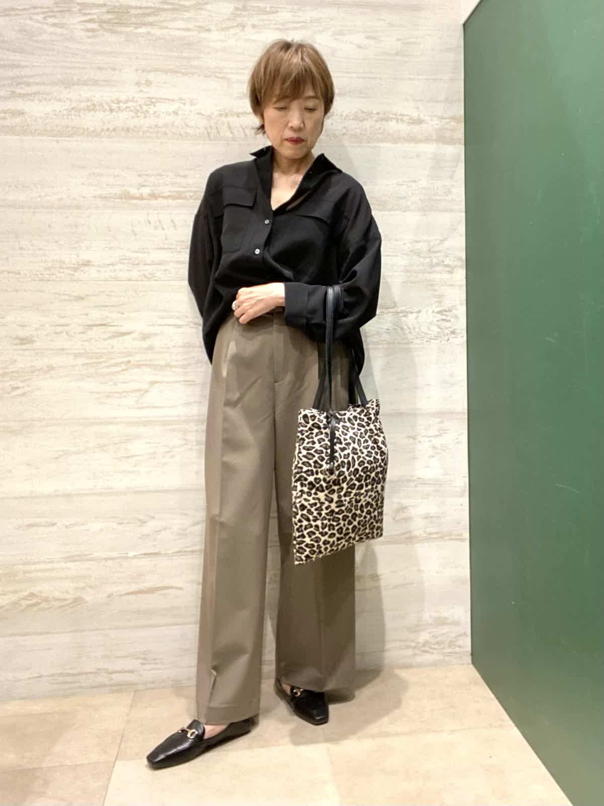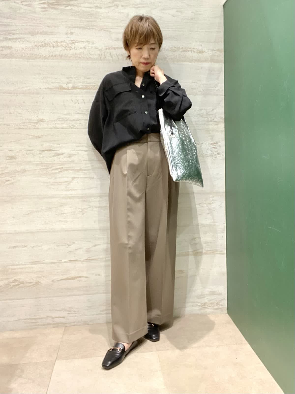 【着用カラー】ブラウス:ブラック パンツ:モカチャ バッグ:シルバー 【着用サイズ】ブラウス:9号 パンツ:9号 サラッとした履き心地の2タックワイドパンツ(アジャスター付きでsize調節可能)オーバーシアーシャツを合わせてリラックス感のあるキレイめスタイリング。